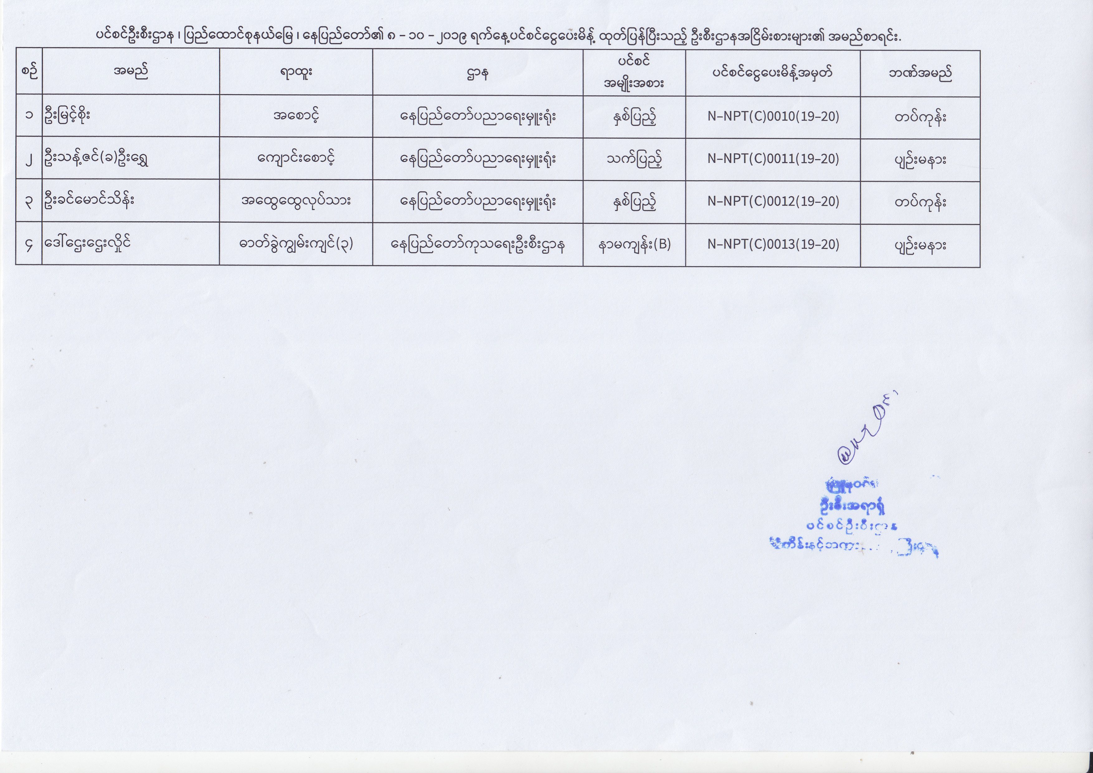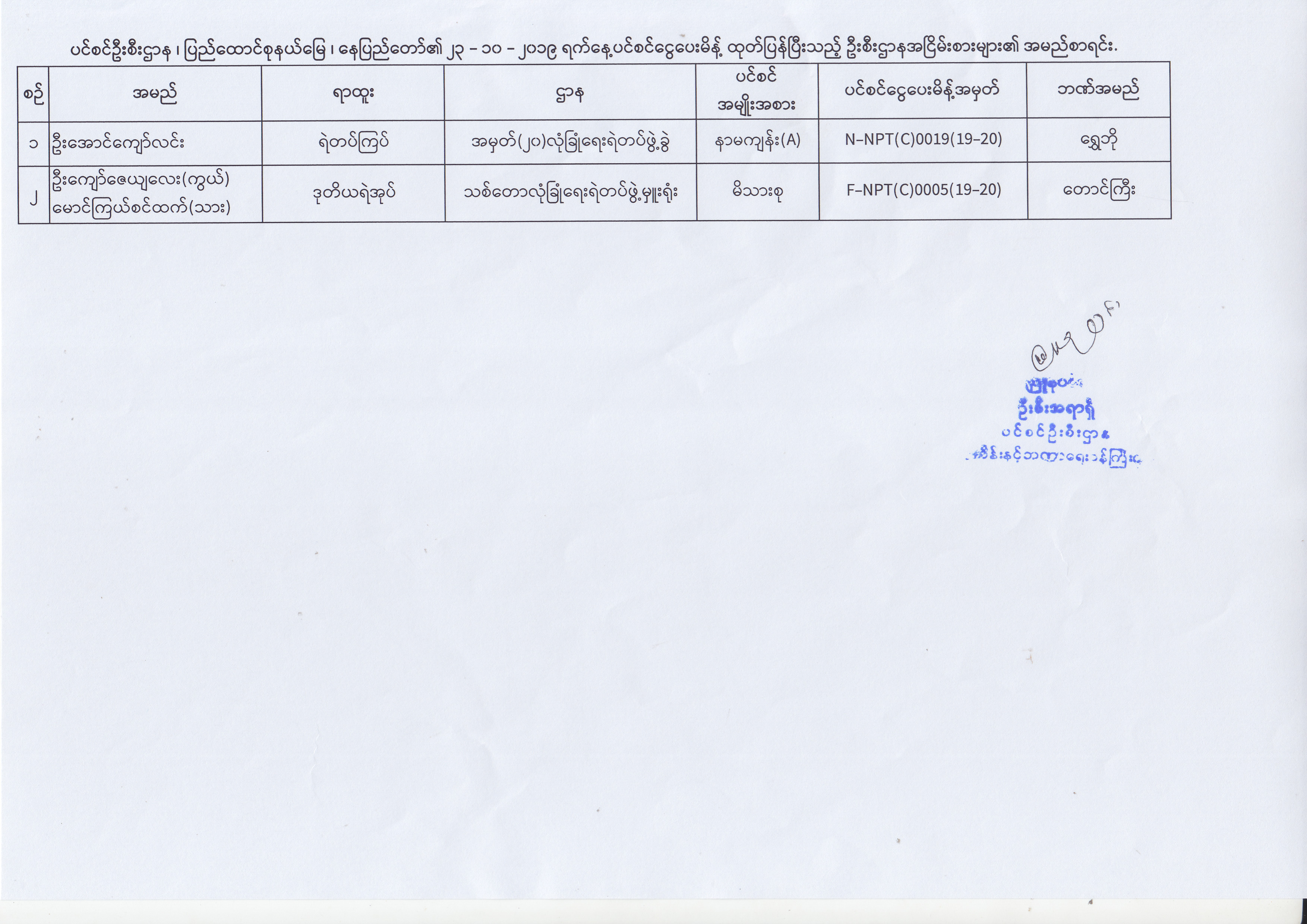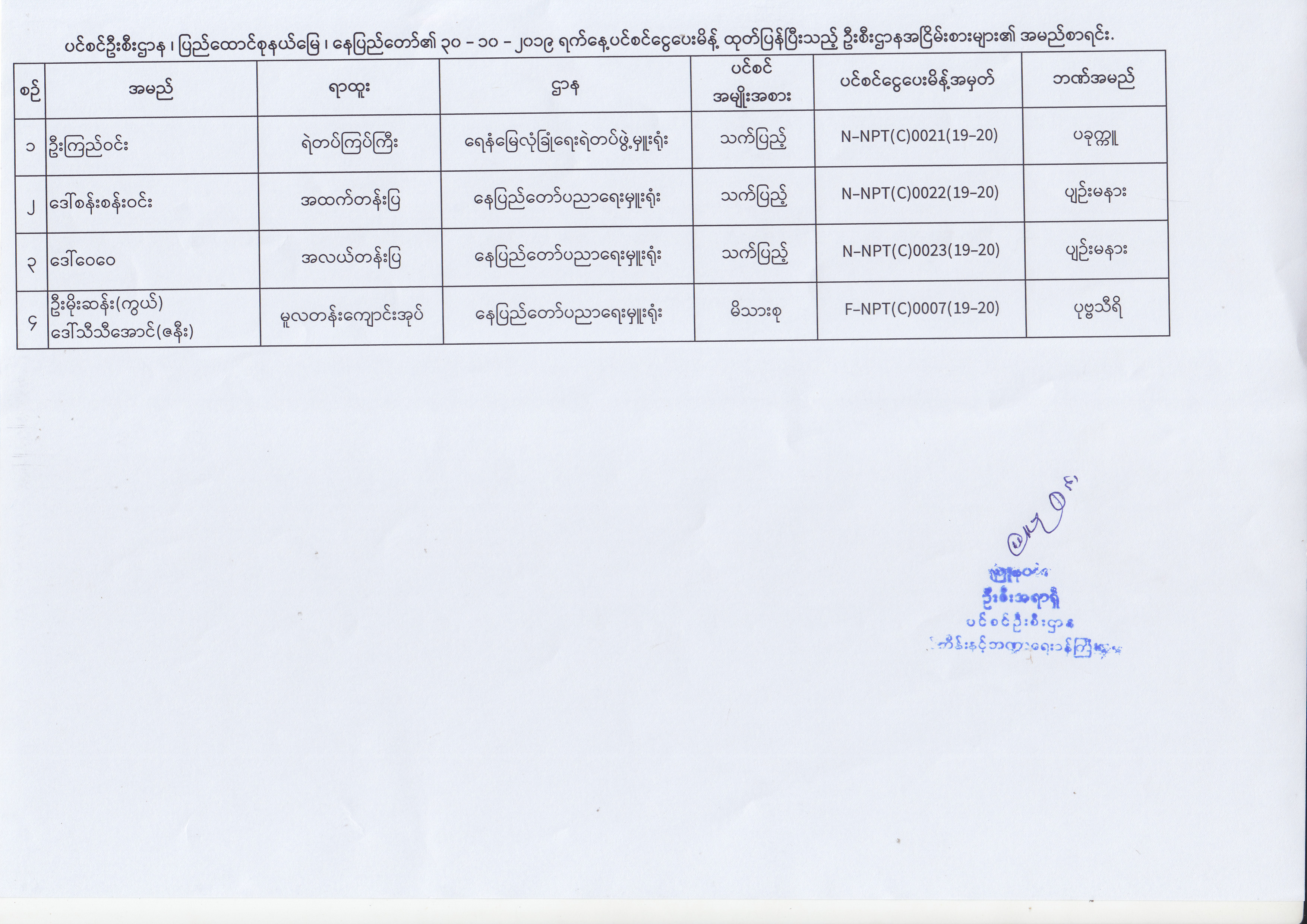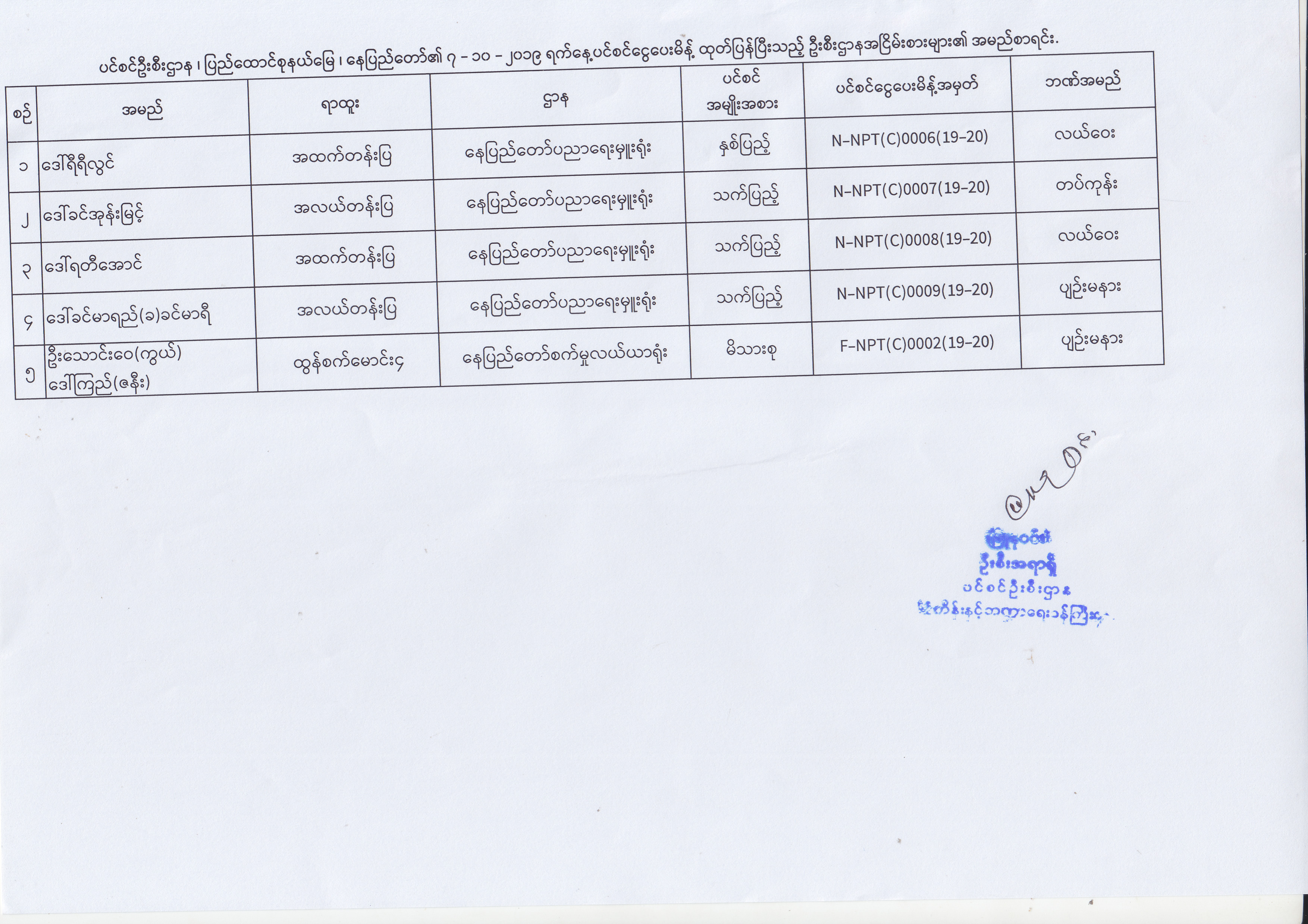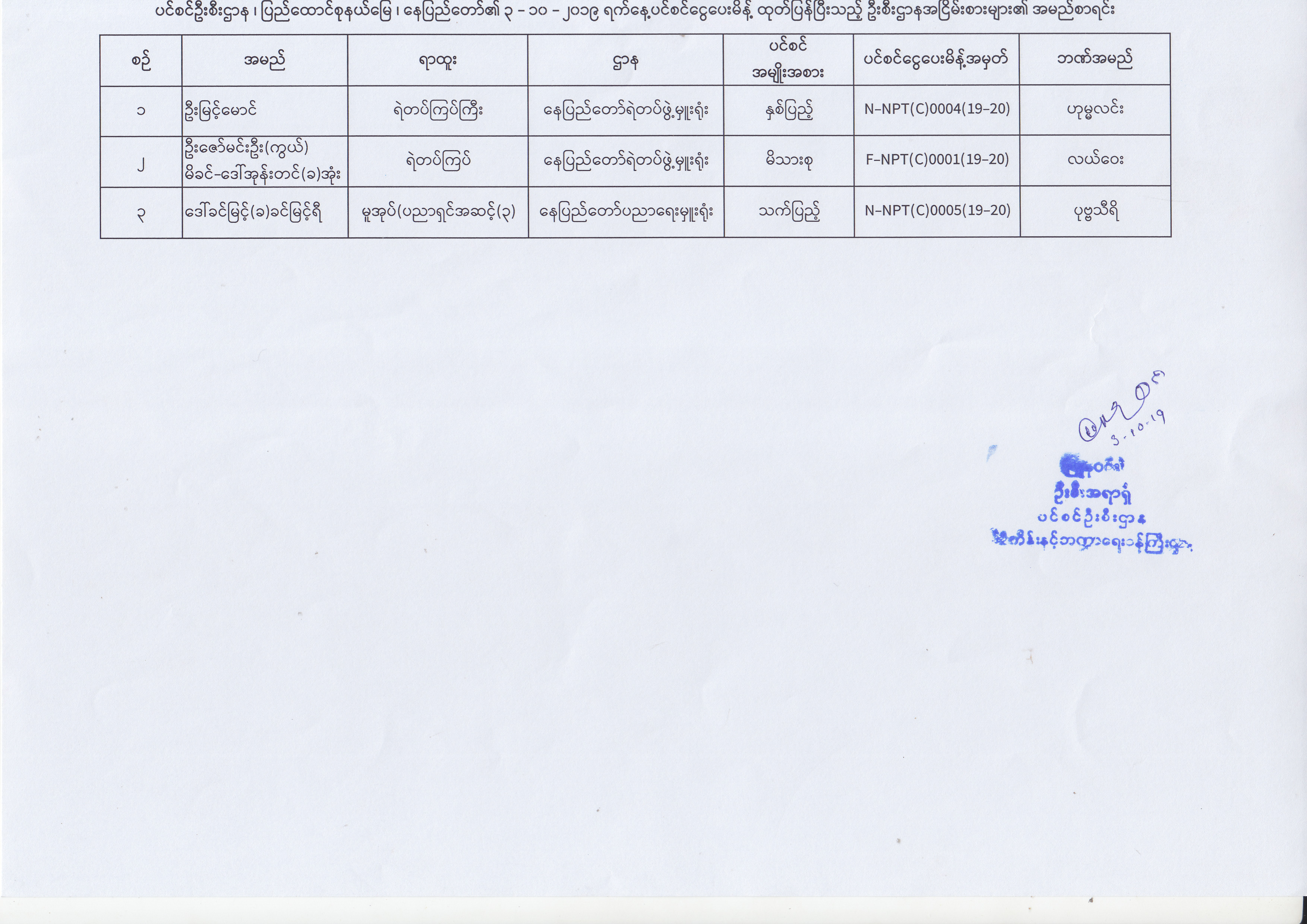 ပင်စင်ဦးစီးဌာန၊ နေပြည်တော်ကောင်စီနယ်မြေ၏ (၂.၁၀.၂၀၁၉) မှ (၃၁.၁၀.၂၀၁၉) ရက်နေ့အထိ ပင်စင်ငွေပေးမိန့်ထုတ်ပြန်ပြီးသည့် ဦးစီးဌာန အငြိမ်းစားများ၏ အမည်စာရင်း