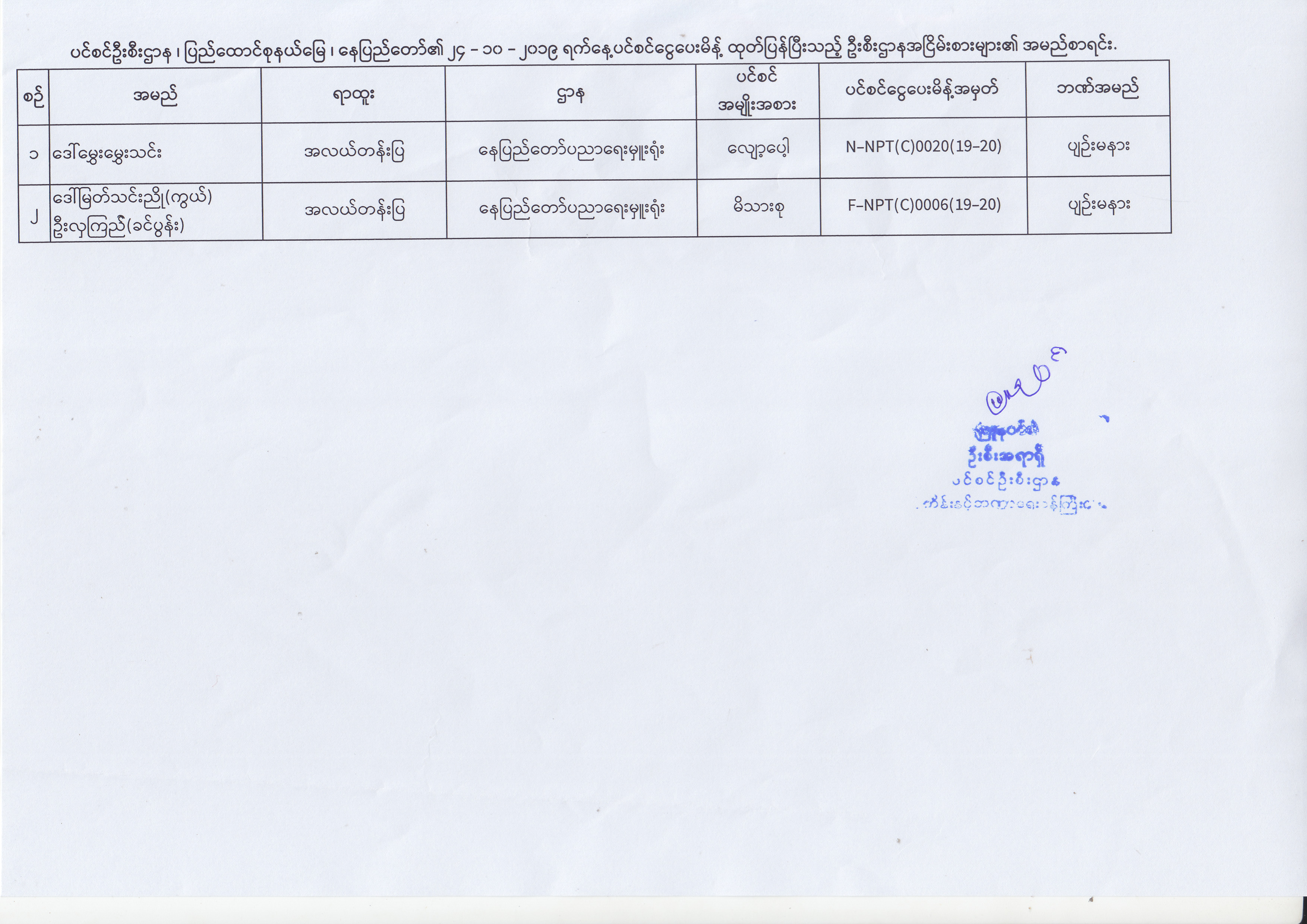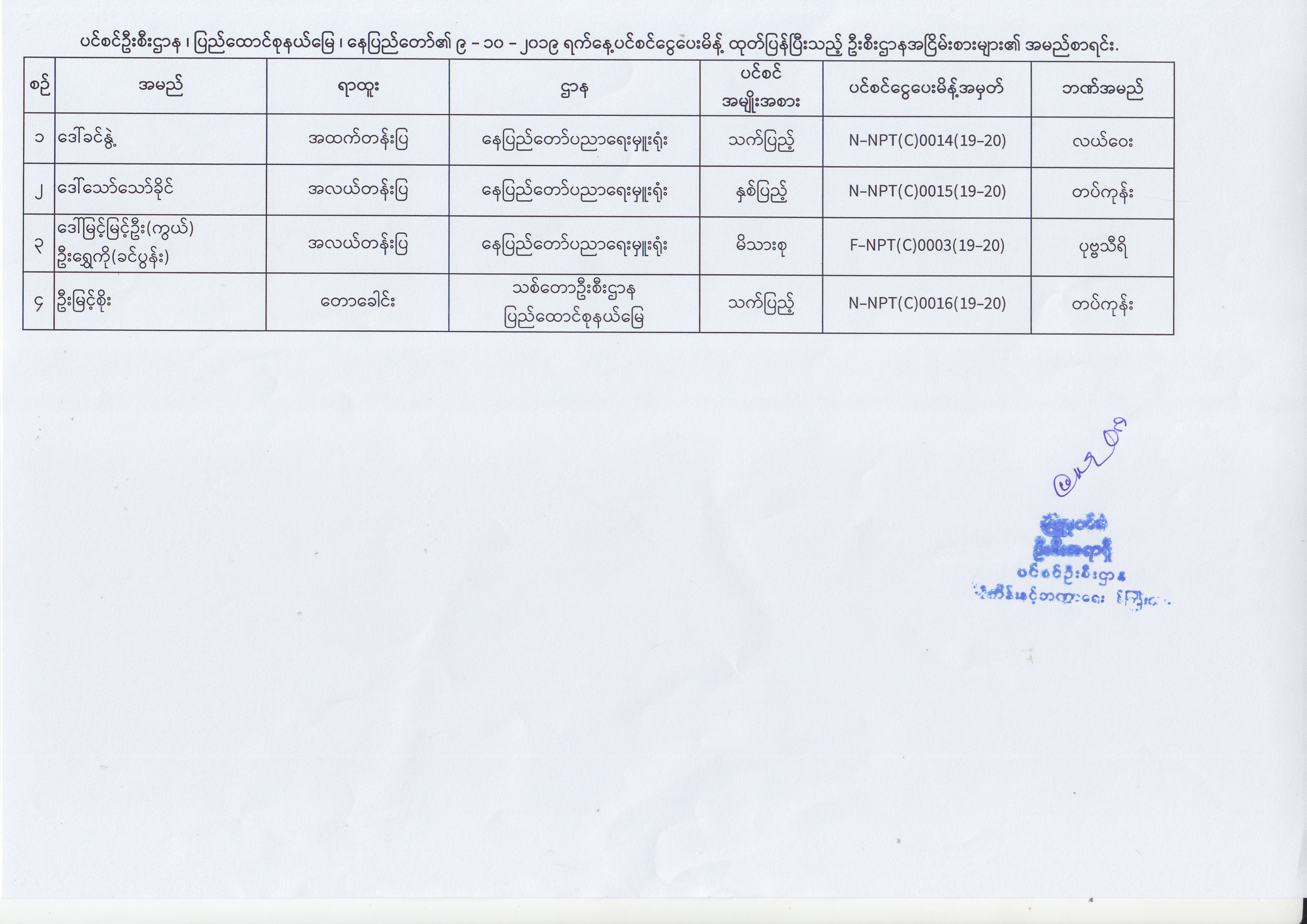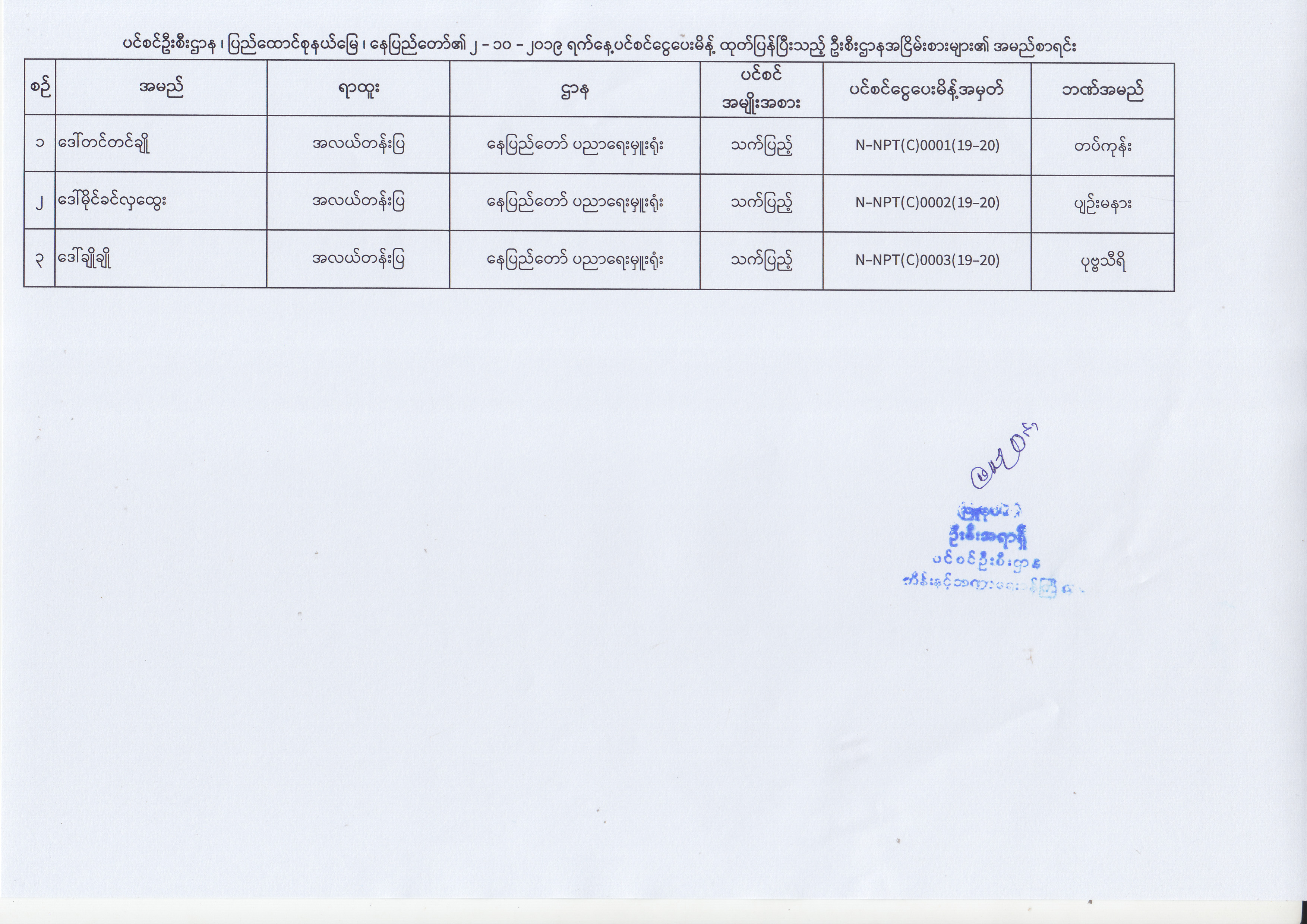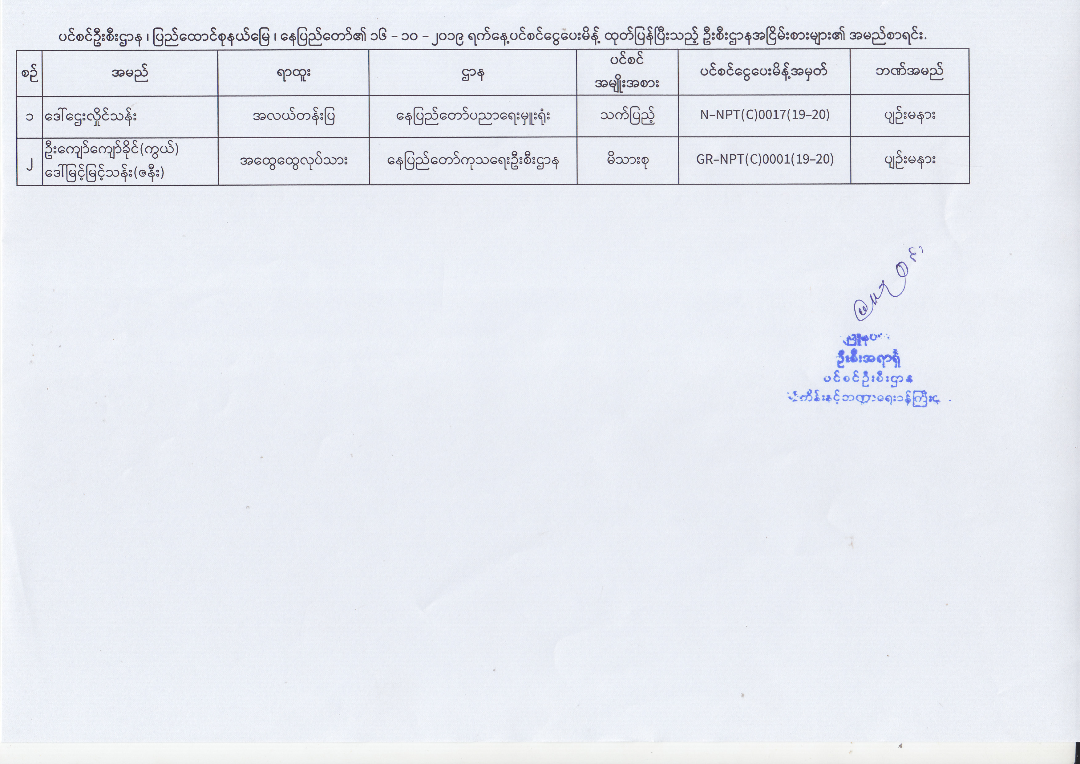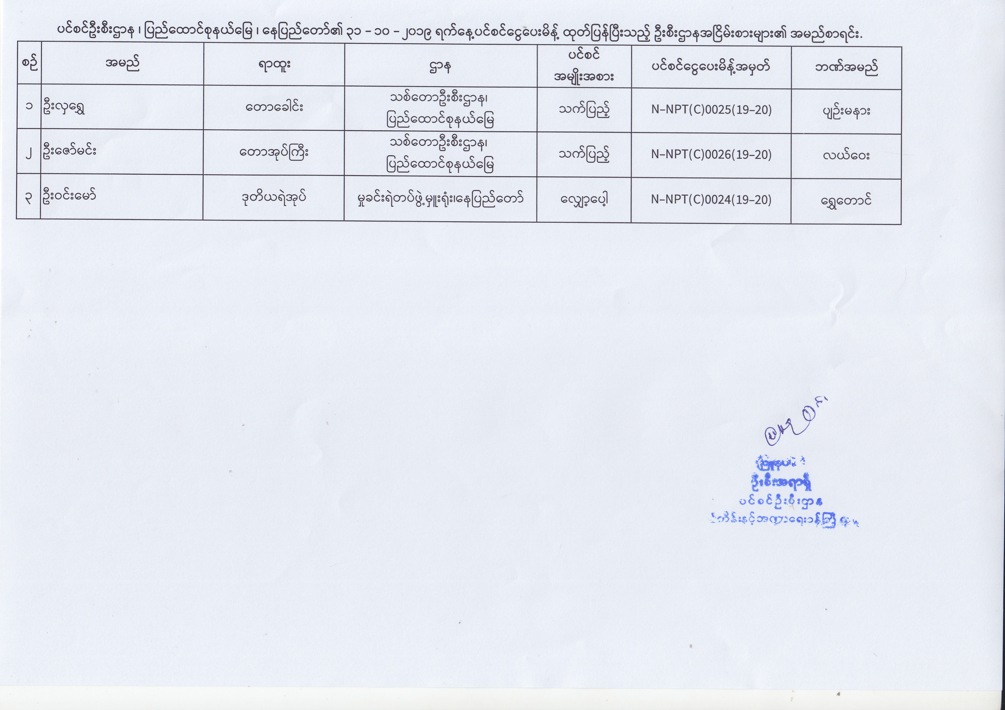 ပင်စင်ဦးစီးဌာန၊ နေပြည်တော်ကောင်စီနယ်မြေ၏ (၂.၁၀.၂၀၁၉) မှ (၃၁.၁၀.၂၀၁၉) ရက်နေ့အထိ ပင်စင်ငွေပေးမိန့်ထုတ်ပြန်ပြီးသည့် ဦးစီးဌာန အငြိမ်းစားများ၏ အမည်စာရင်း