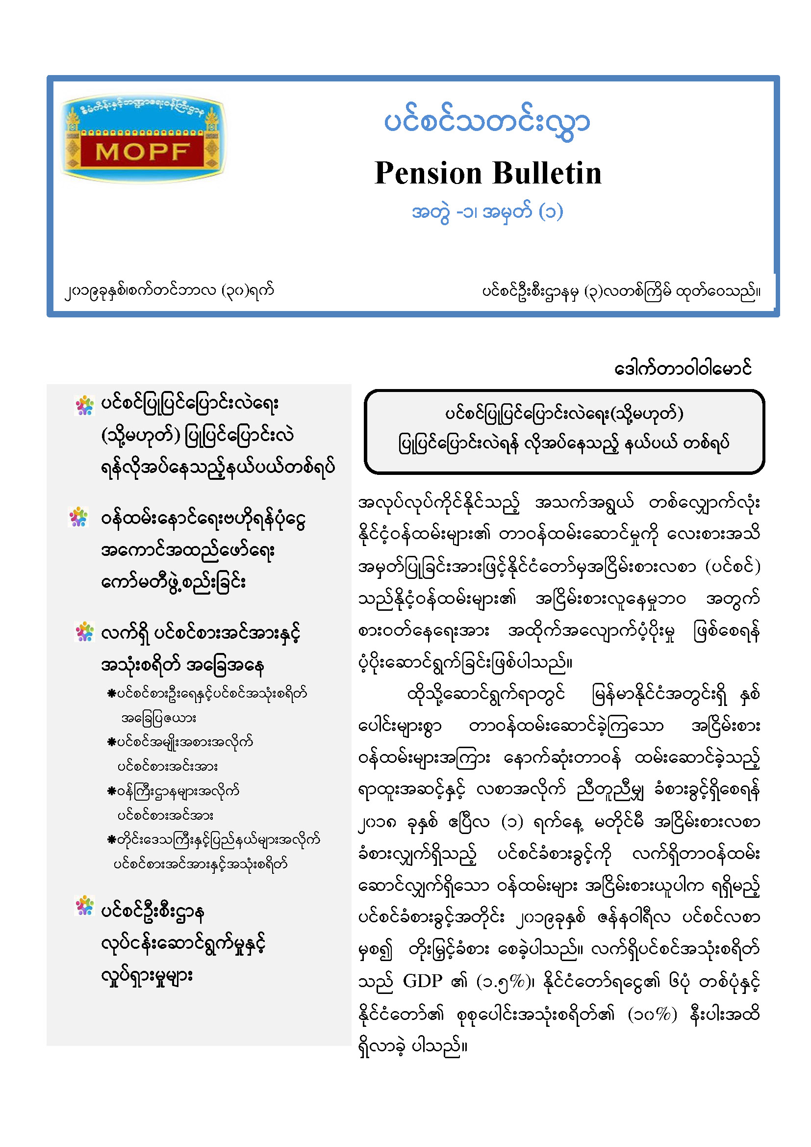 ပင်စင်သတင်းလွှာ Pension Bulletin အတွဲ -၁၊ အမှတ် (၁) ၂၀၁၉ခုနှစ်၊စက်တင်ဘာလ (၃၀)ရက် ပင်စင်ဦးစီးဌာနမှ (၃)လတစ်ကြိမ် ထုတ်ဝေသည်။ pension_editor Fri, 12/06/2019 - 10:40
