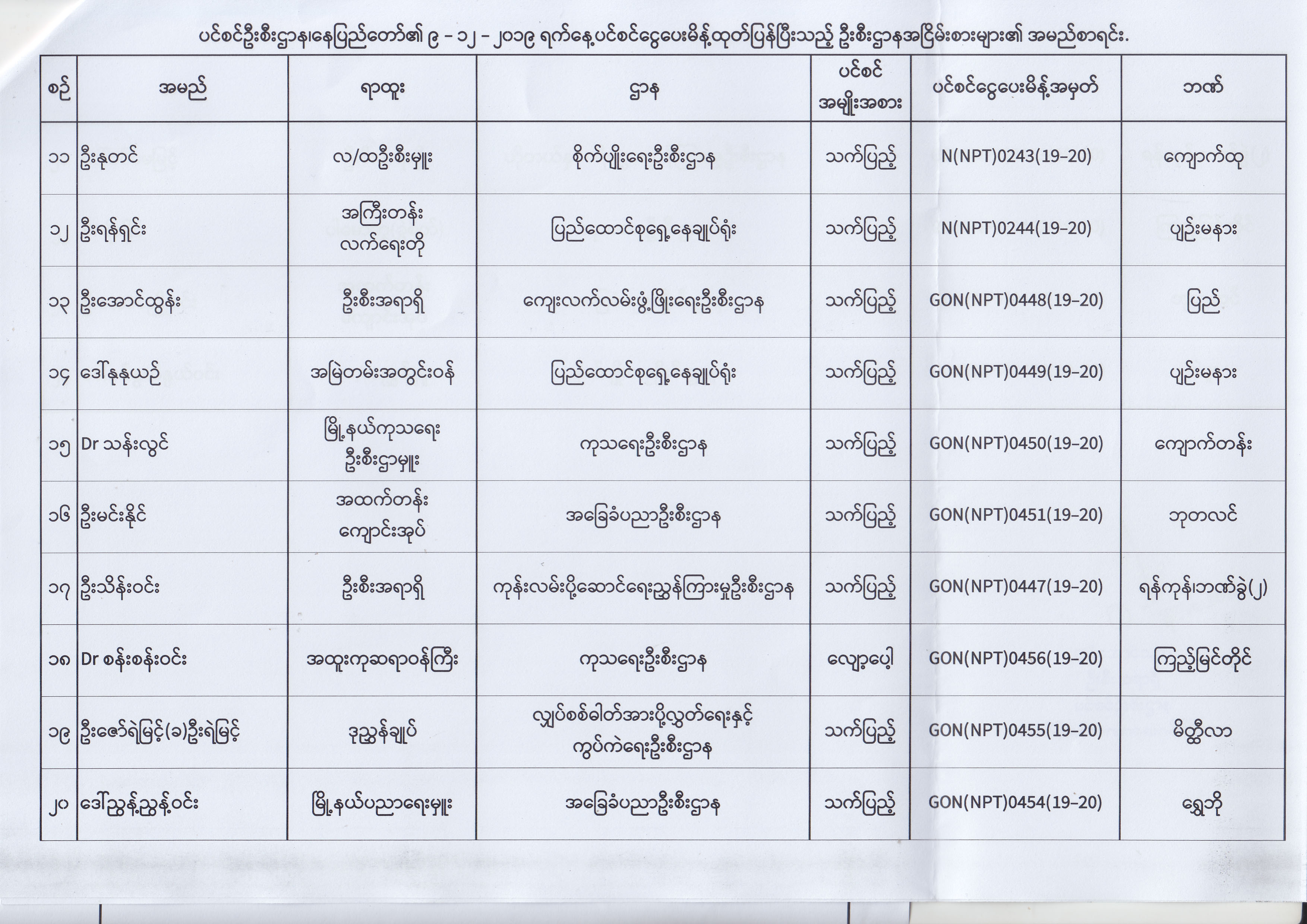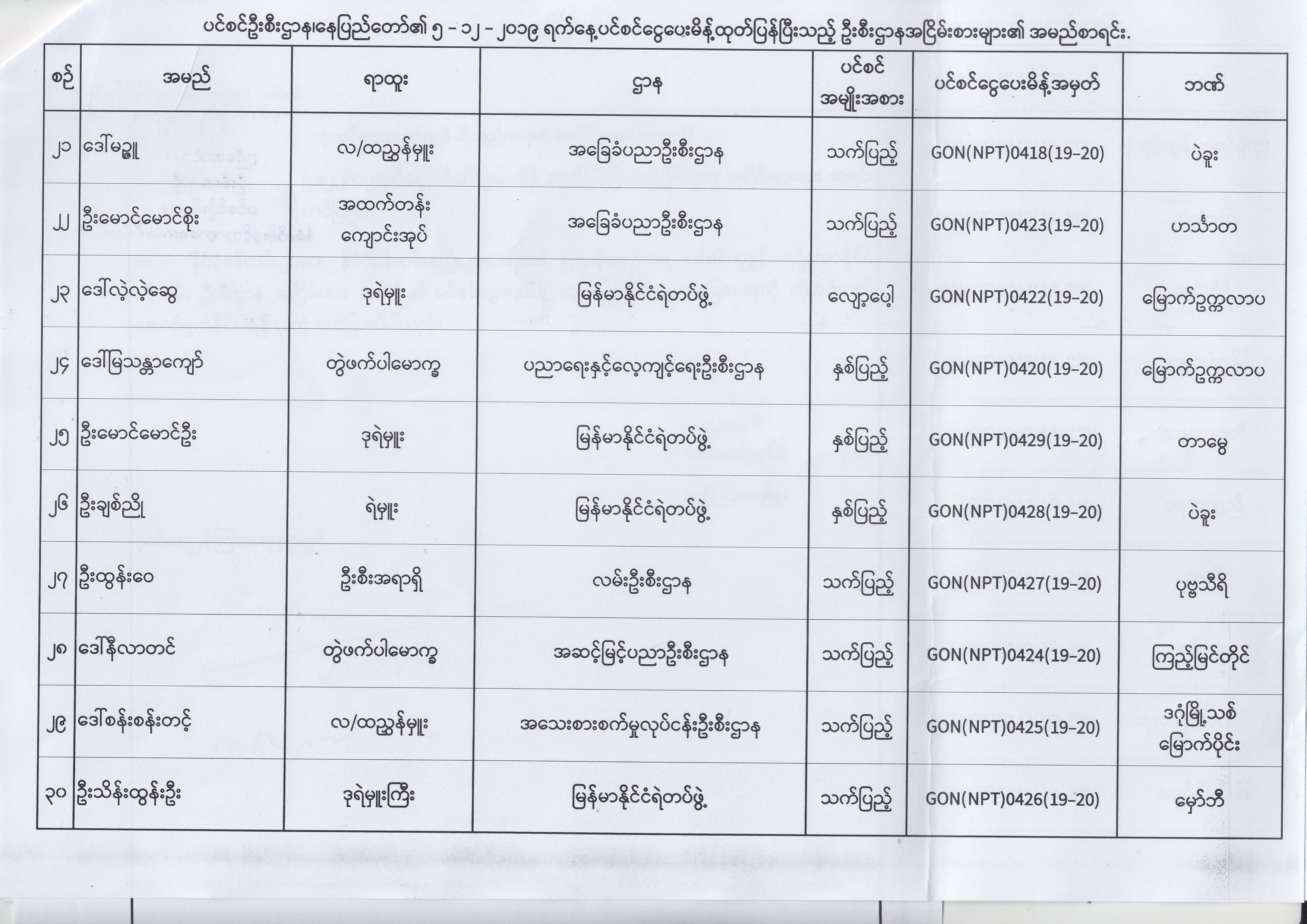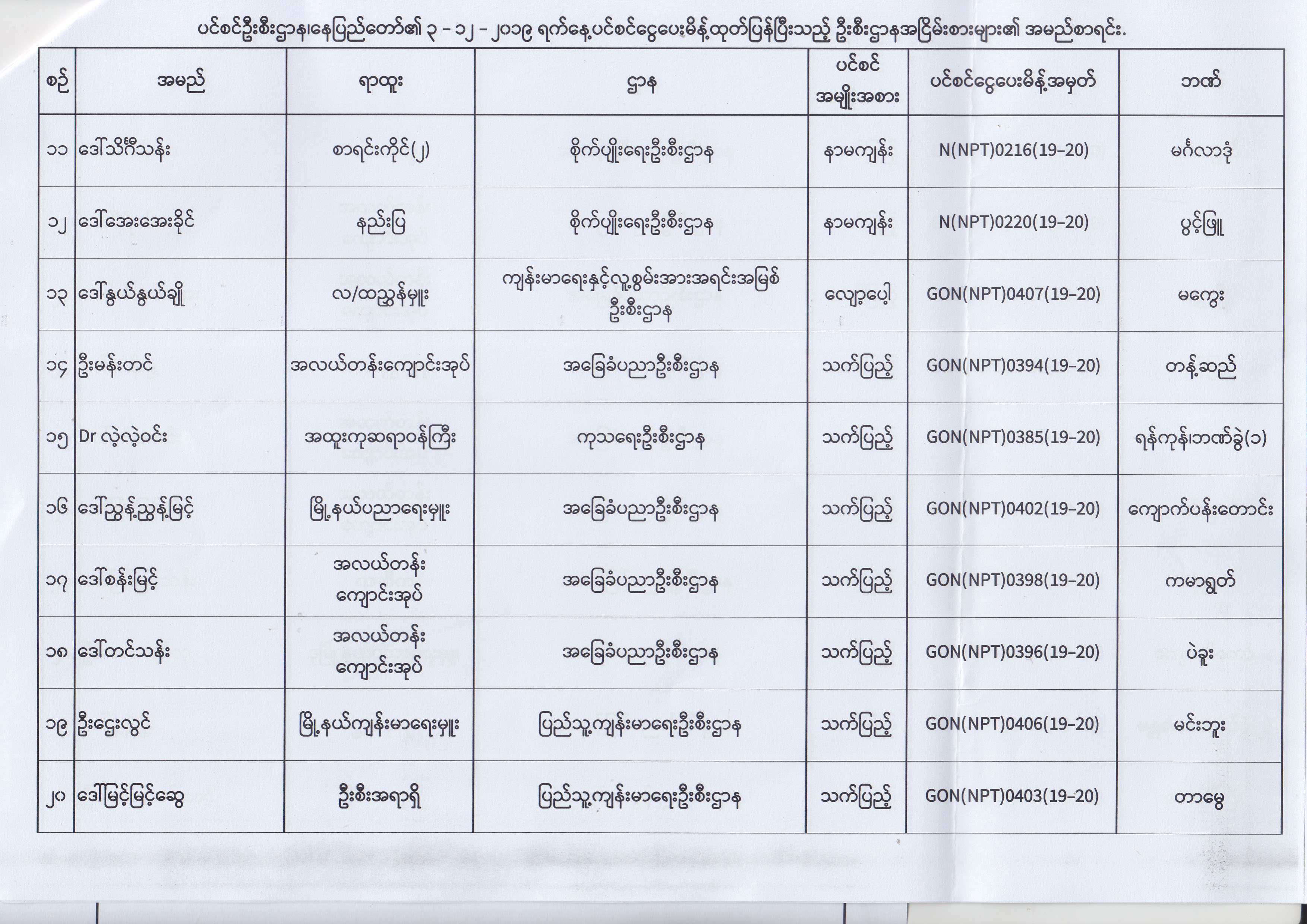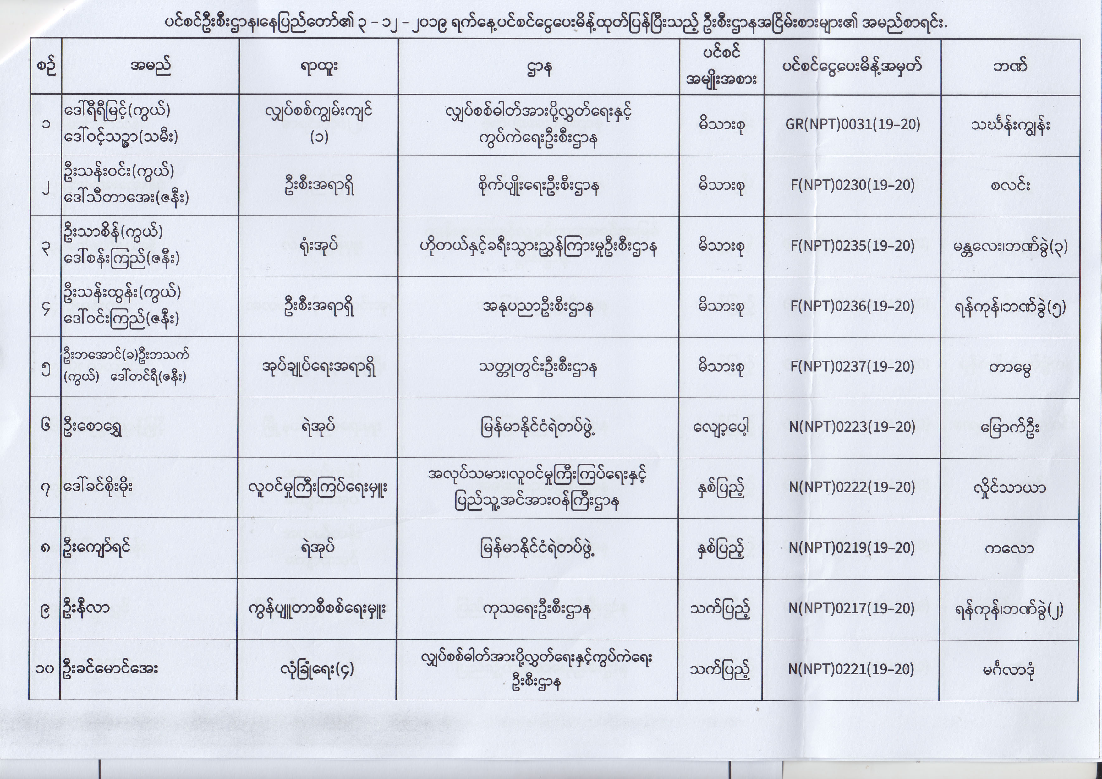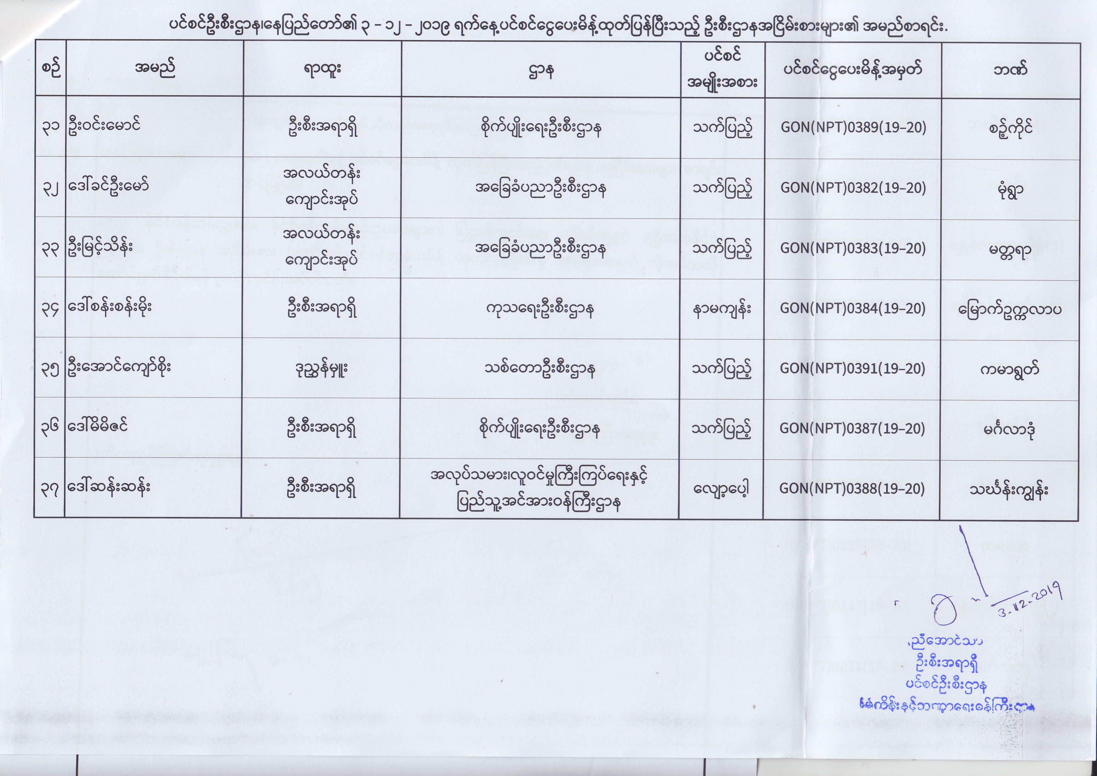 ပင်စင်ဦးစီးဌာန၊ နေပြည်တော်၏ (၂.၁၂.၂၀၁၉) မှ (၁၃.၁၂.၂၀၁၉) ရက်နေ့အထိ ပင်စင်ငွေပေးမိန့်ထုတ်ပြန်ပြီးသည့် ဦးစီးဌာနအငြိမ်းစားများ၏ အမည်စာရင်း pension_editor Wed, 12/18/2019 - 14:02