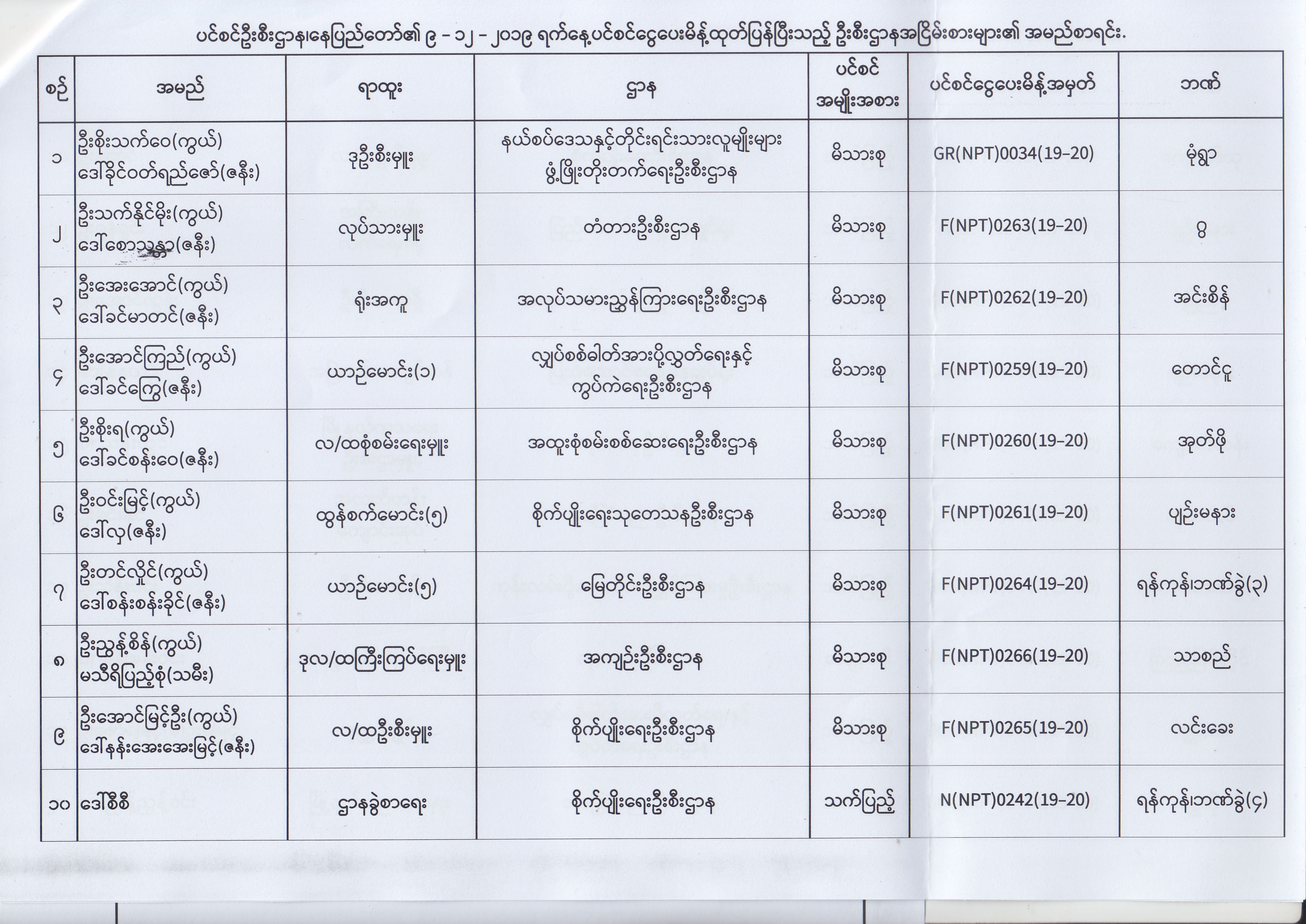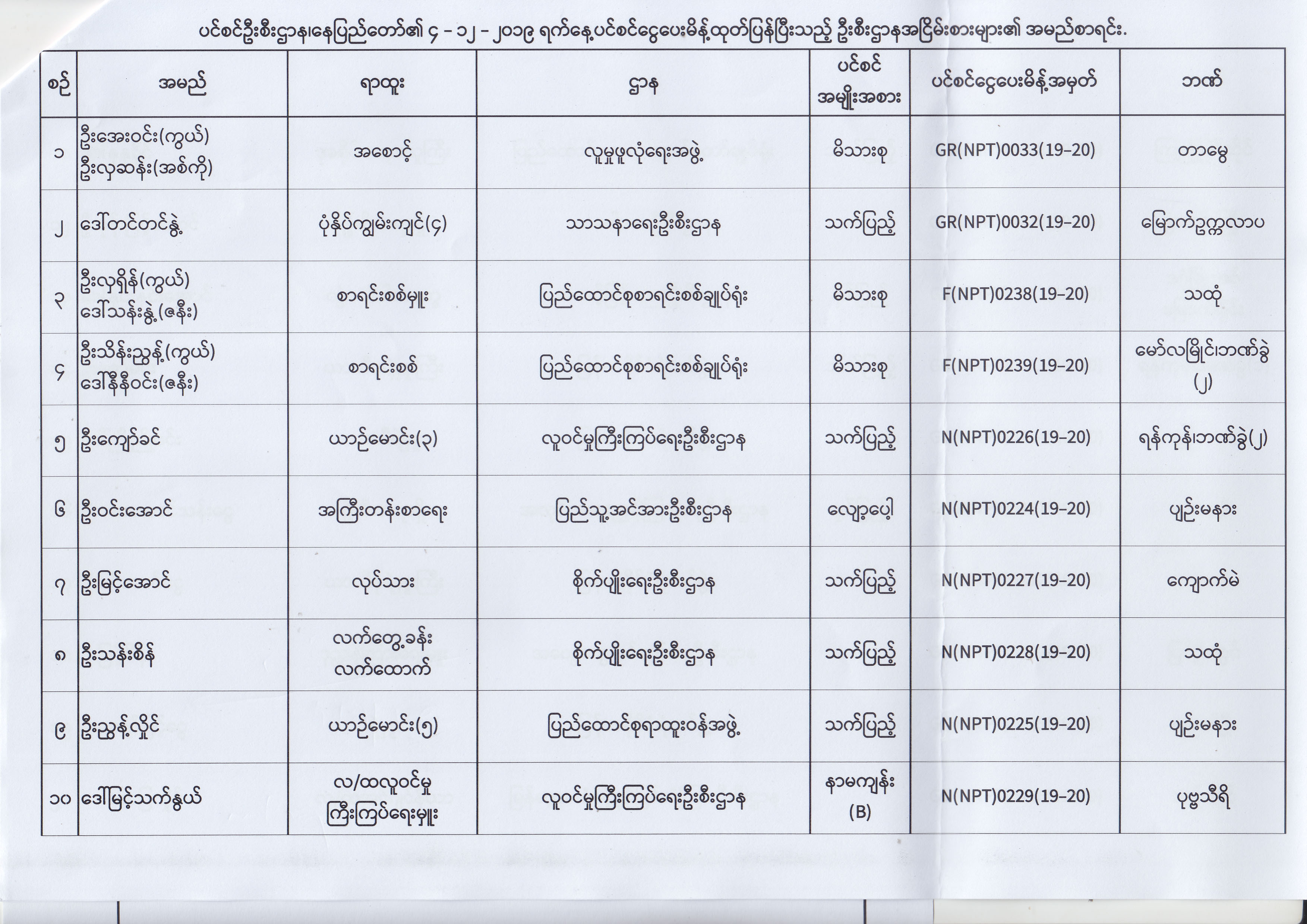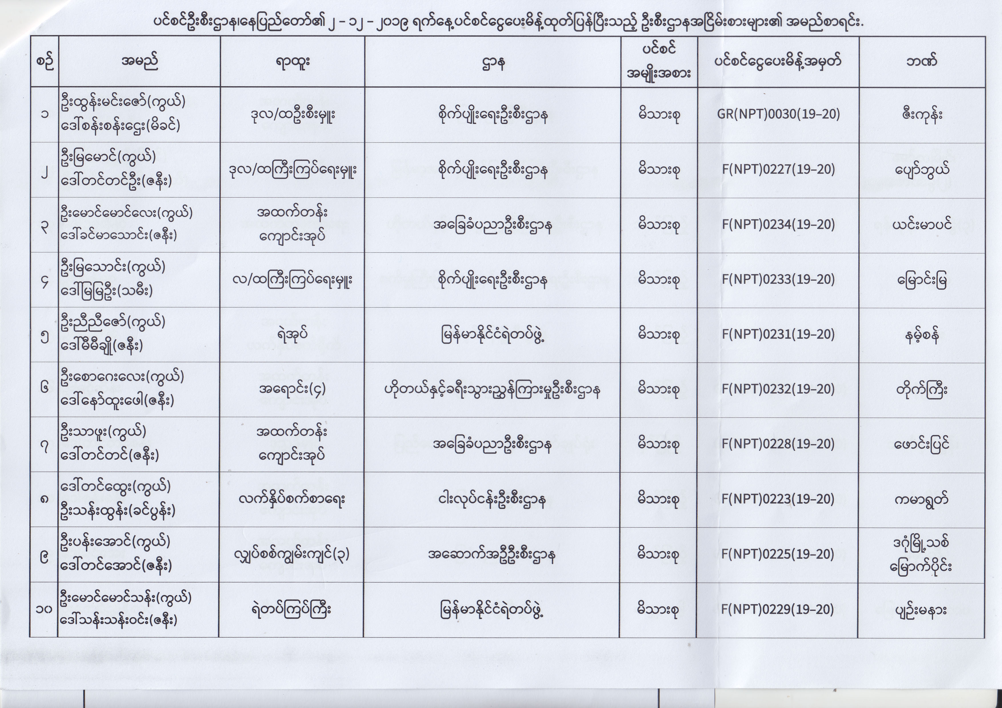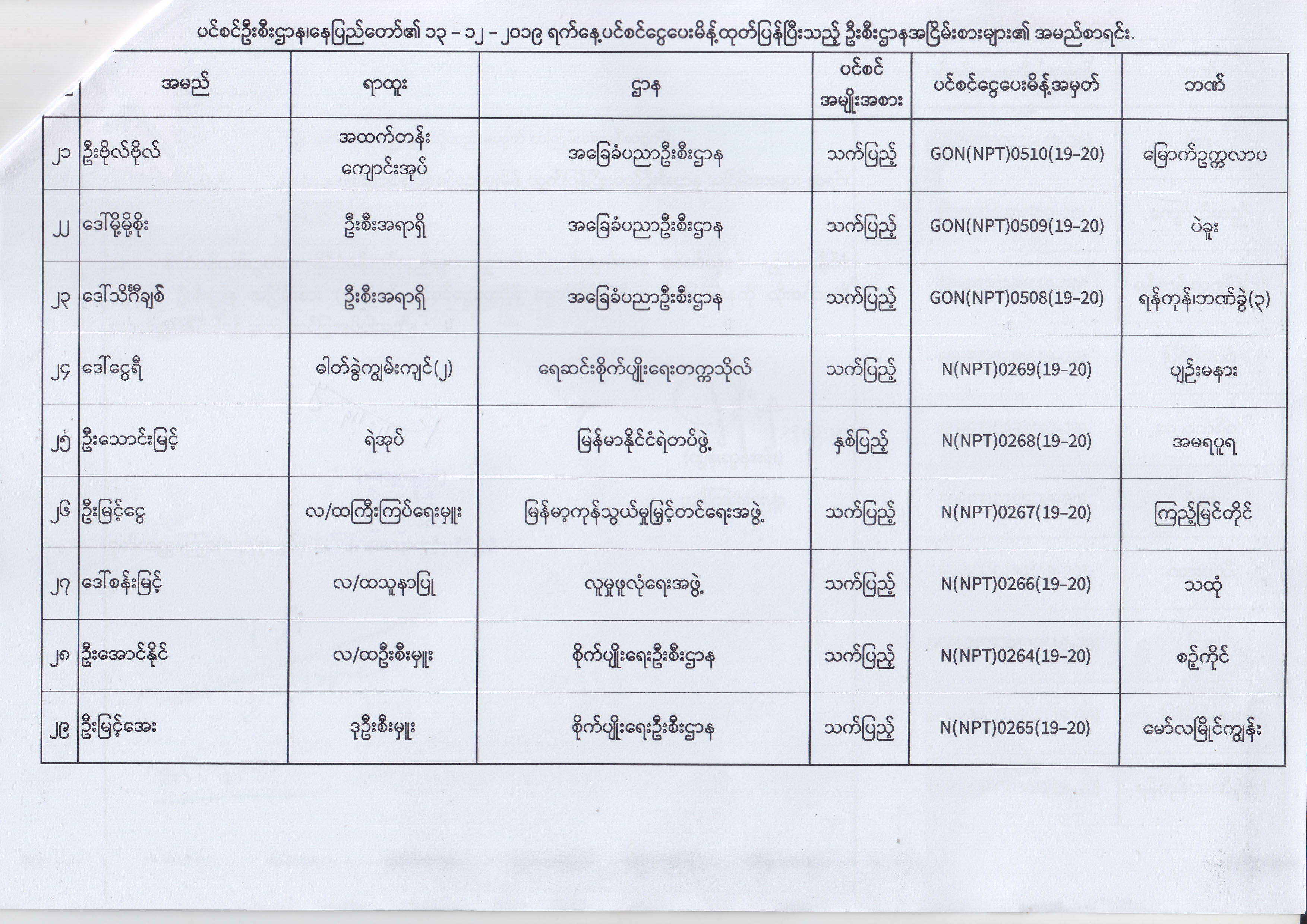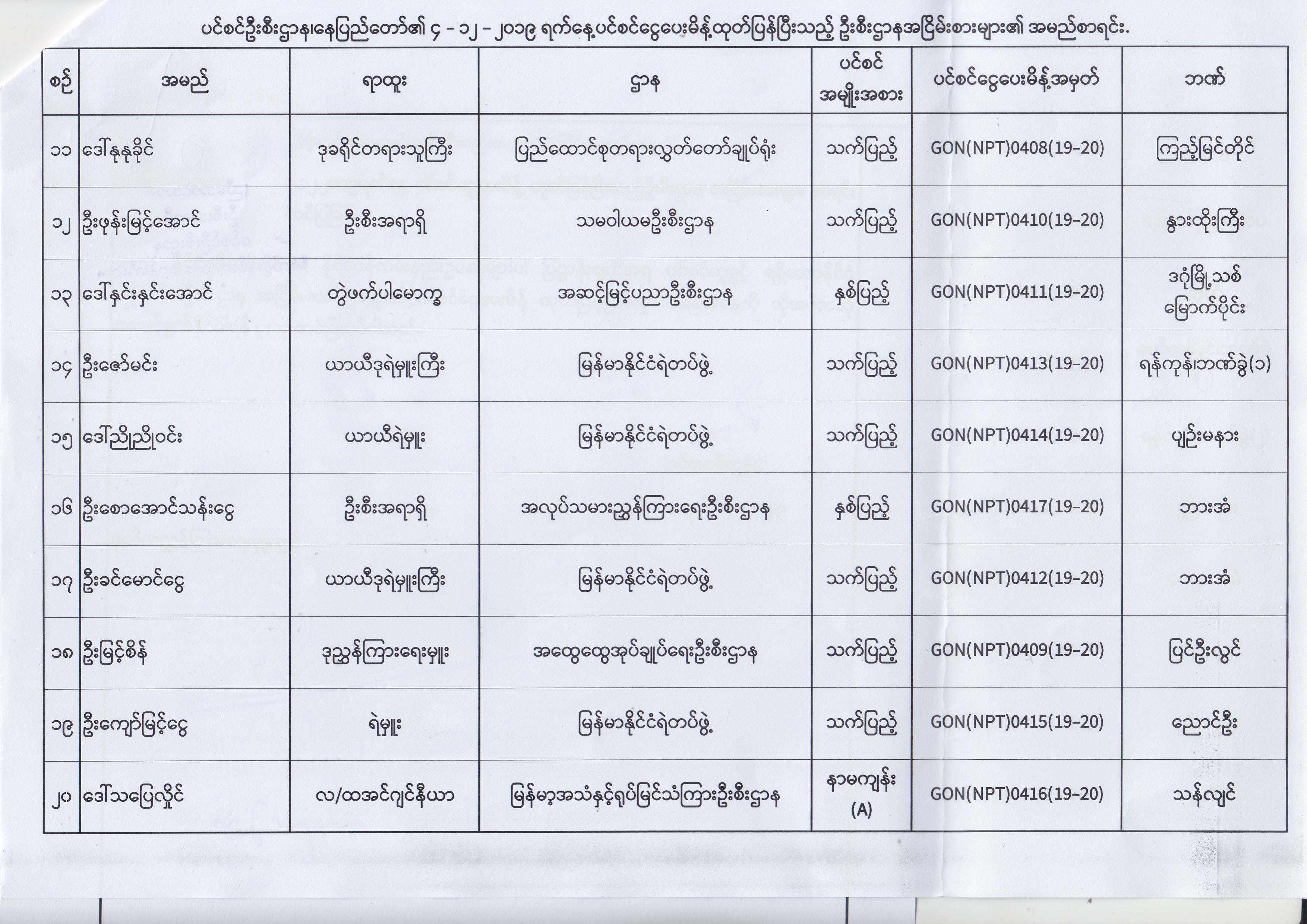 ပင်စင်ဦးစီးဌာန၊ နေပြည်တော်၏ (၂.၁၂.၂၀၁၉) မှ (၁၃.၁၂.၂၀၁၉) ရက်နေ့အထိ ပင်စင်ငွေပေးမိန့်ထုတ်ပြန်ပြီးသည့် ဦးစီးဌာနအငြိမ်းစားများ၏ အမည်စာရင်း pension_editor Wed, 12/18/2019 - 14:02