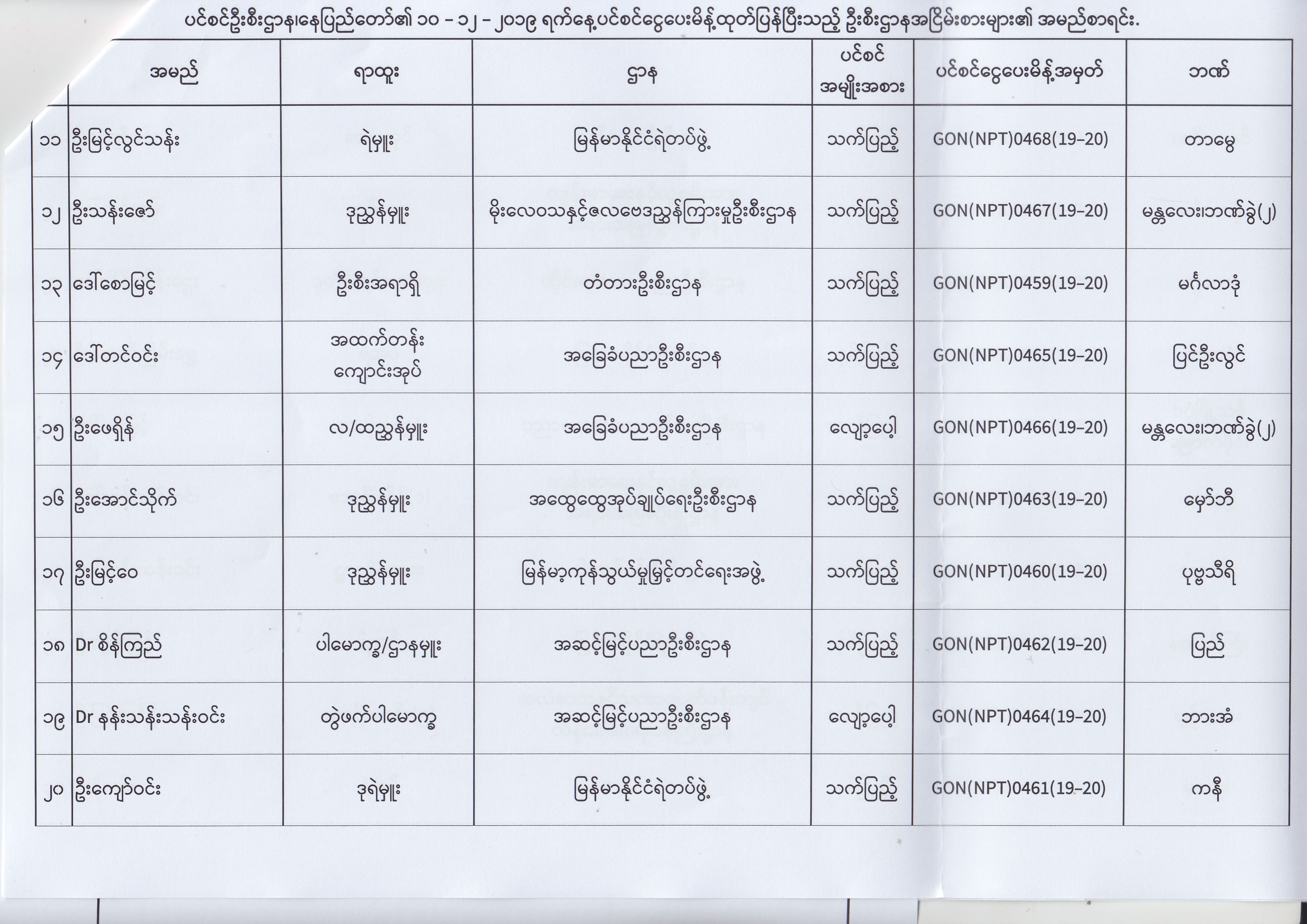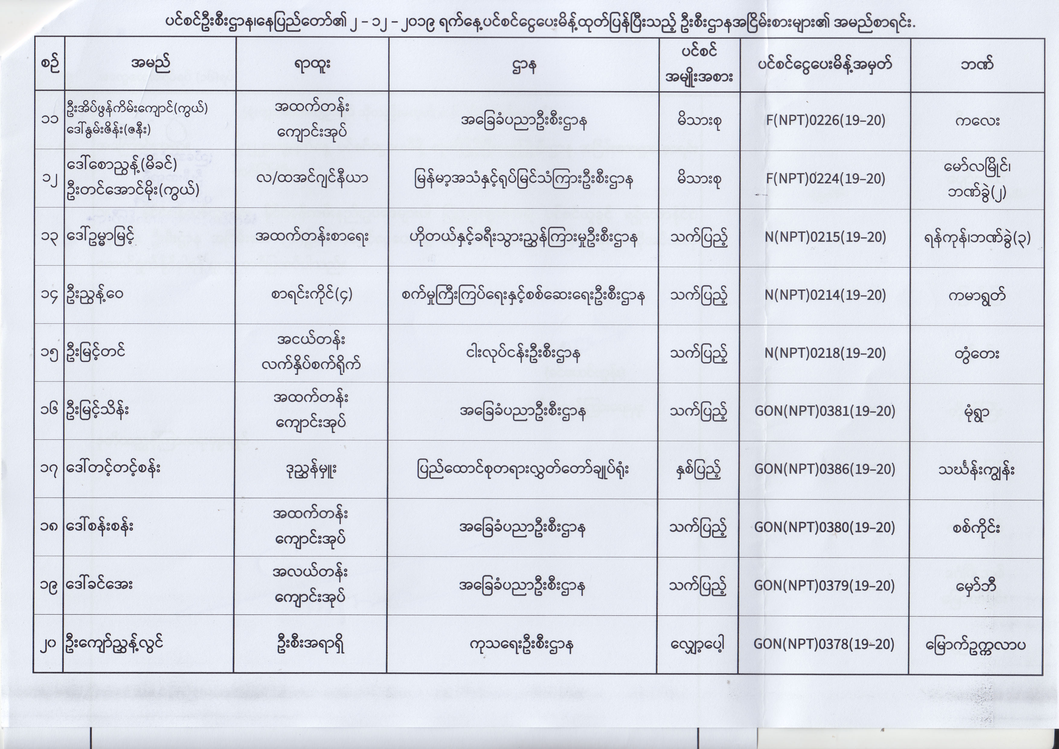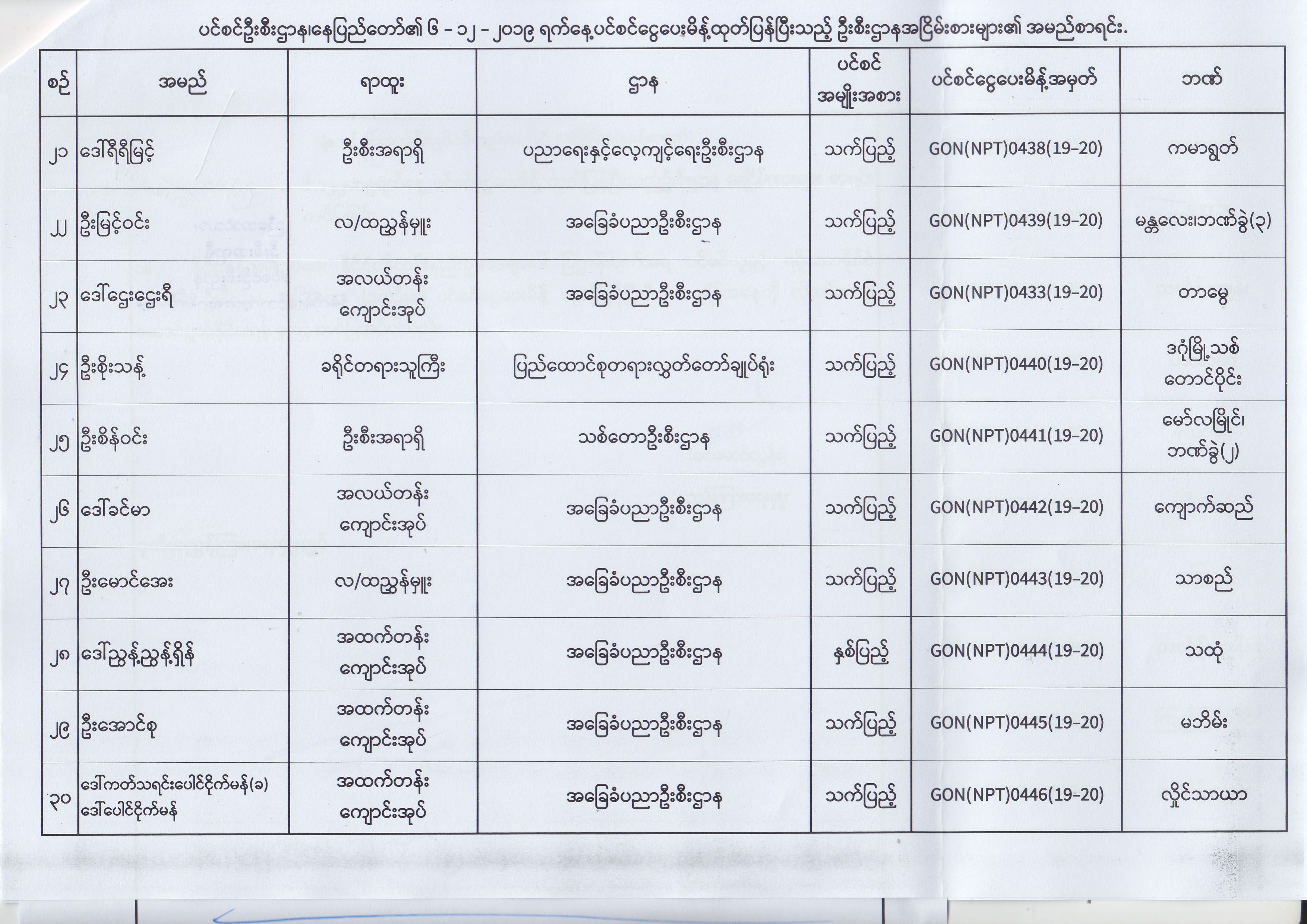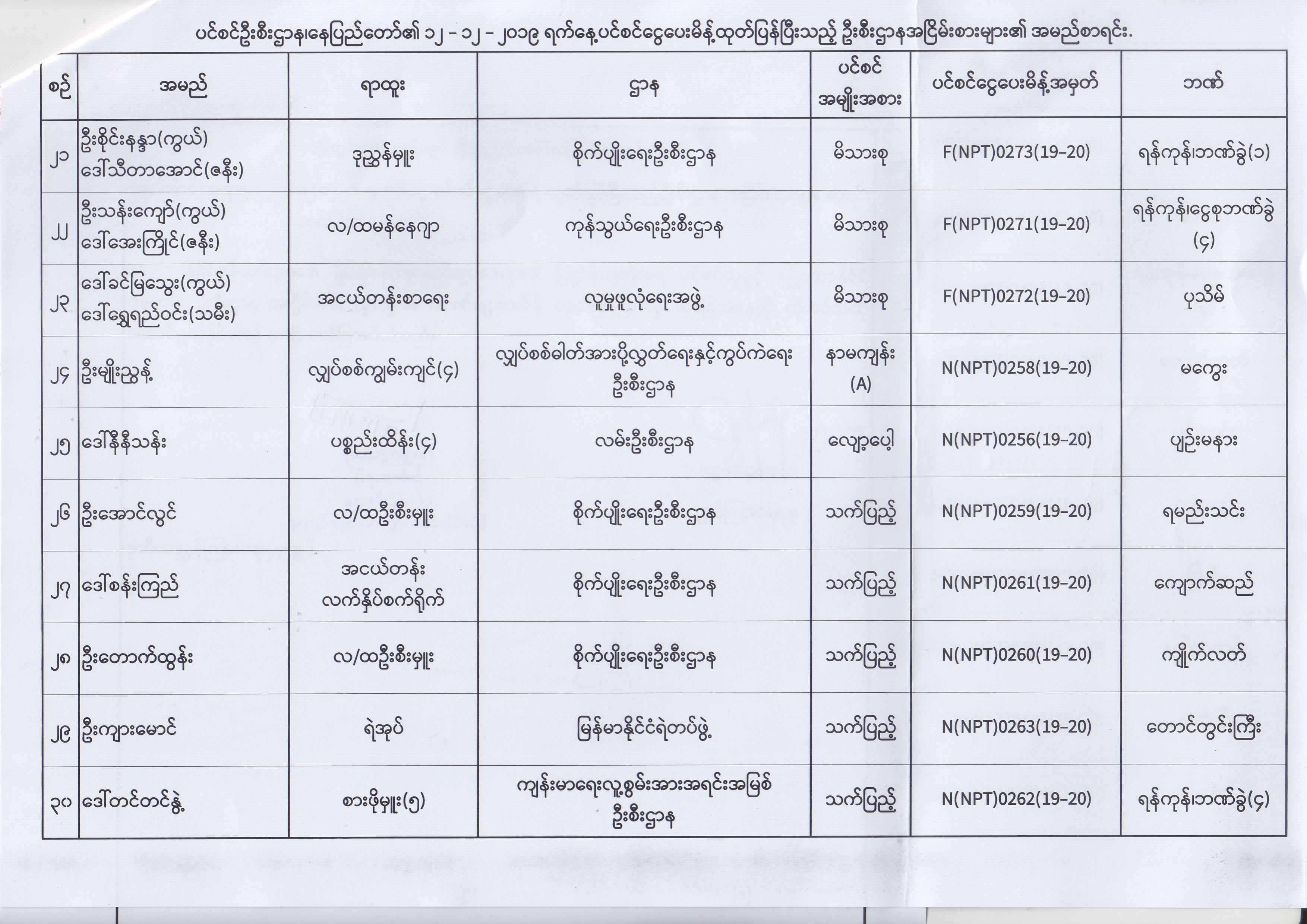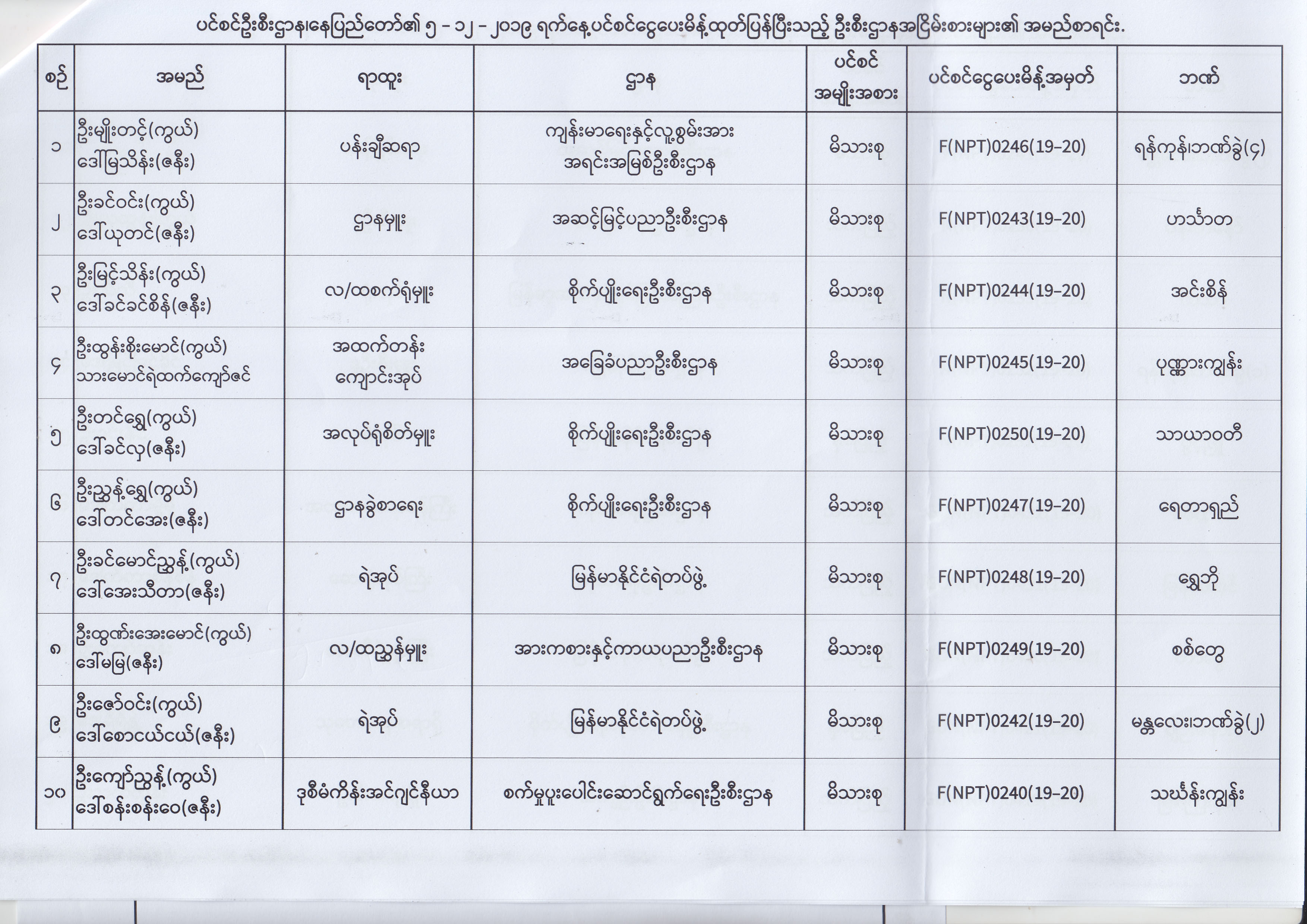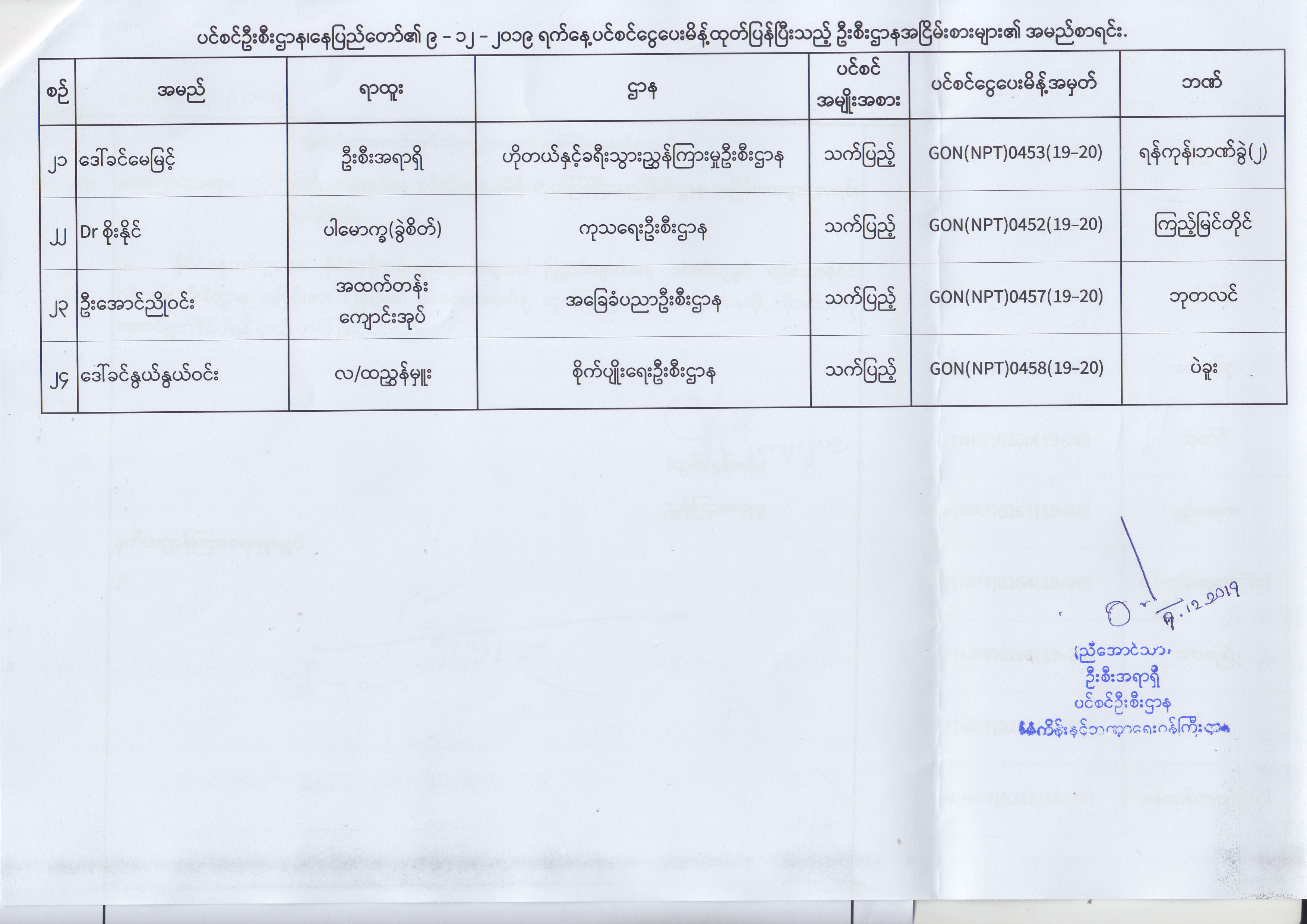 ပင်စင်ဦးစီးဌာန၊ နေပြည်တော်၏ (၂.၁၂.၂၀၁၉) မှ (၁၃.၁၂.၂၀၁၉) ရက်နေ့အထိ ပင်စင်ငွေပေးမိန့်ထုတ်ပြန်ပြီးသည့် ဦးစီးဌာနအငြိမ်းစားများ၏ အမည်စာရင်း pension_editor Wed, 12/18/2019 - 14:02