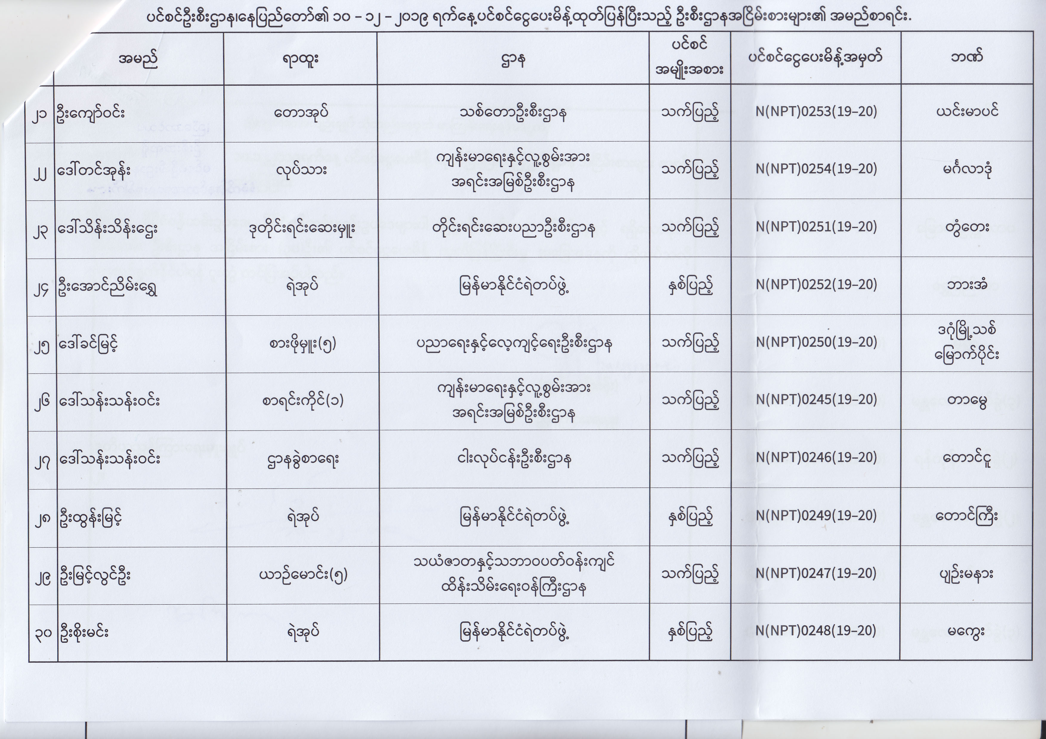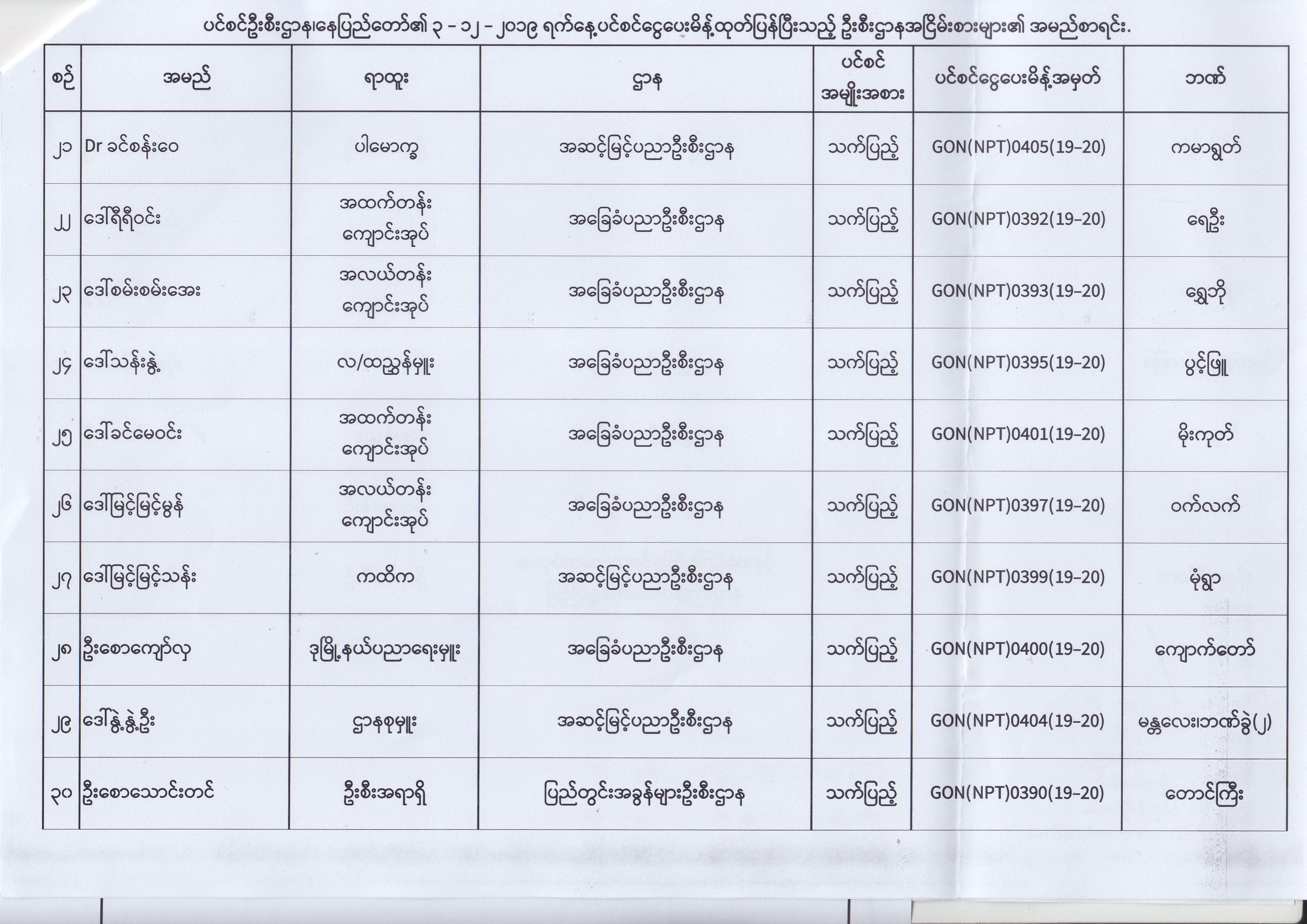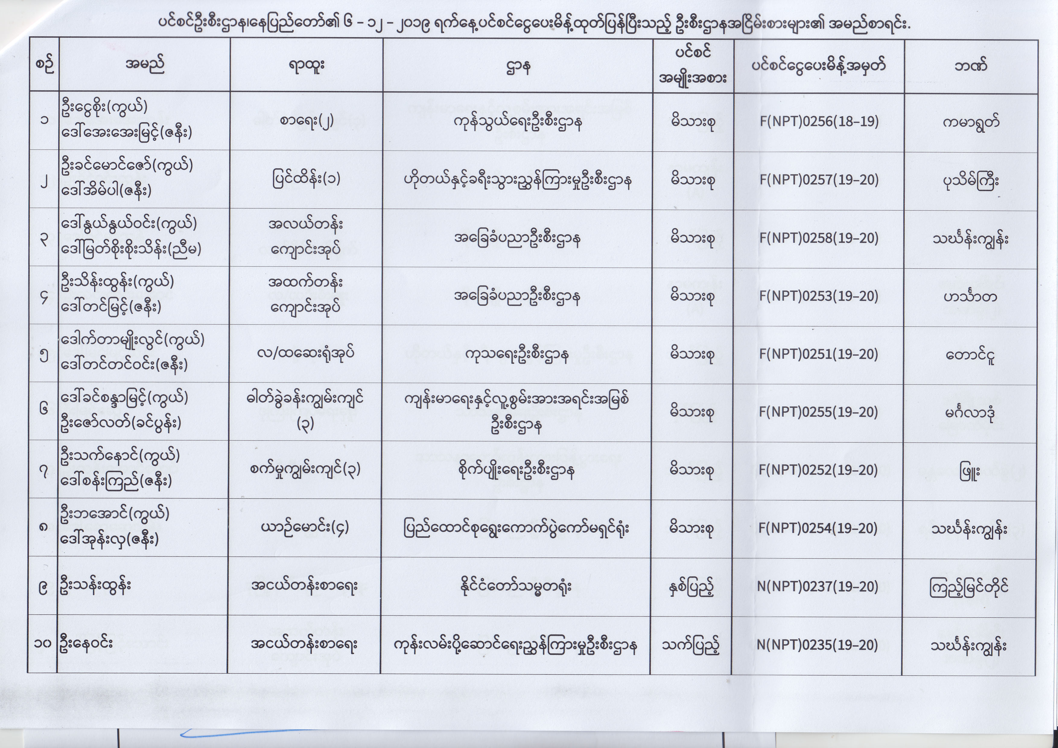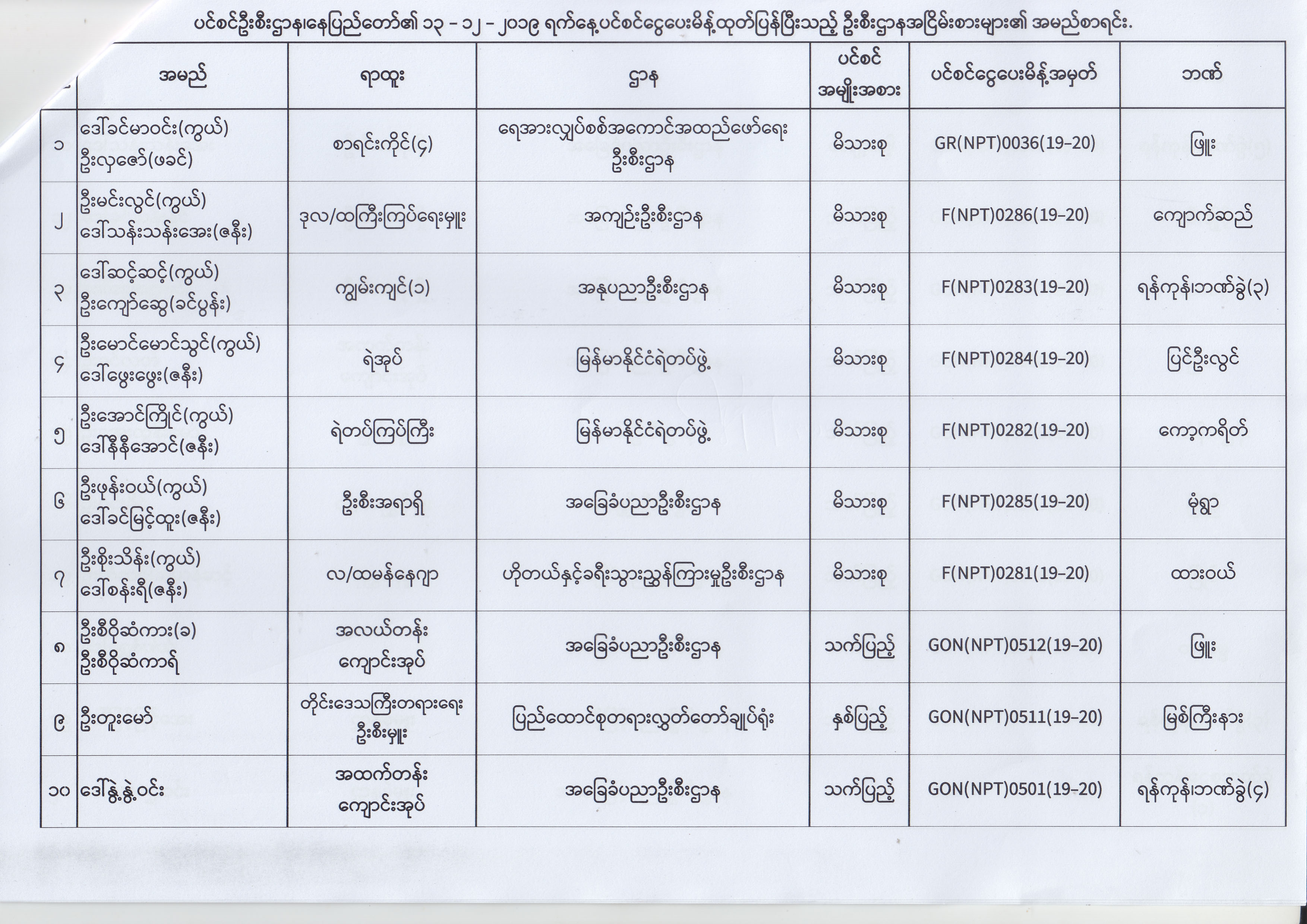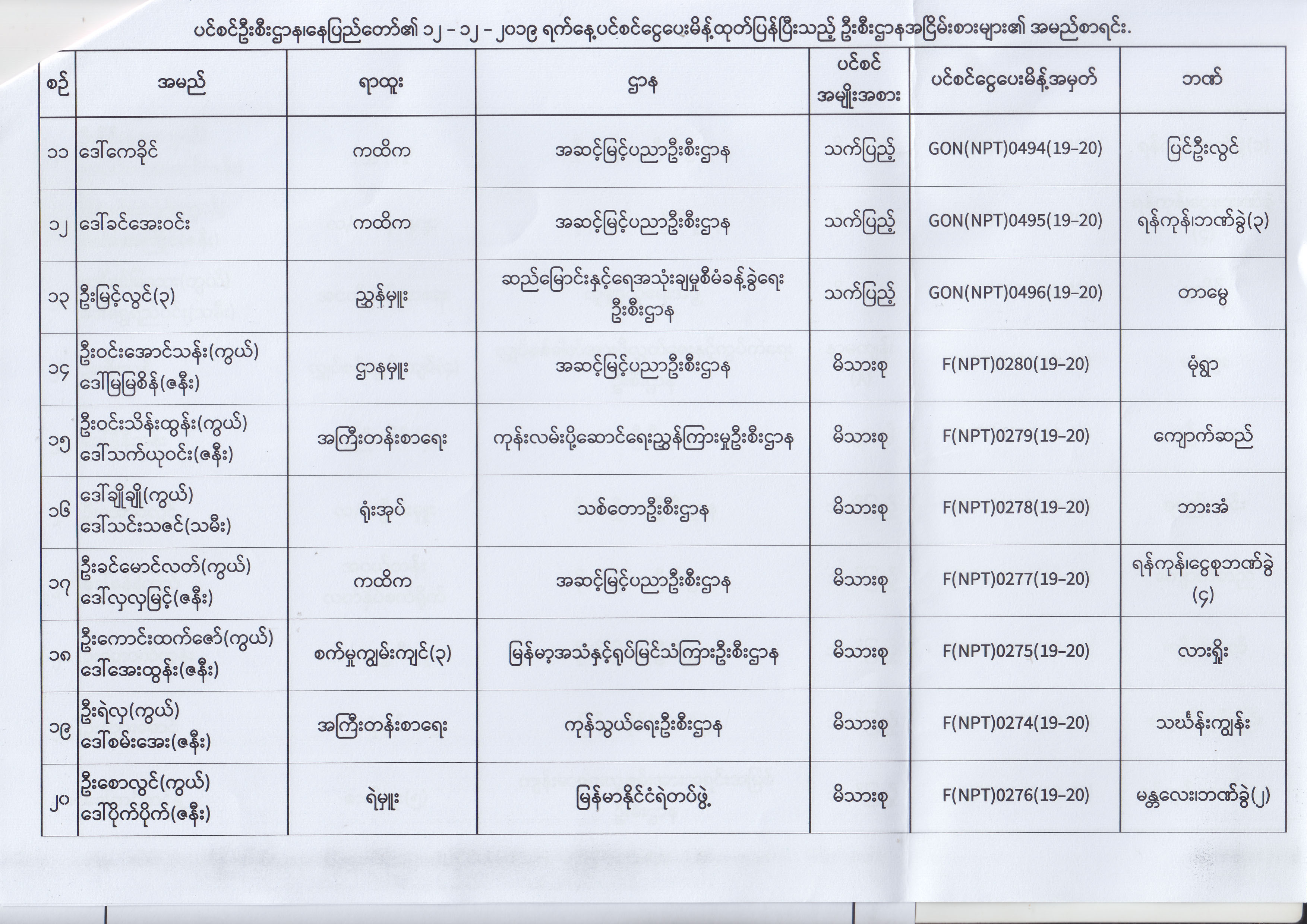 ပင်စင်ဦးစီးဌာန၊ နေပြည်တော်၏ (၂.၁၂.၂၀၁၉) မှ (၁၃.၁၂.၂၀၁၉) ရက်နေ့အထိ ပင်စင်ငွေပေးမိန့်ထုတ်ပြန်ပြီးသည့် ဦးစီးဌာနအငြိမ်းစားများ၏ အမည်စာရင်း pension_editor Wed, 12/18/2019 - 14:02