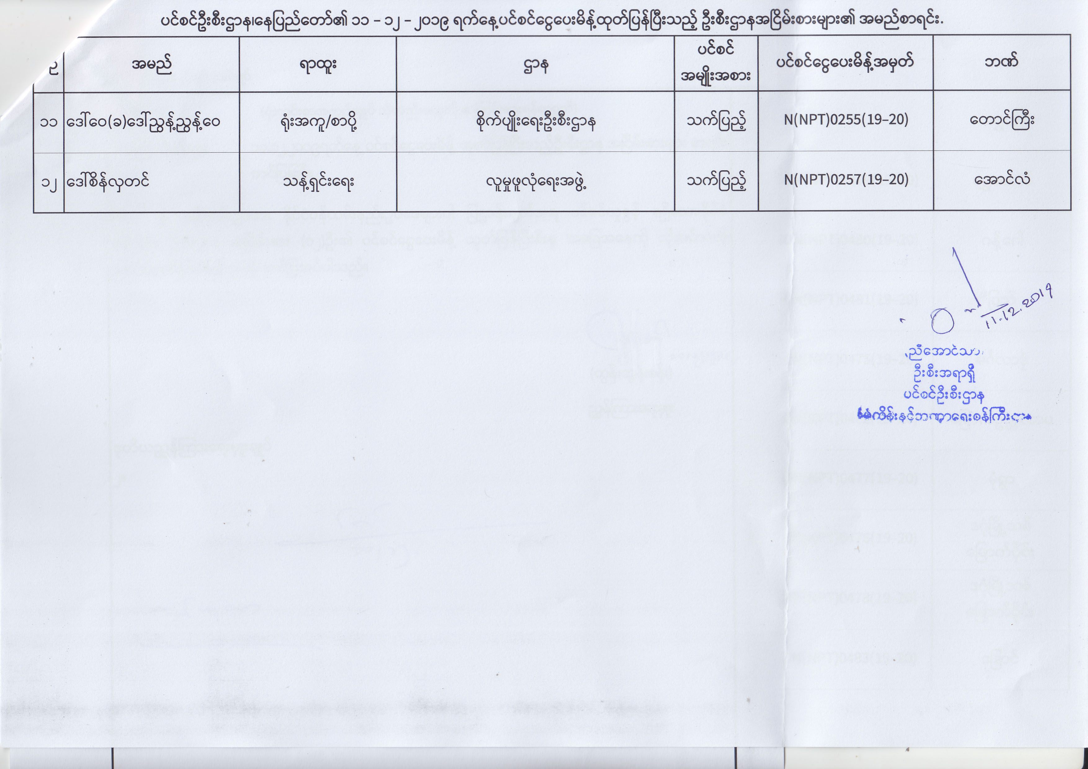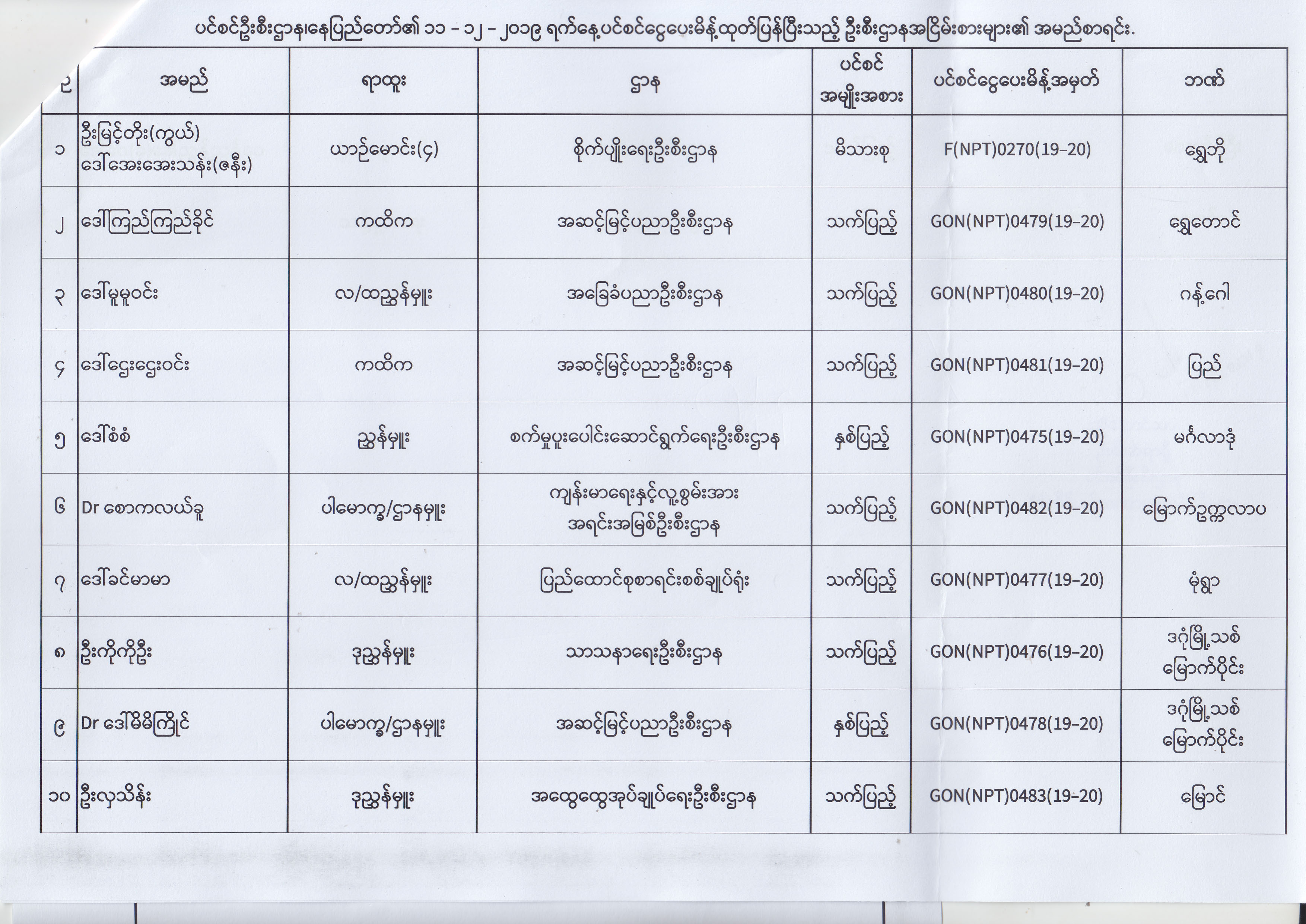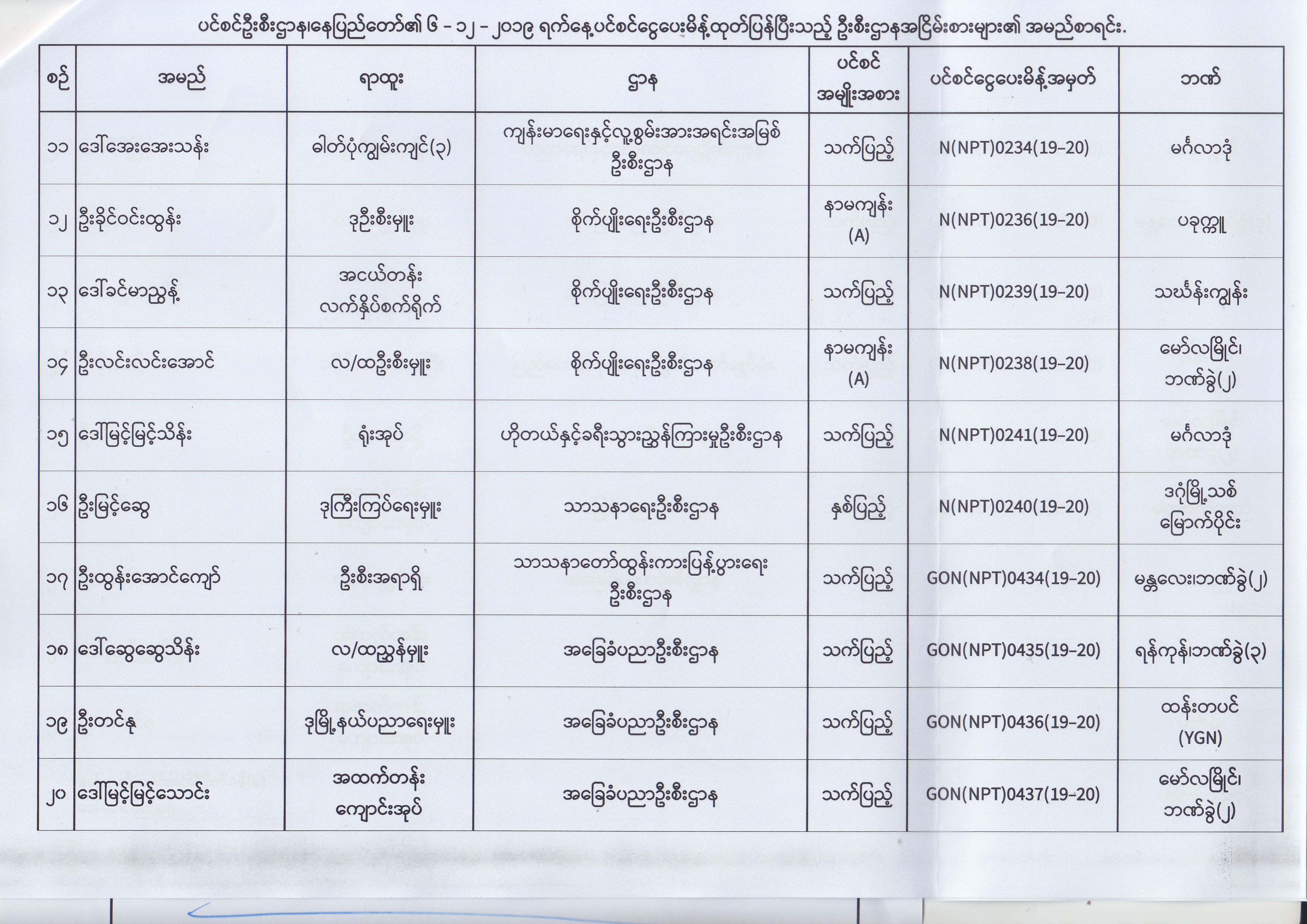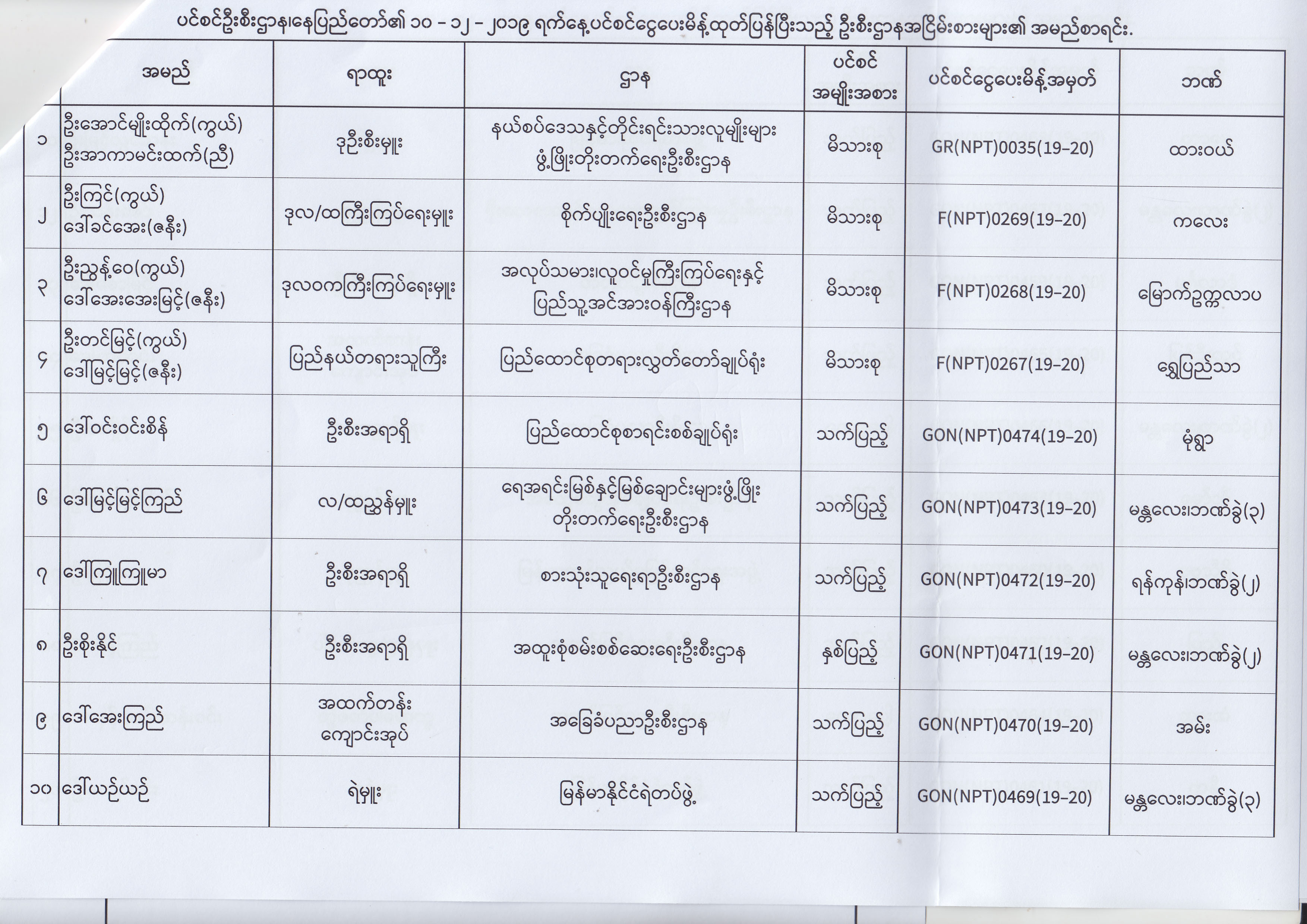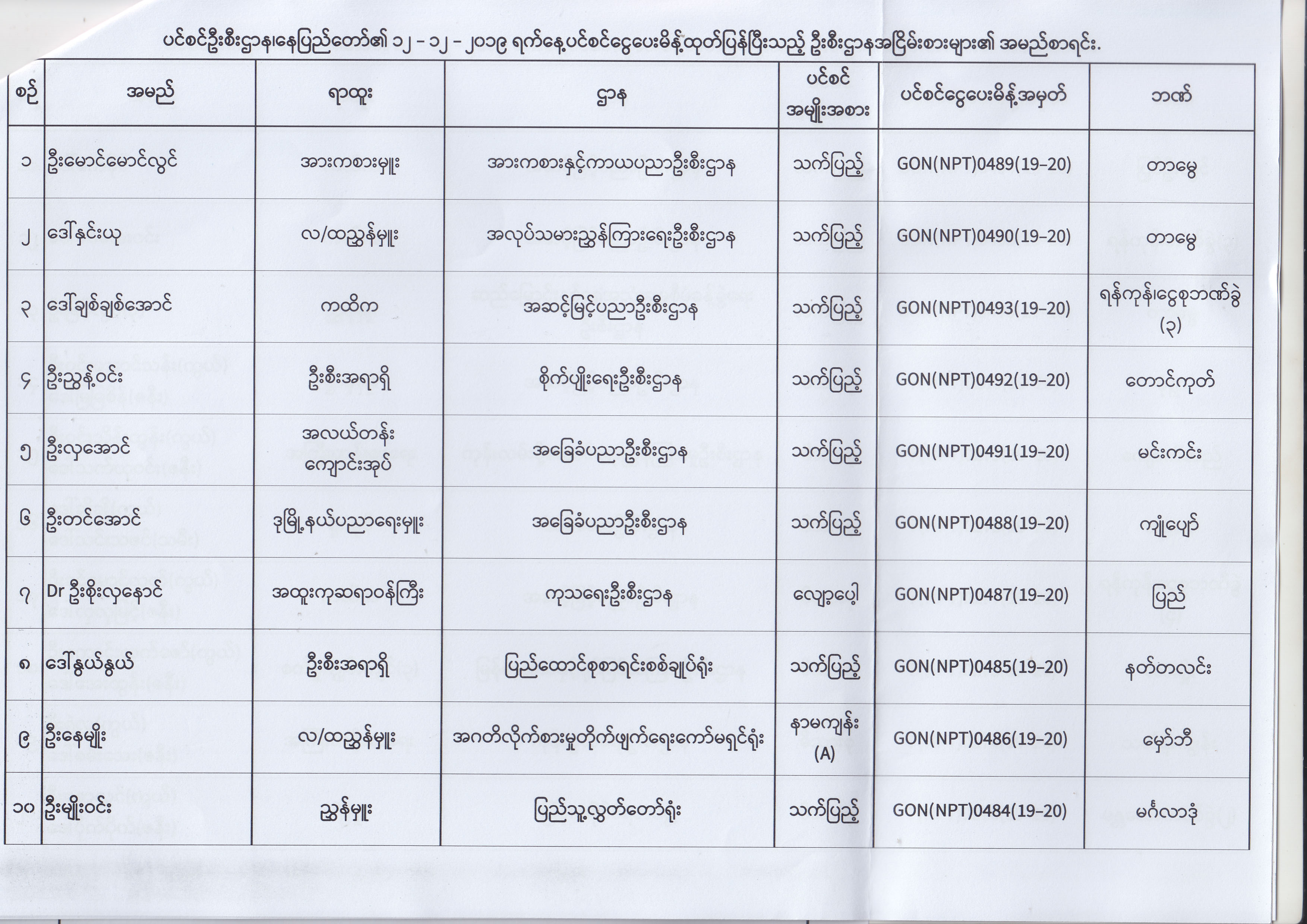 ပင်စင်ဦးစီးဌာန၊ နေပြည်တော်၏ (၂.၁၂.၂၀၁၉) မှ (၁၃.၁၂.၂၀၁၉) ရက်နေ့အထိ ပင်စင်ငွေပေးမိန့်ထုတ်ပြန်ပြီးသည့် ဦးစီးဌာနအငြိမ်းစားများ၏ အမည်စာရင်း pension_editor Wed, 12/18/2019 - 14:02