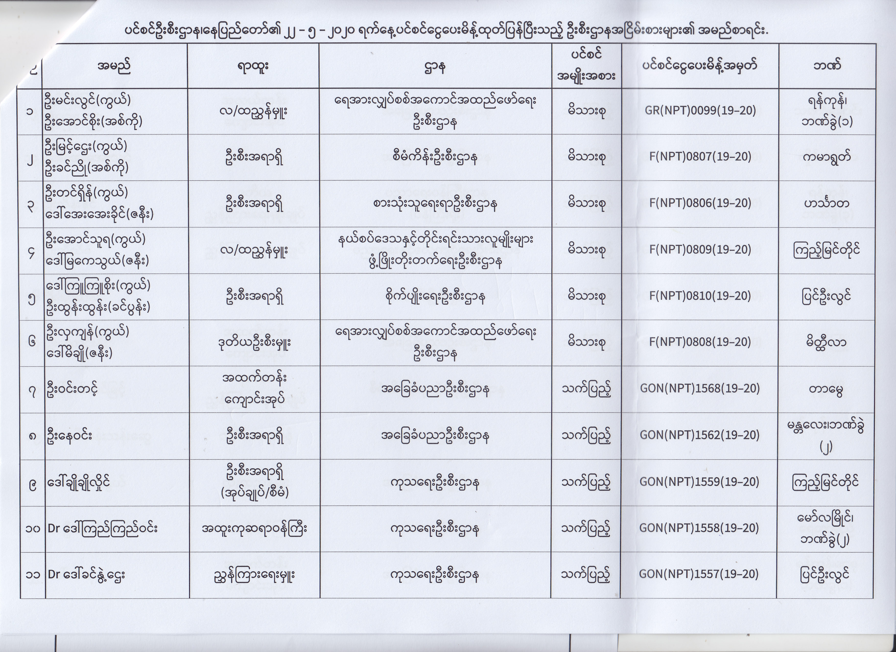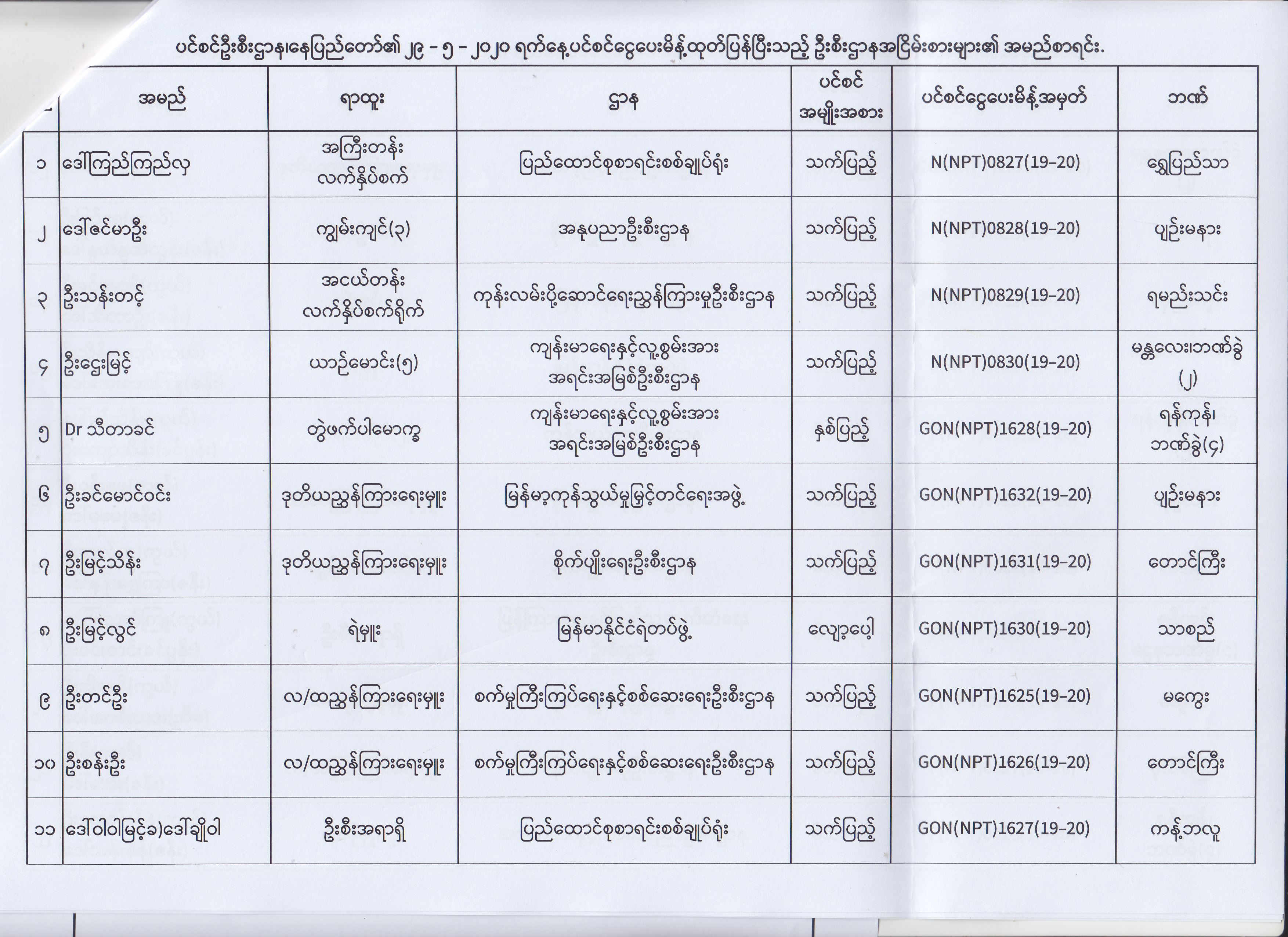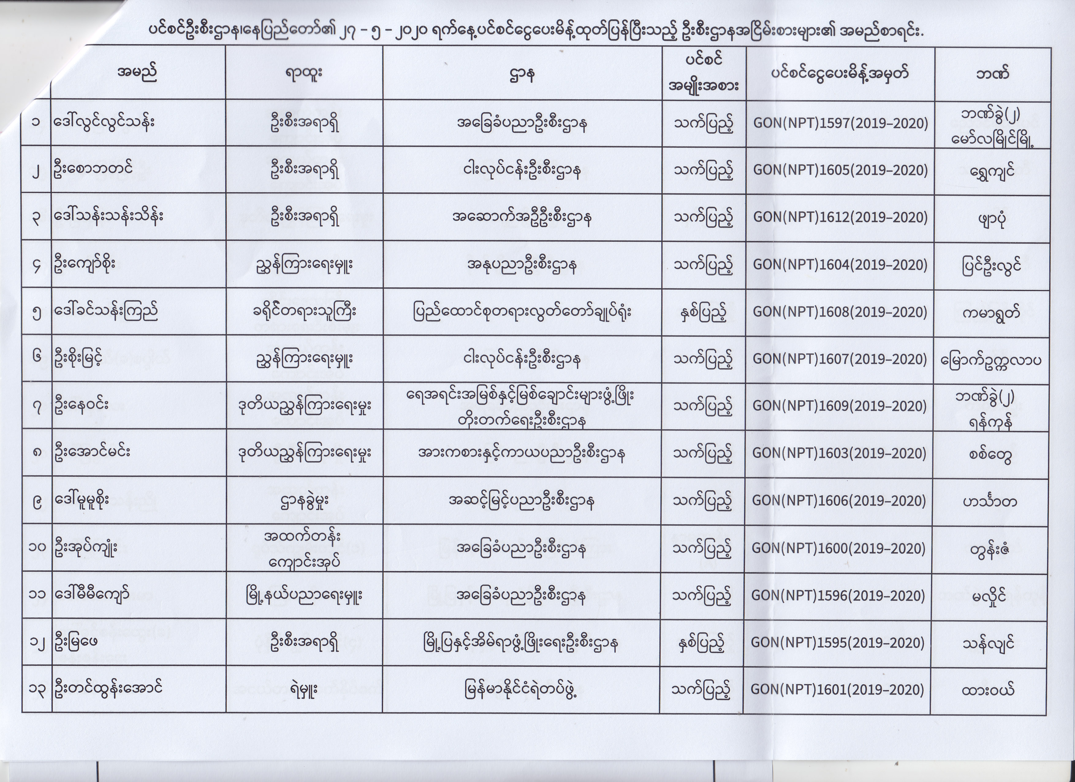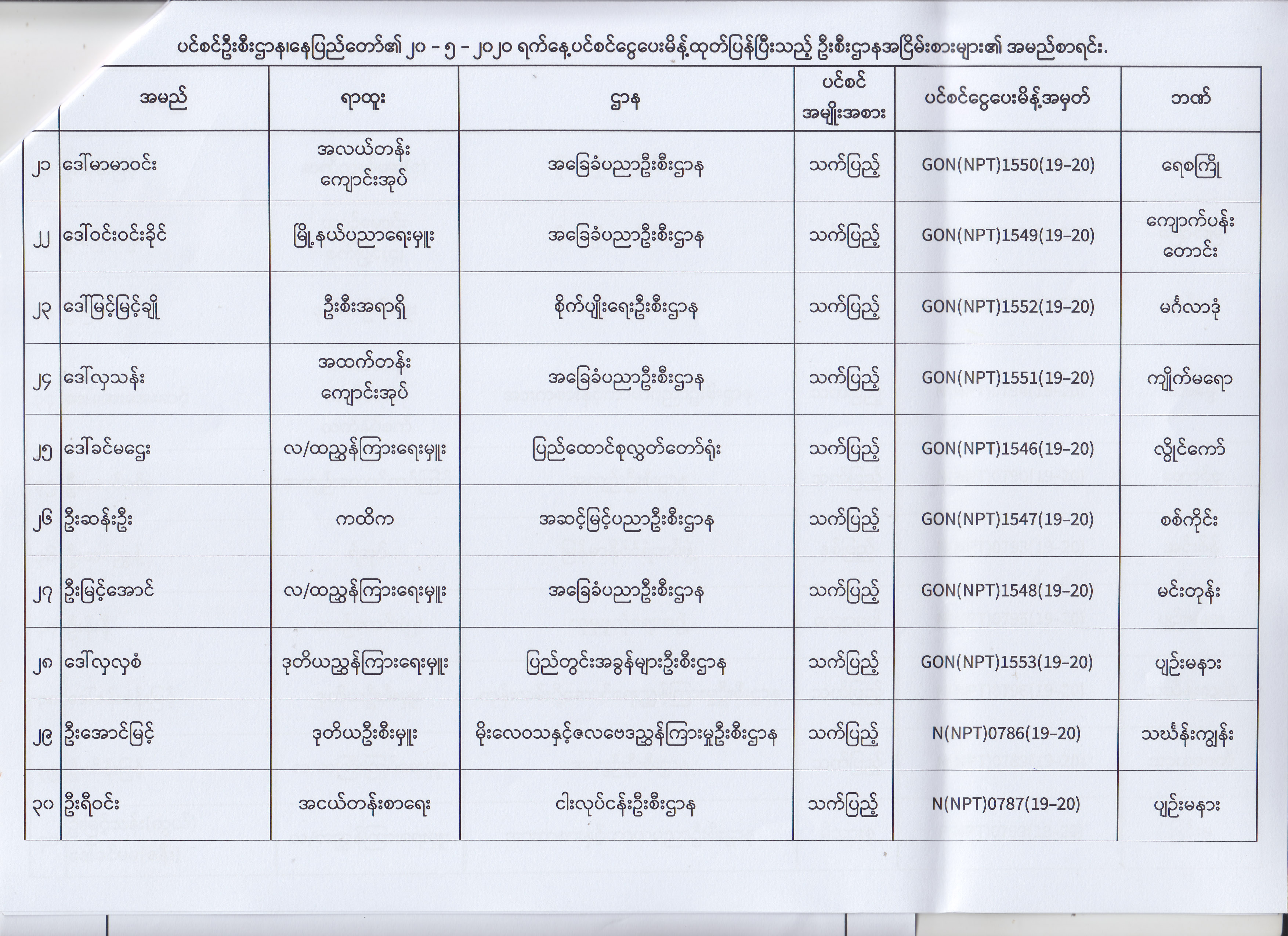 ပင်စင်ဦးစီးဌာန၊ နေပြည်တော်၏ (၁၈.၅.၂၀၂၀) မှ (၂၉.၅.၂၀၂၀) ရက်နေ့အထိ ပင်စင်ငွေပေးမိန့်ထုတ်ပြန်ပြီးသည့် ဦးစီးဌာနအငြိမ်းစားများ၏ အမည်စာရင်း