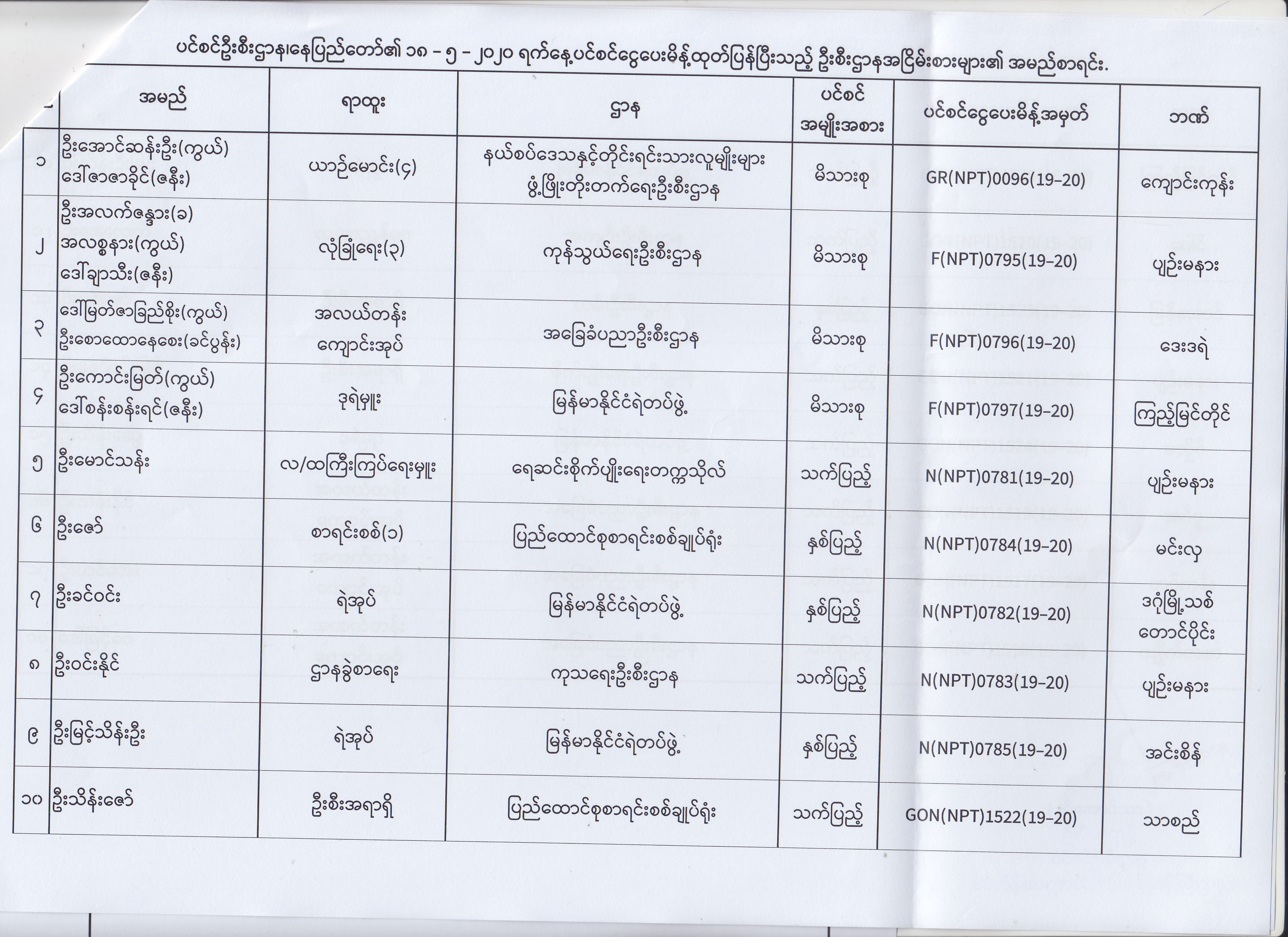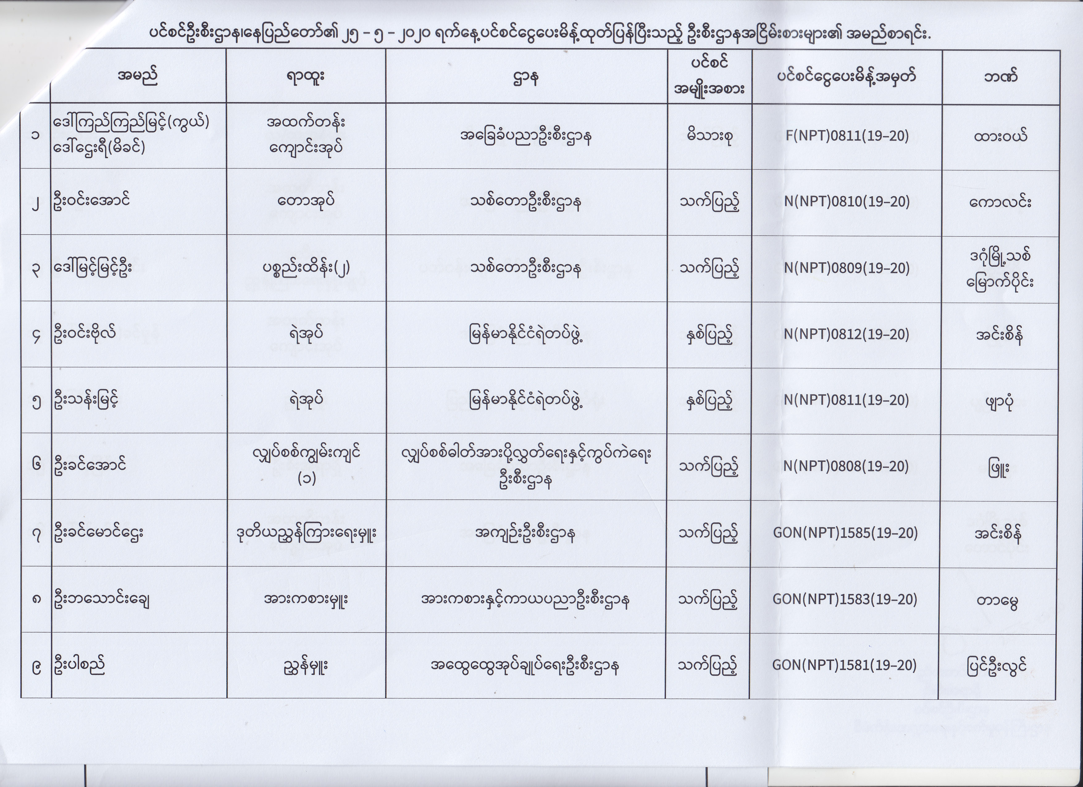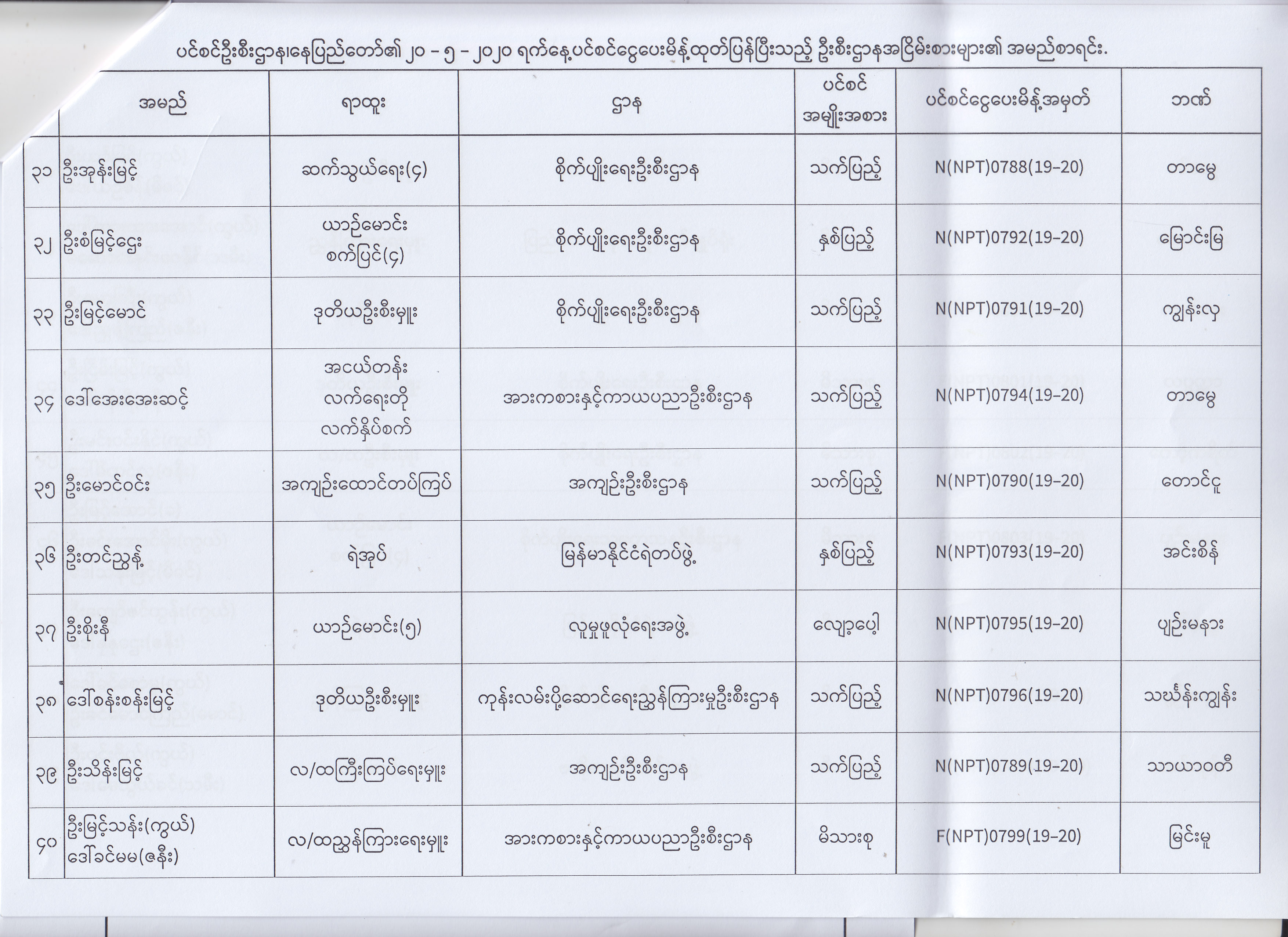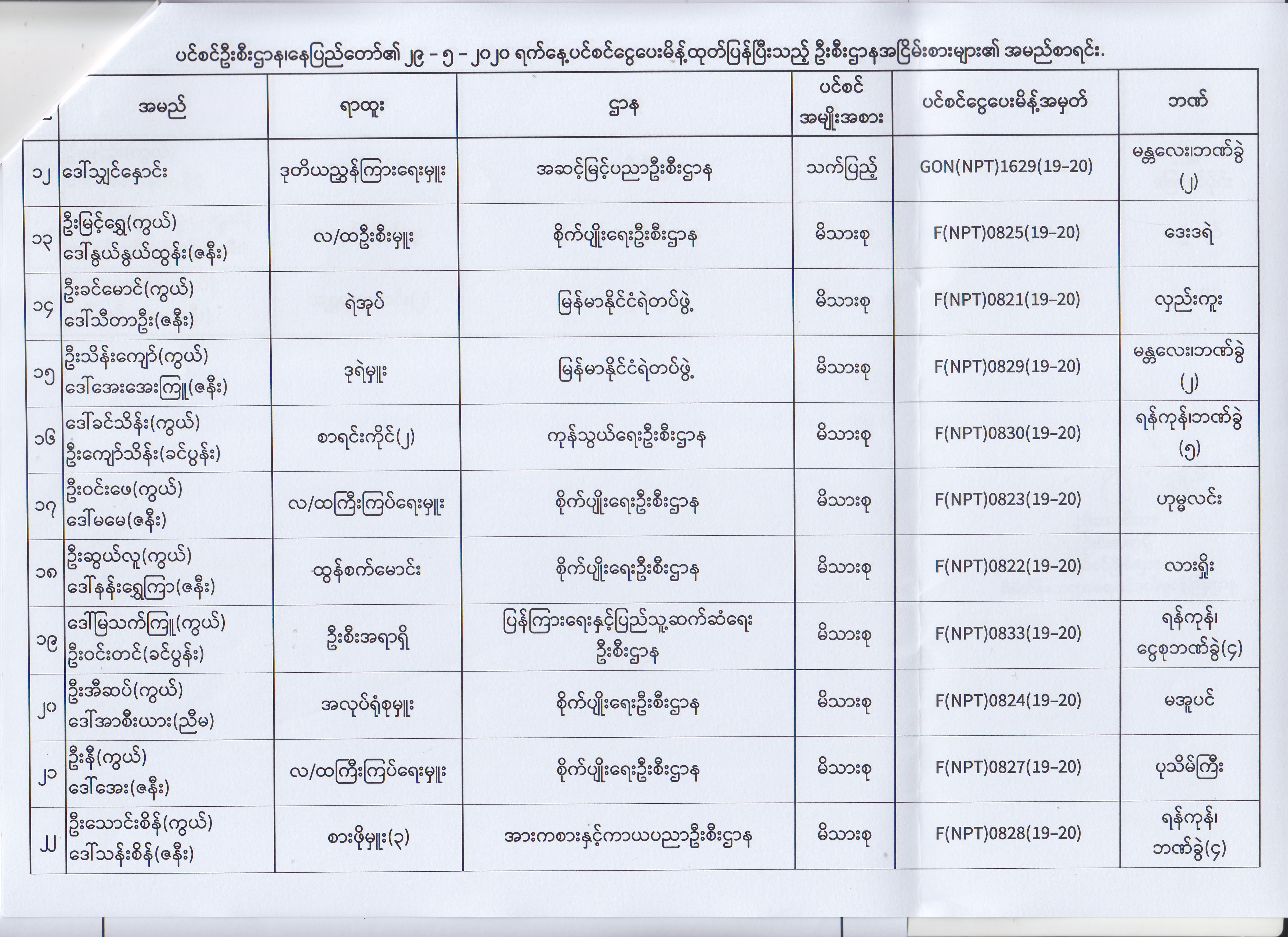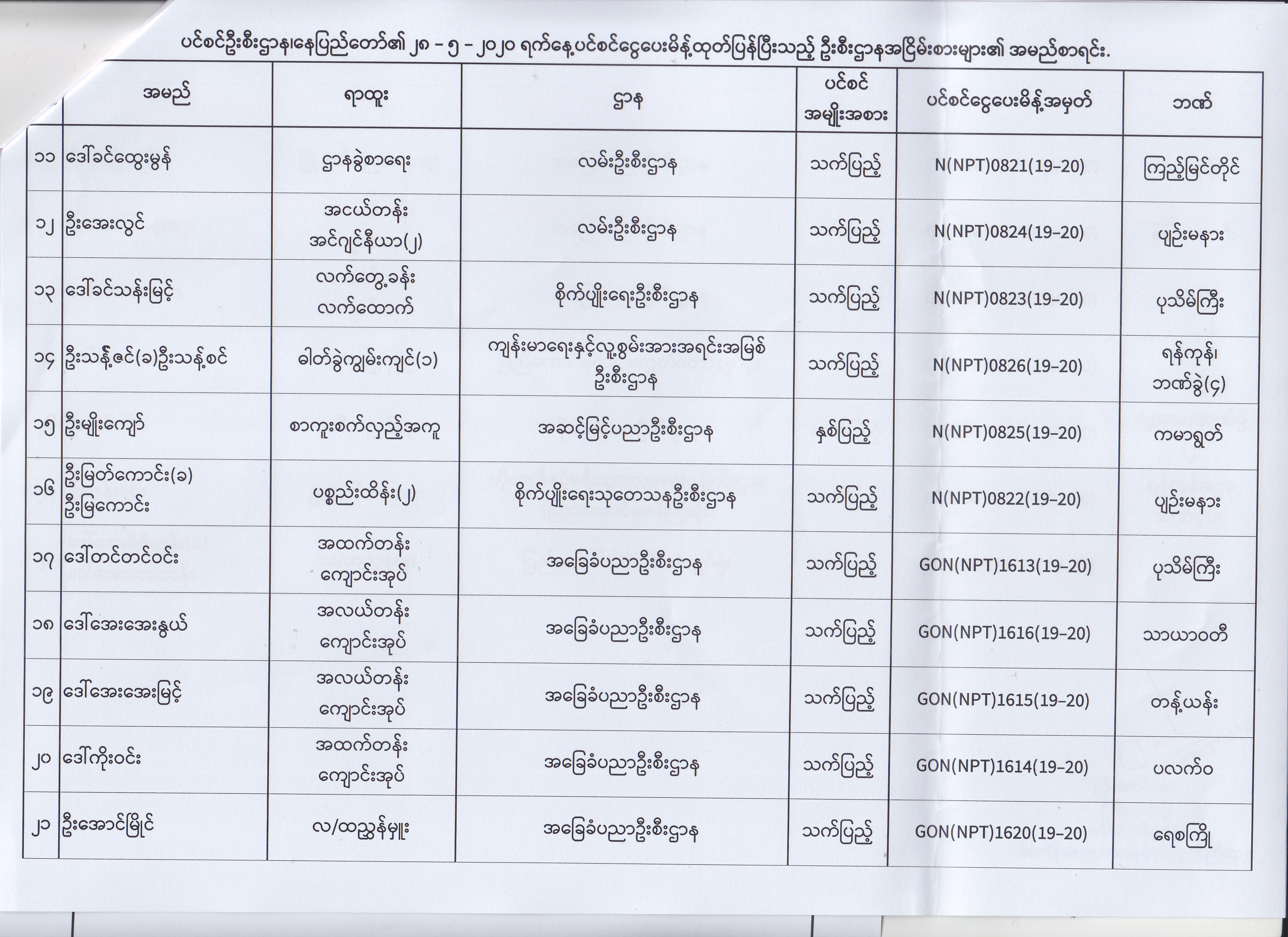 ပင်စင်ဦးစီးဌာန၊ နေပြည်တော်၏ (၁၈.၅.၂၀၂၀) မှ (၂၉.၅.၂၀၂၀) ရက်နေ့အထိ ပင်စင်ငွေပေးမိန့်ထုတ်ပြန်ပြီးသည့် ဦးစီးဌာနအငြိမ်းစားများ၏ အမည်စာရင်း