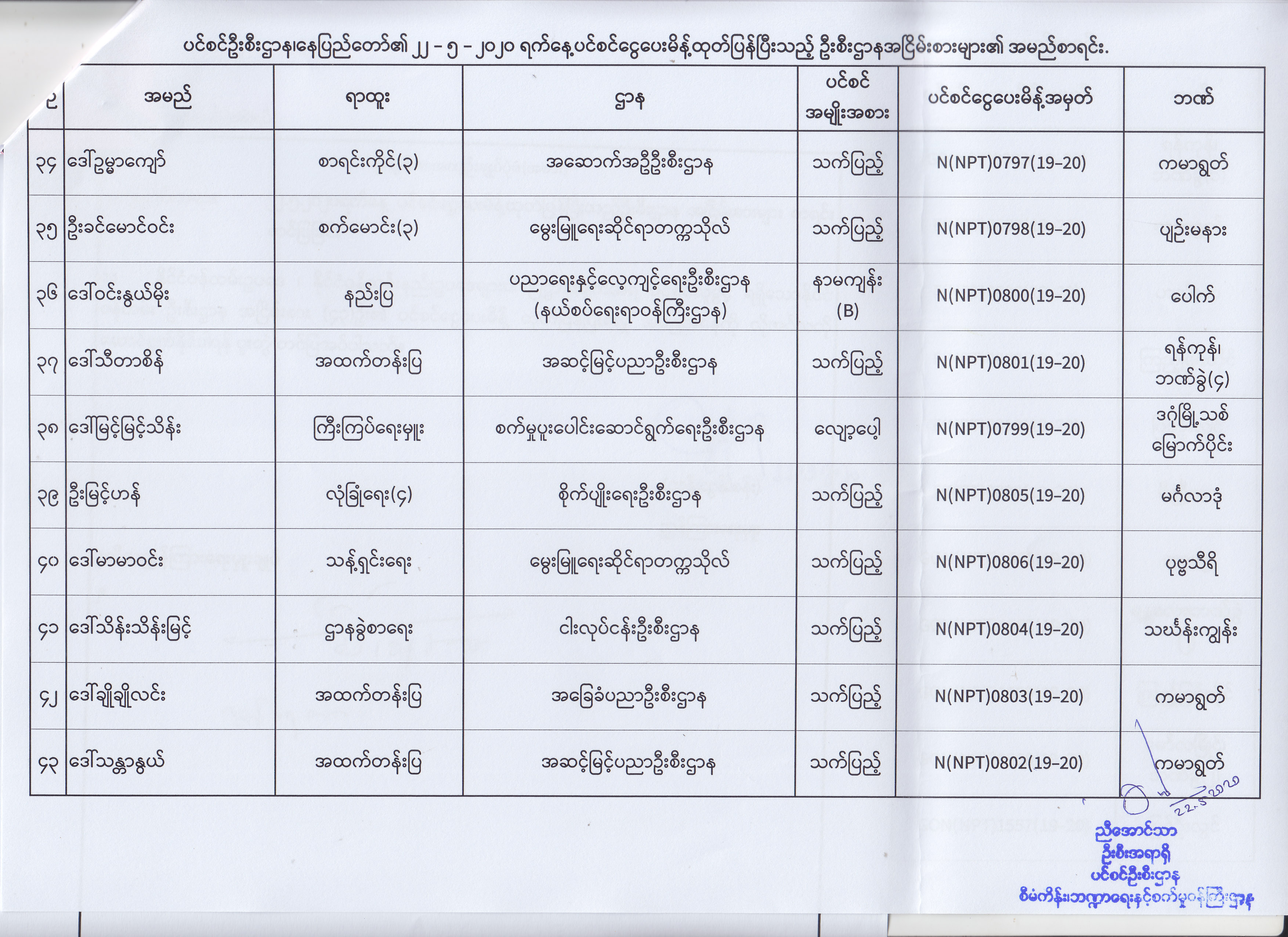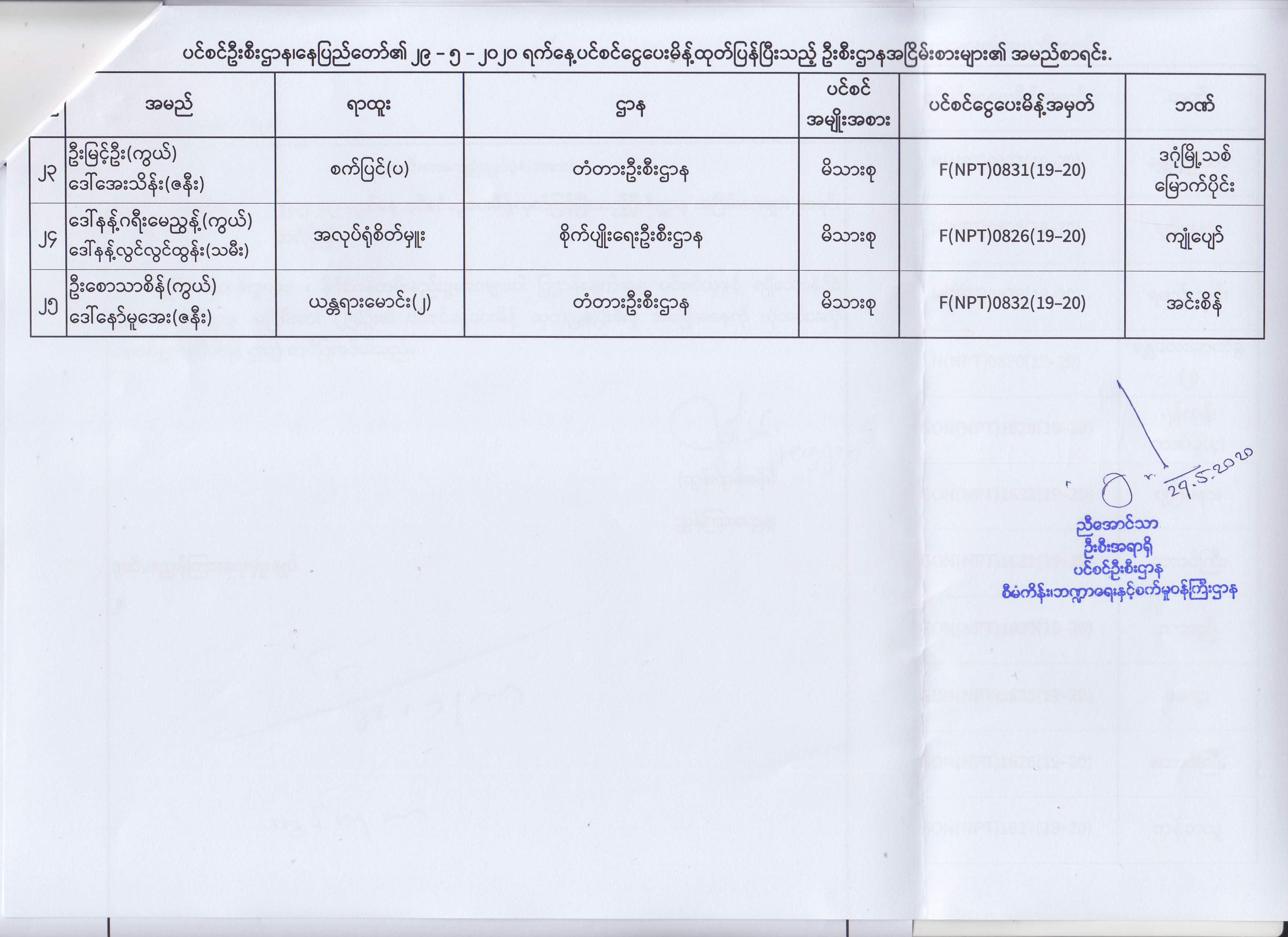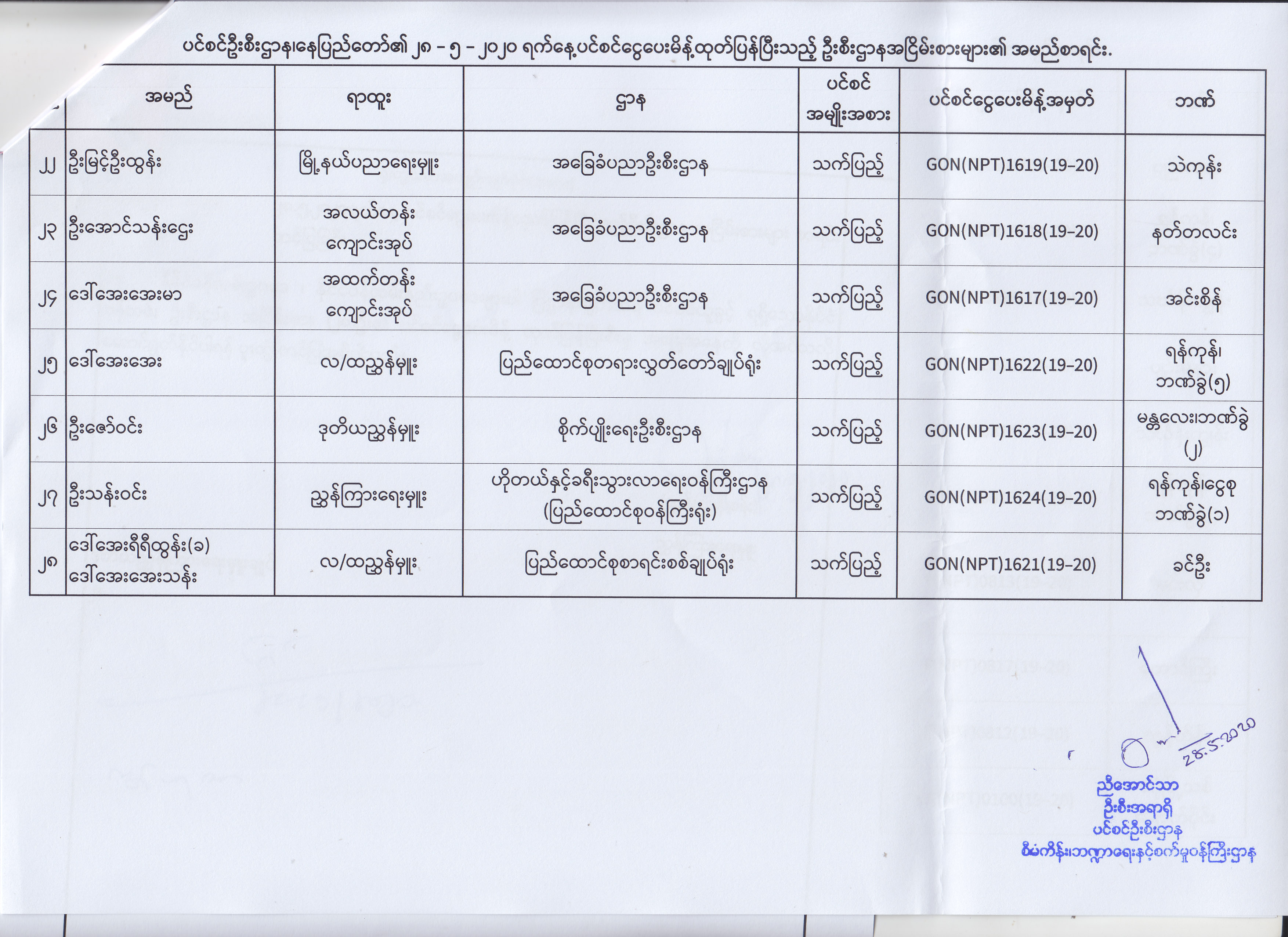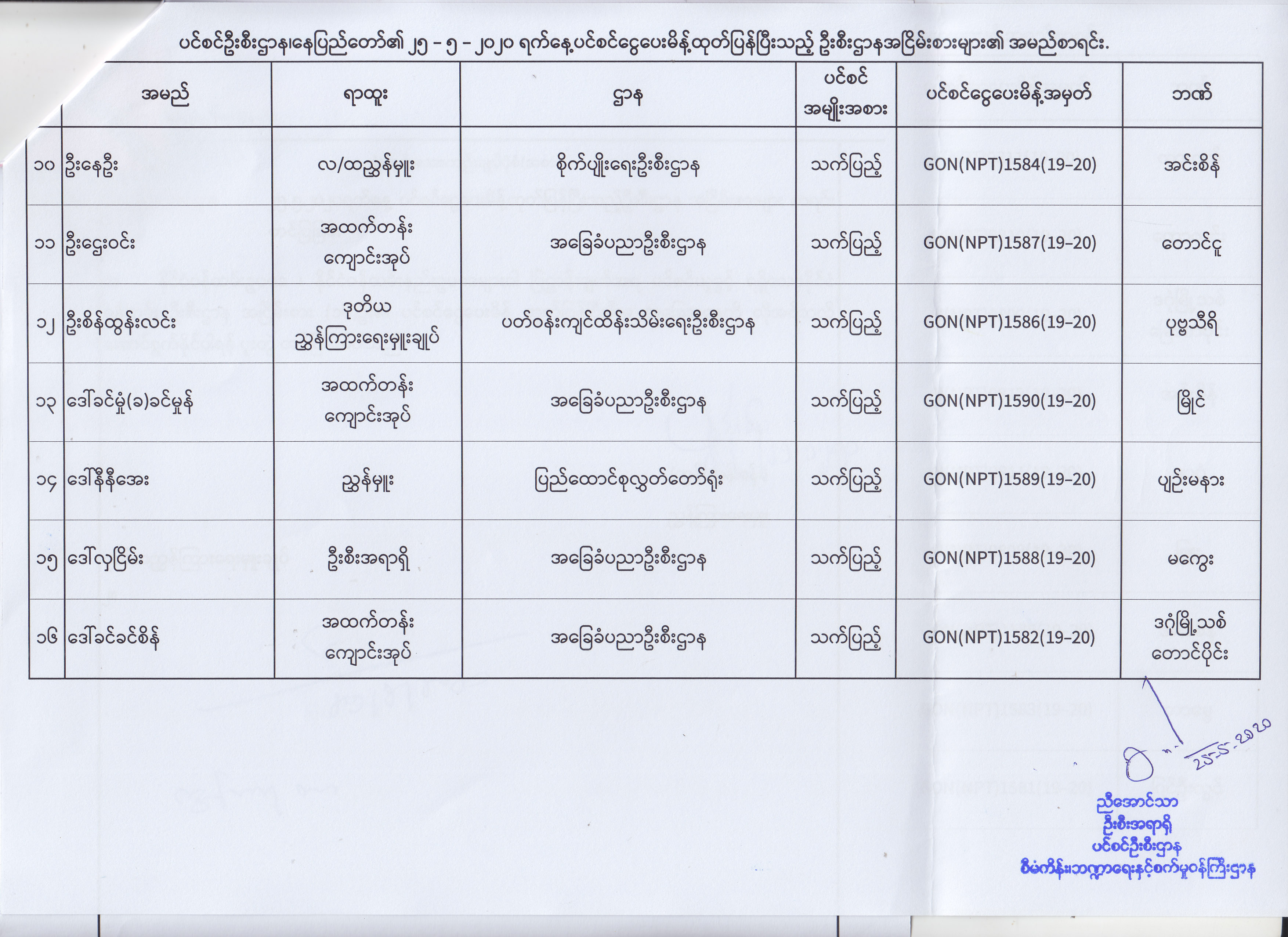 ပင်စင်ဦးစီးဌာန၊ နေပြည်တော်၏ (၁၈.၅.၂၀၂၀) မှ (၂၉.၅.၂၀၂၀) ရက်နေ့အထိ ပင်စင်ငွေပေးမိန့်ထုတ်ပြန်ပြီးသည့် ဦးစီးဌာနအငြိမ်းစားများ၏ အမည်စာရင်း