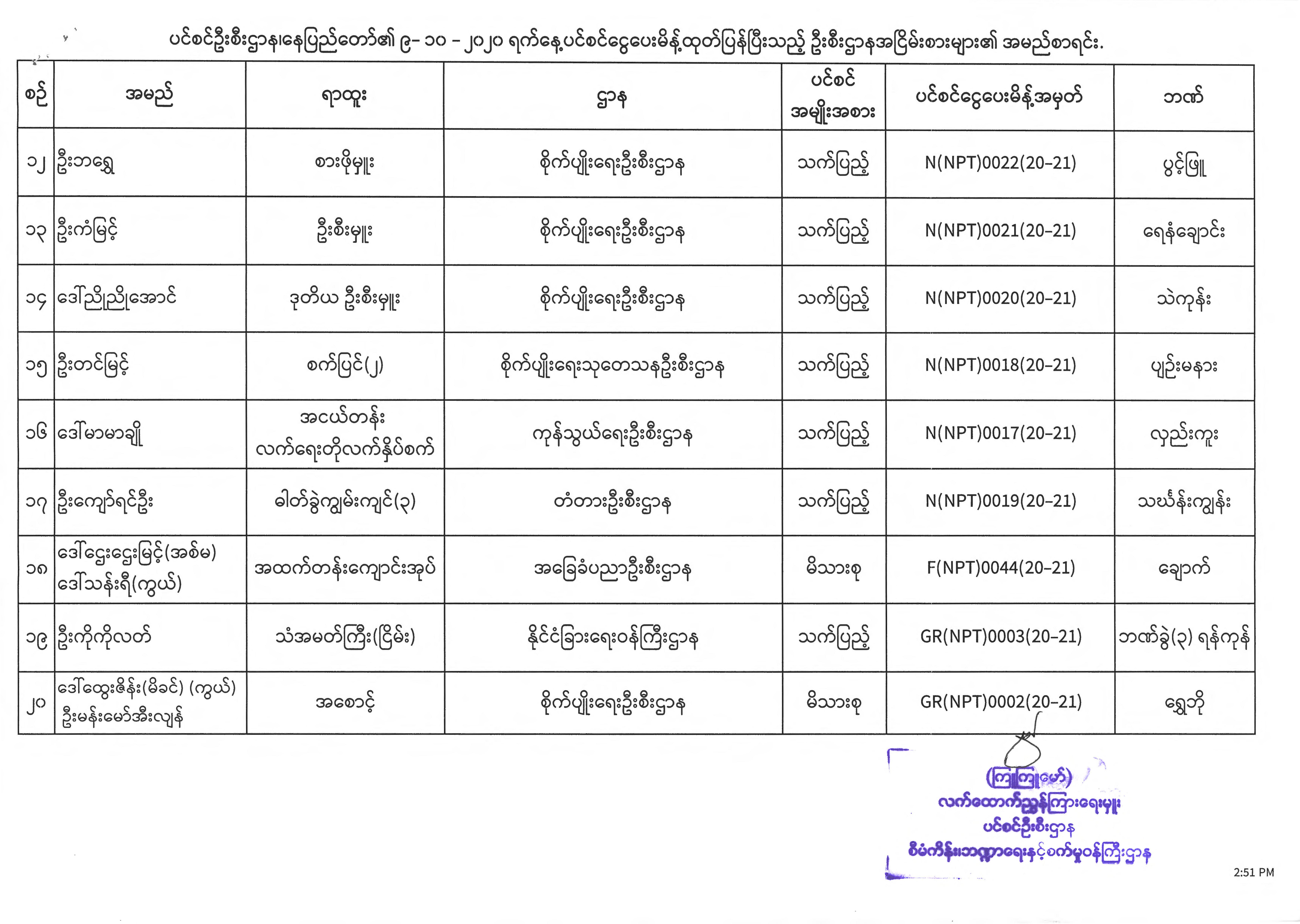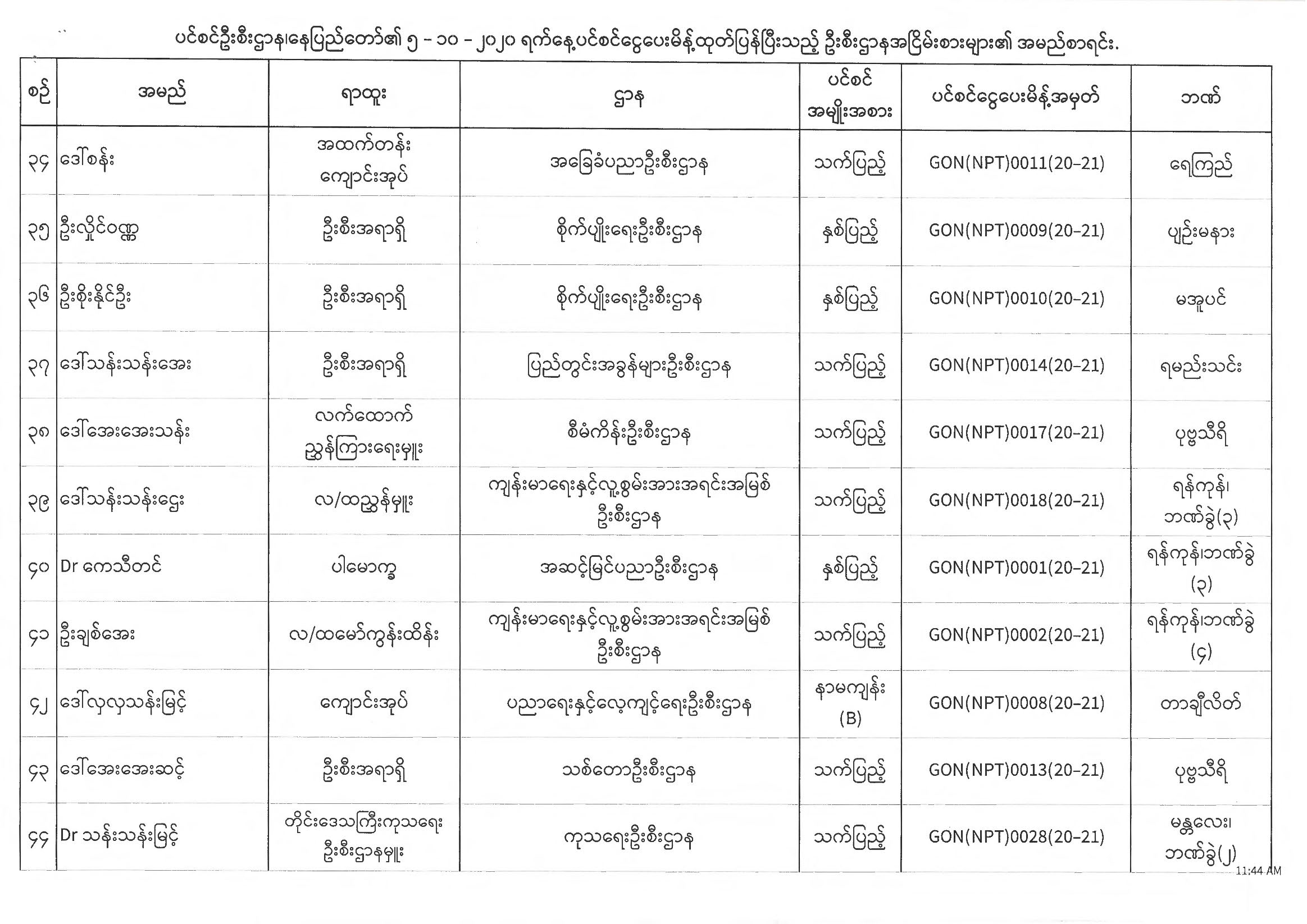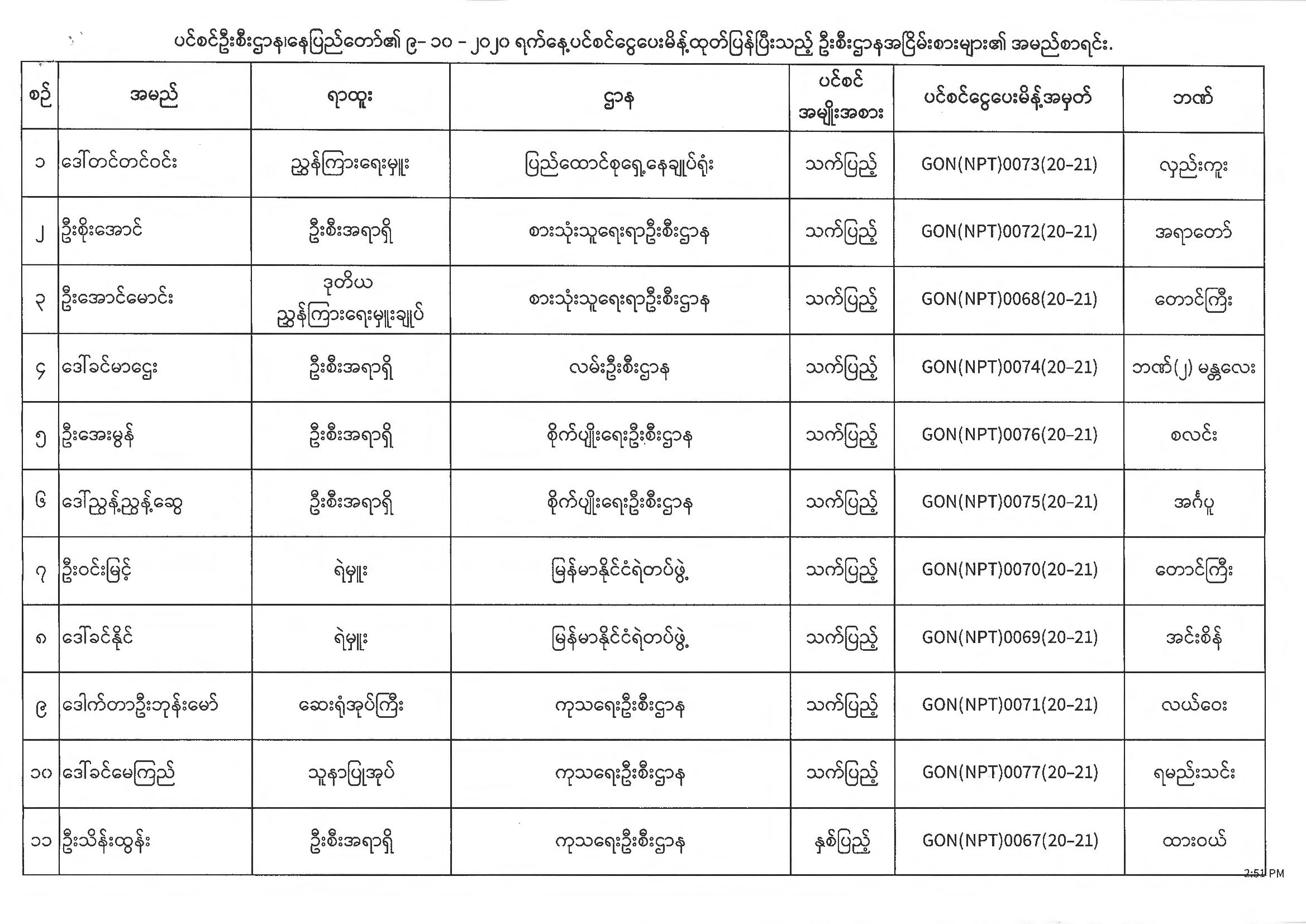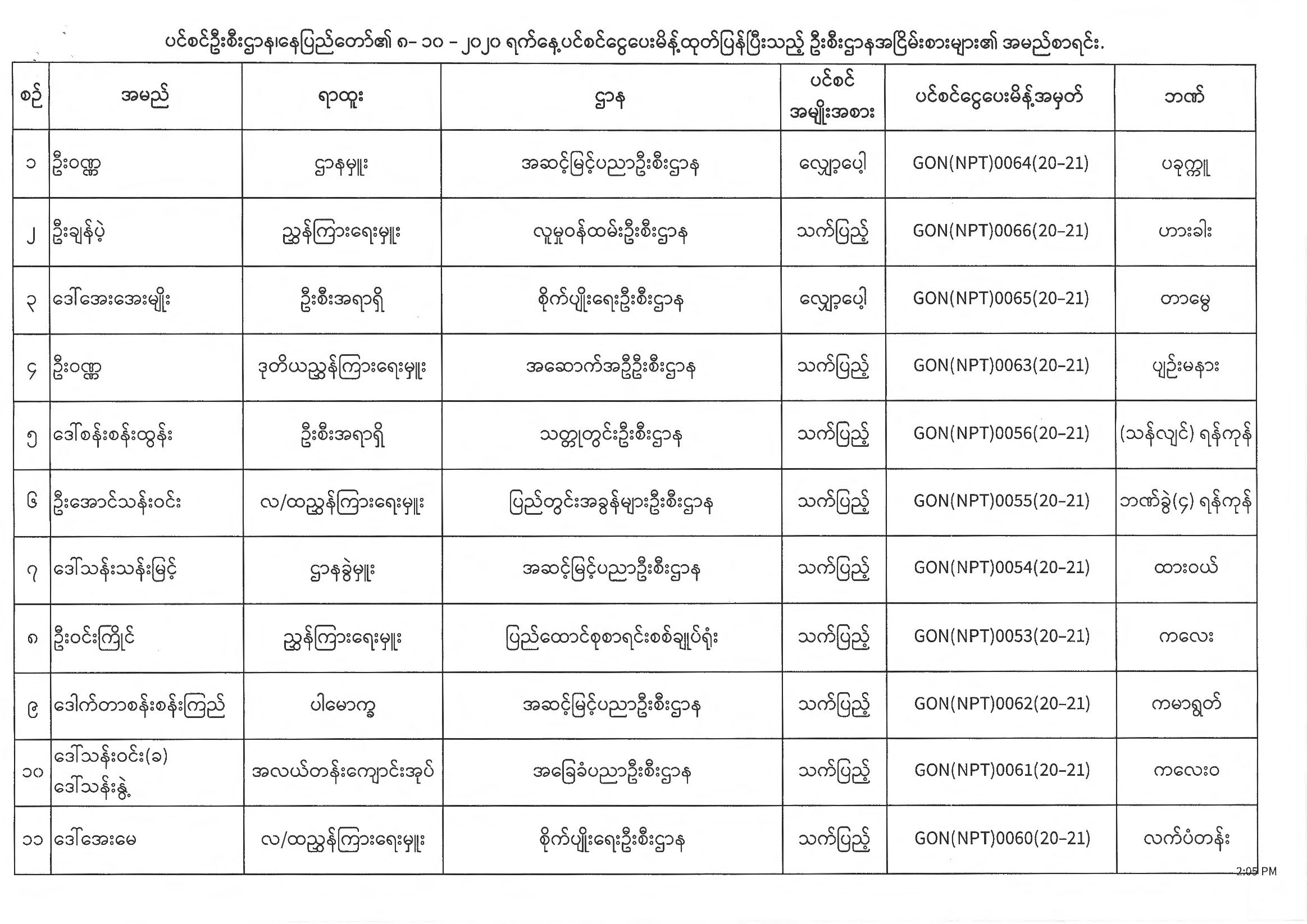 ပင်စင်ဦးစီးဌာန၊ နေပြည်တော်၏ (၅.၁၀.၂၀၂၀) မှ (၉.၁၀.၂၀၂၀) ရက်နေ့အထိ ပင်စင်ငွေပေးမိန့်ထုတ်ပြန်ပြီးသည့် ဦးစီးဌာနအငြိမ်းစားများ၏ အမည်စာရင်း pension_editor Tue, 10/13/2020 - 15:38