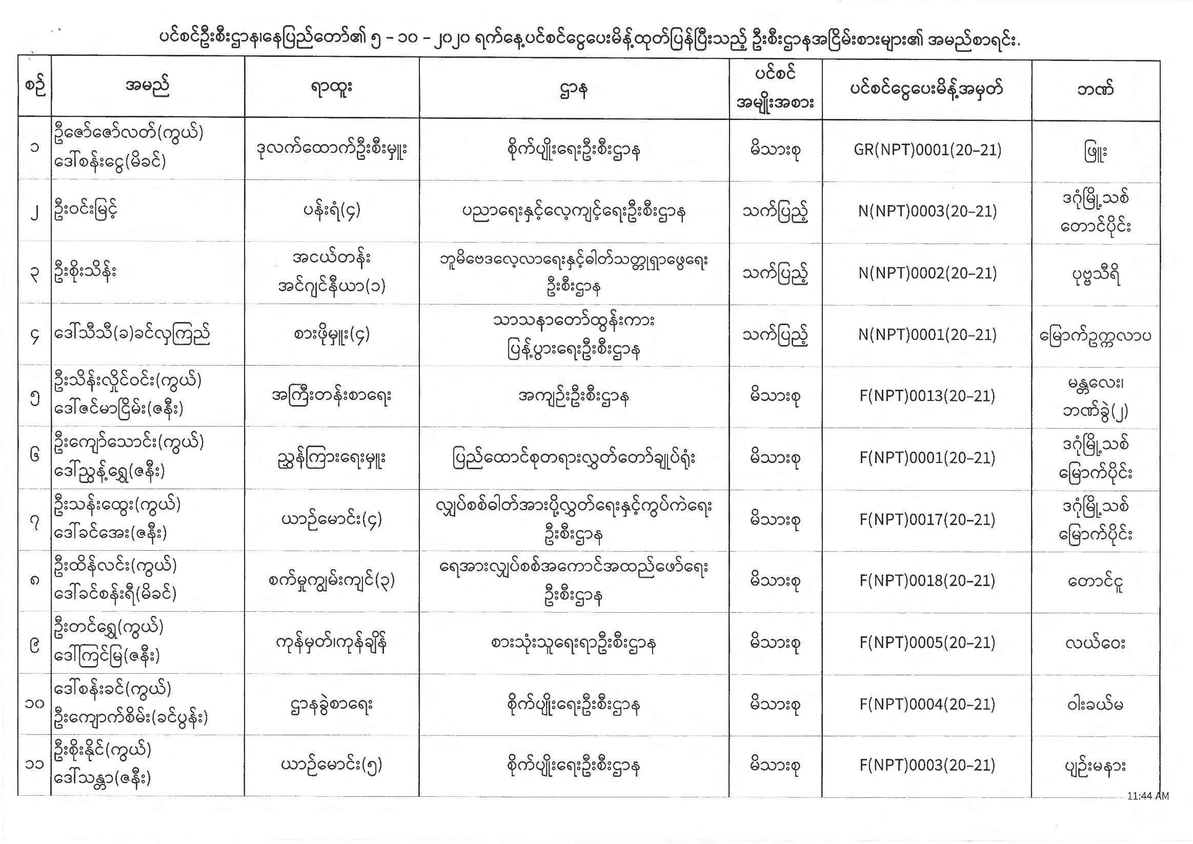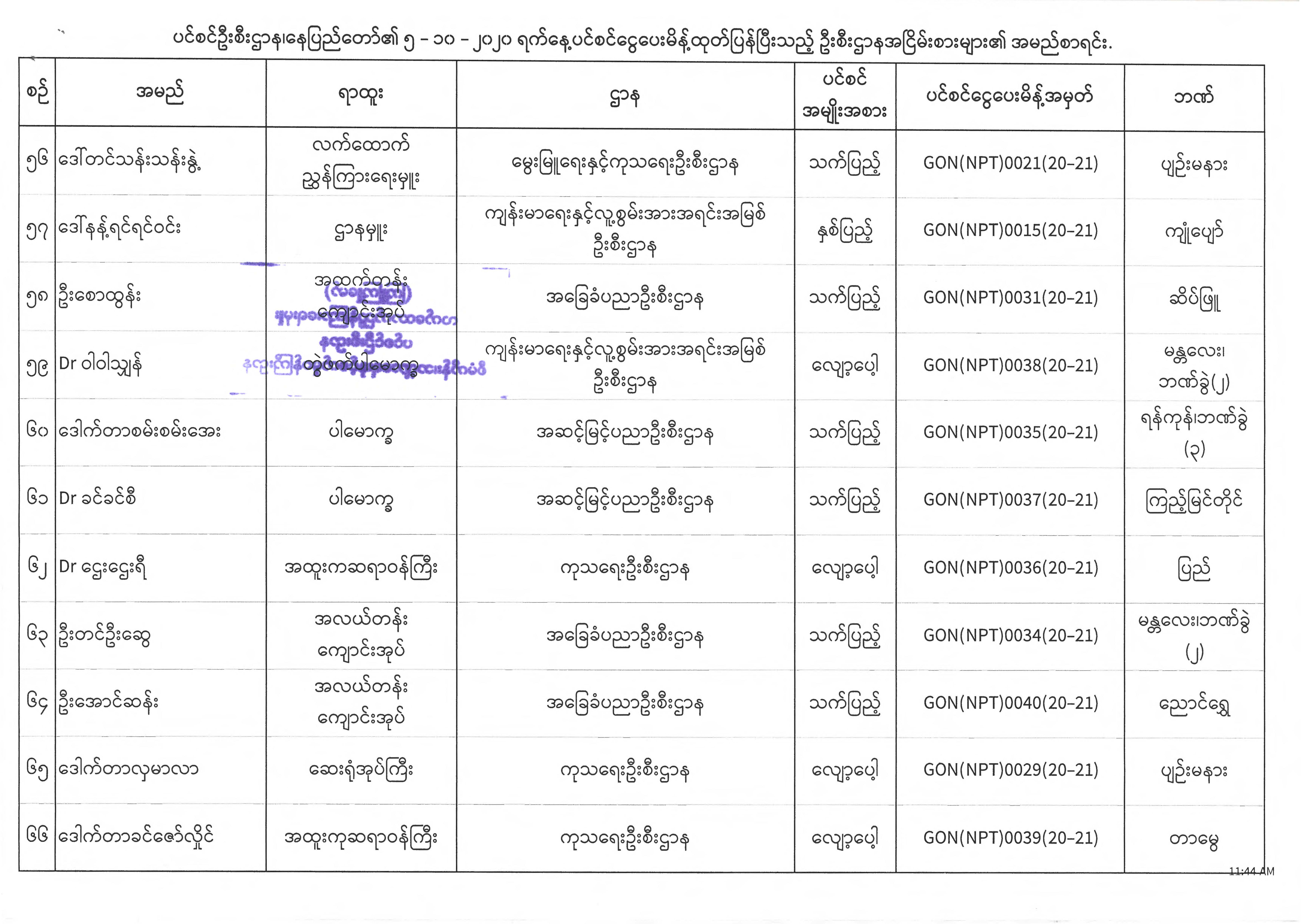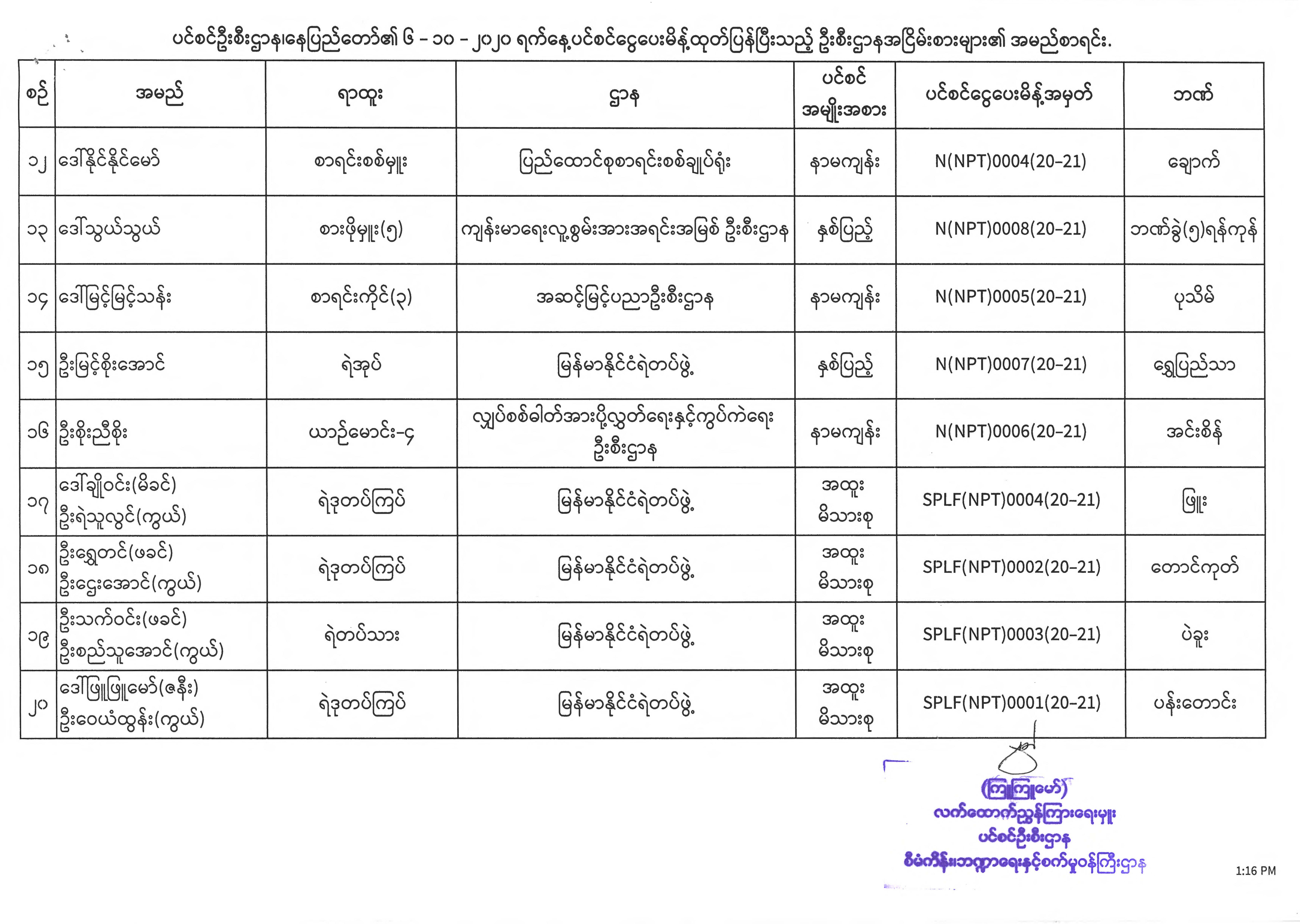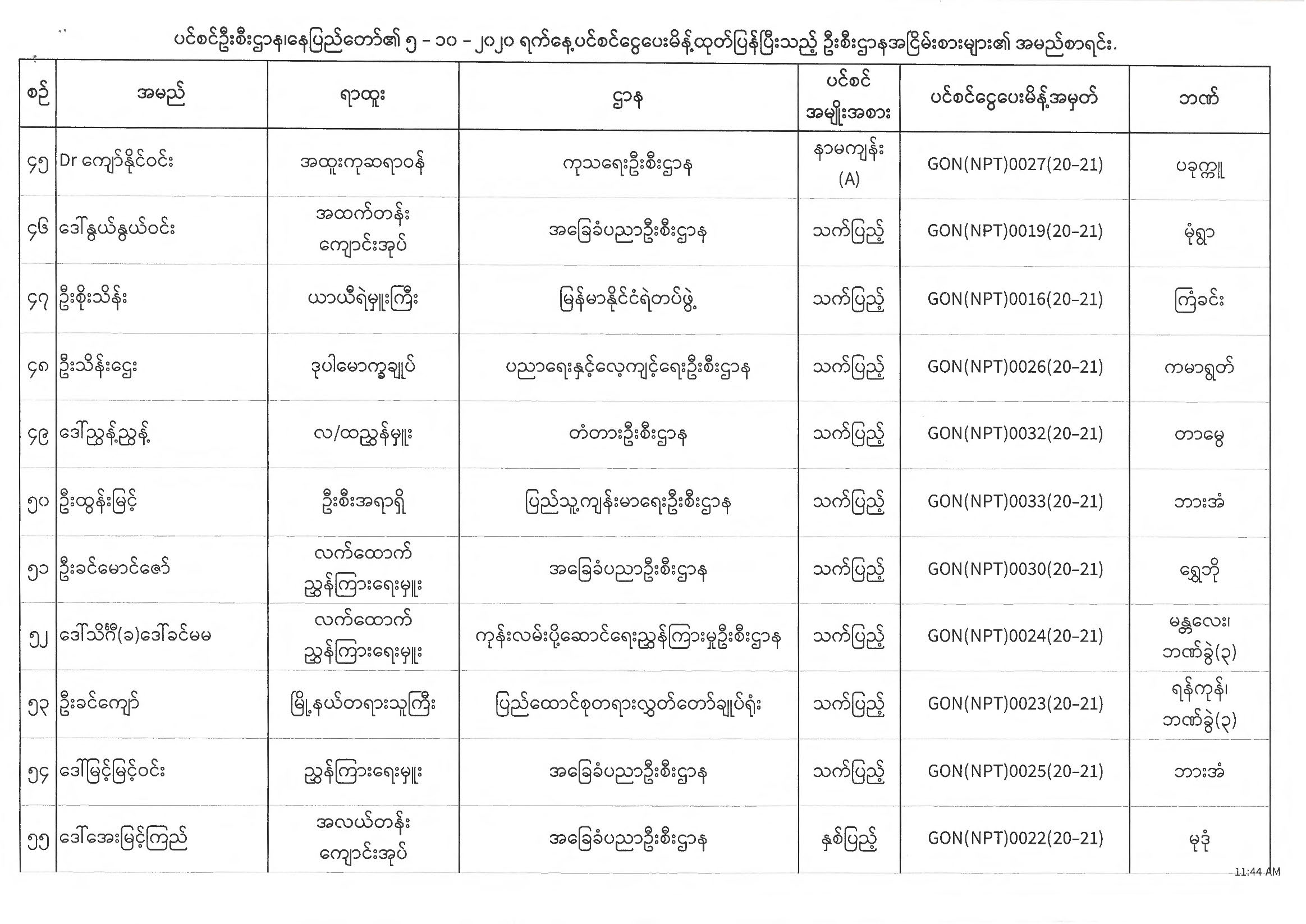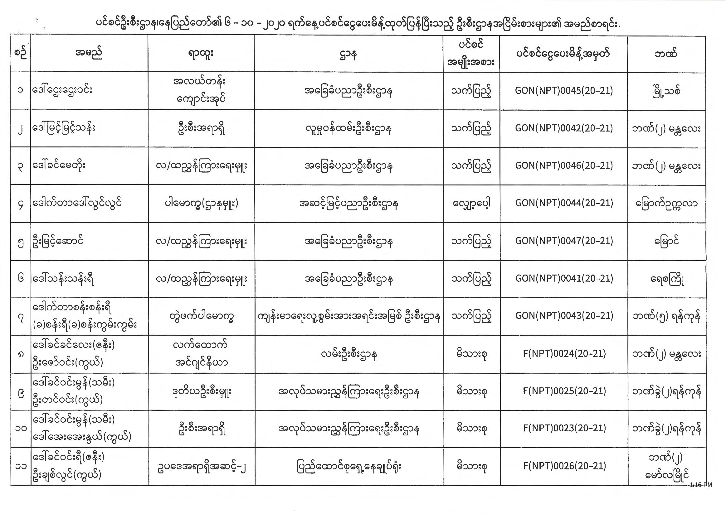 ပင်စင်ဦးစီးဌာန၊ နေပြည်တော်၏ (၅.၁၀.၂၀၂၀) မှ (၉.၁၀.၂၀၂၀) ရက်နေ့အထိ ပင်စင်ငွေပေးမိန့်ထုတ်ပြန်ပြီးသည့် ဦးစီးဌာနအငြိမ်းစားများ၏ အမည်စာရင်း pension_editor Tue, 10/13/2020 - 15:38