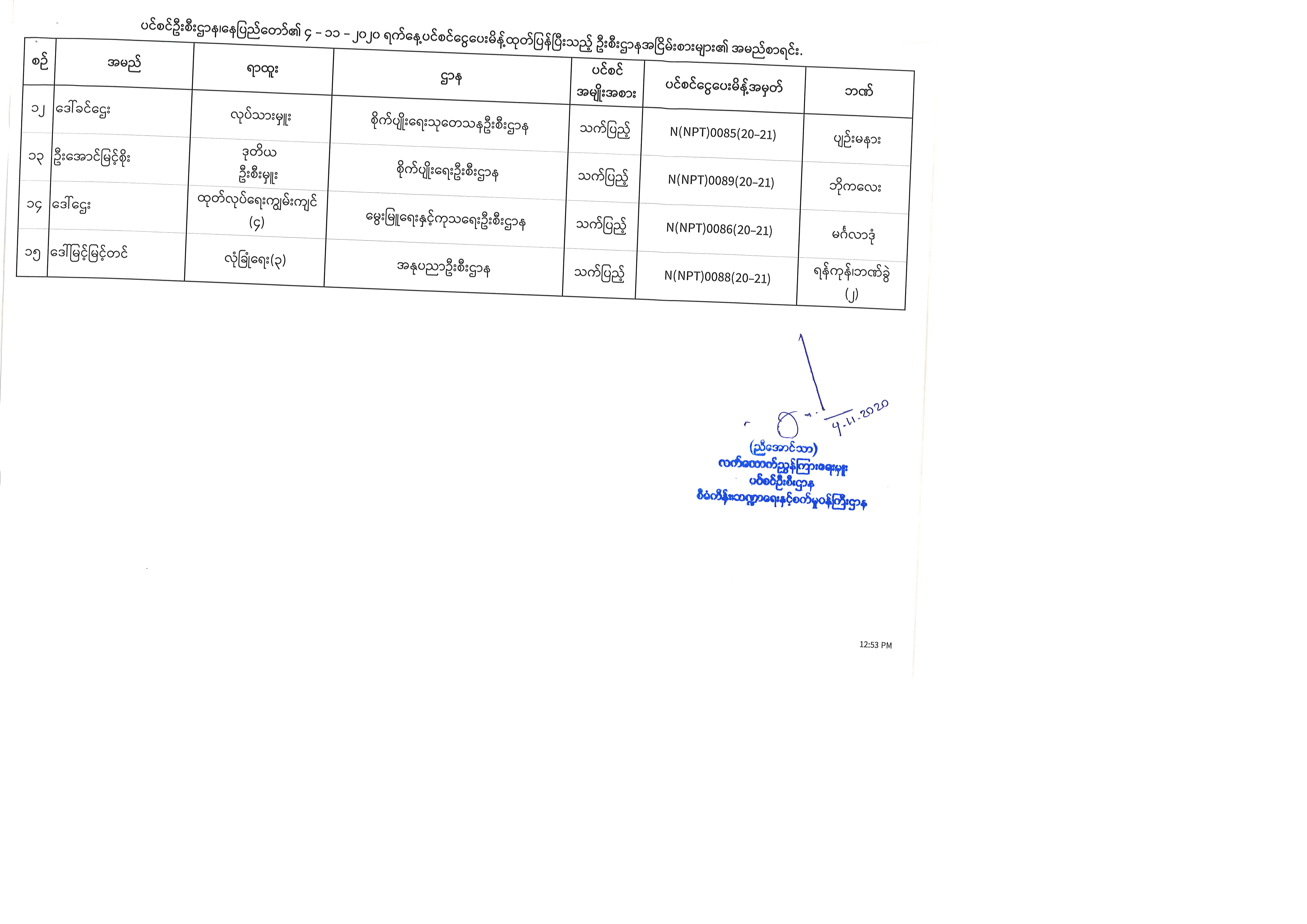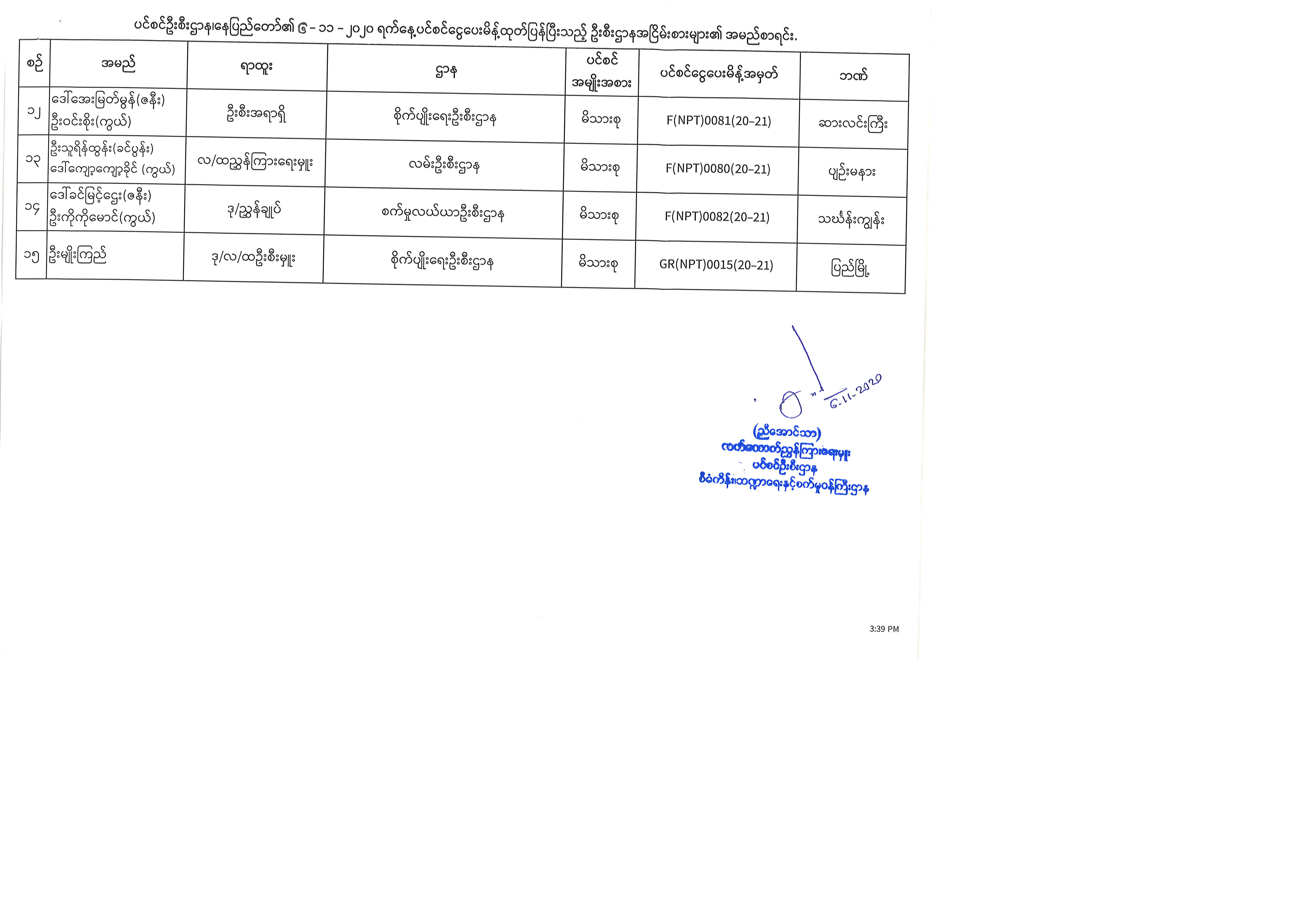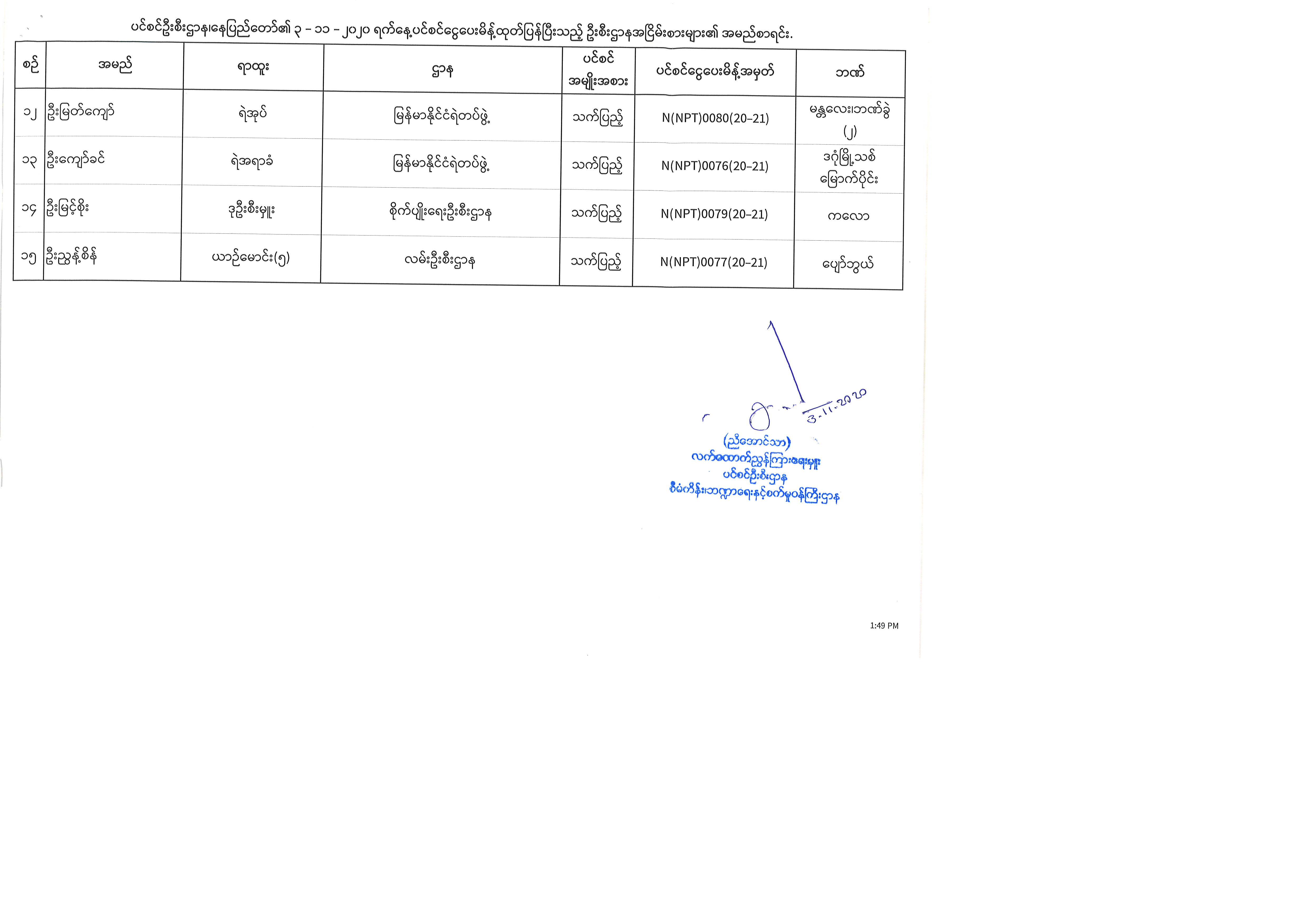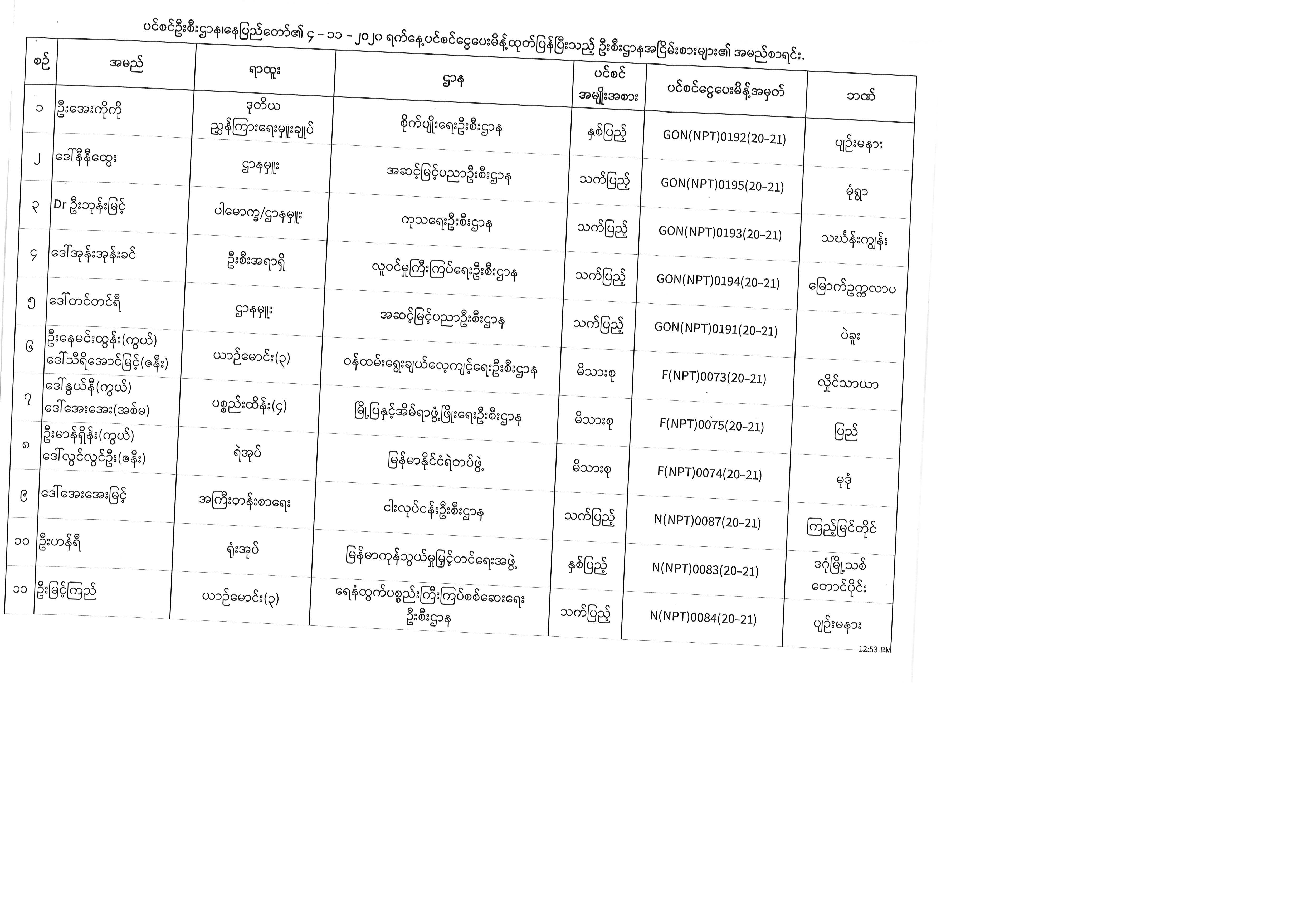 ပင်စင်ဦးစီးဌာန၊နေပြည်တော်၏ ၃-၁၁-၂၀၂၀ မှ ၆-၁၁-၂၀၂၀ နေ့အထိ ပင်စင်ငွေပေးမိန့်ထုတ်ပြန်ပြီးသည့် ဦးစီးဌာနအငြိမ်းစားများ၏ အမည်စာရင်း pension_editor Tue, 11/10/2020 - 14:39