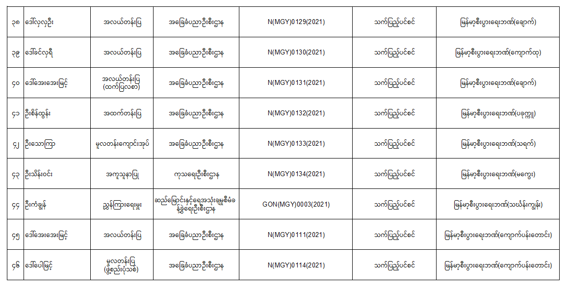ပင်စင်ဦးစီးဌာန၊ ရန်ကုန်တိုင်းဒေသကြီး၏ ငွေပေးမိန့်ထုတ်ပြန်ပြီးသည့် ဦးစီးဌာနအငြိမ်းစားစာရင်း (၂၆-၁၀-၂၀၂၁ မှ ၁၀-၁၁-၂၀၂၁) pension_editor Fri, 11/12/2021 - 09:49