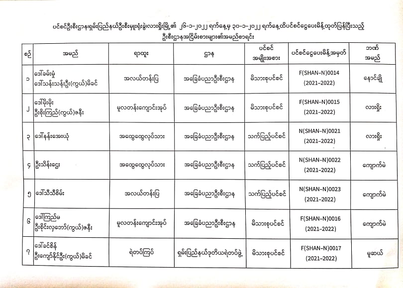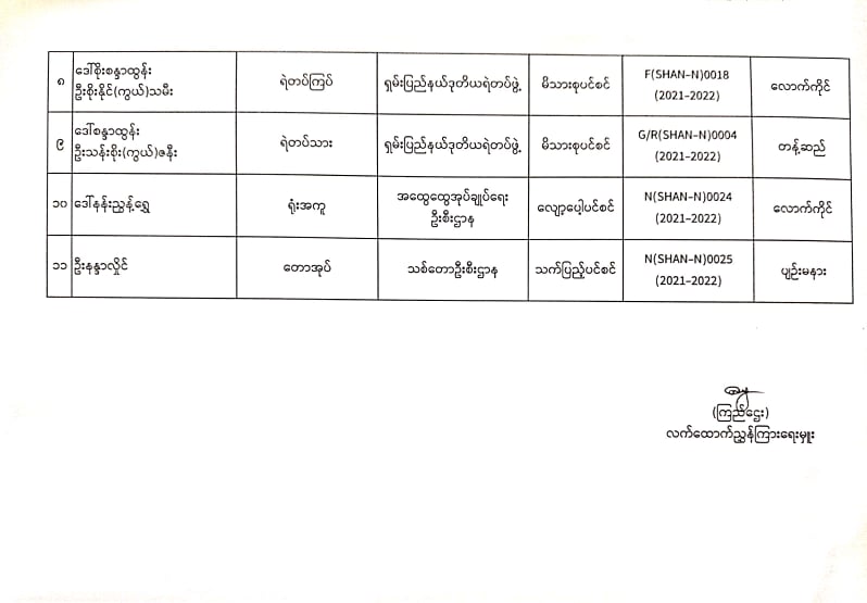 ပင်စင်ဦးစီးဌာန၊ ရှမ်းပြည်နယ်ရုံးခွဲ(လားရှိုးမြို့)၏ ငွေပေးမိန့်ထုတ်ပြန်မှုစာရင်း (၂၆-၁-၂၀၂၂ မှ ၃၀-၁-၂၀၂၂) pension_editor Fri, 01/28/2022 - 14:00