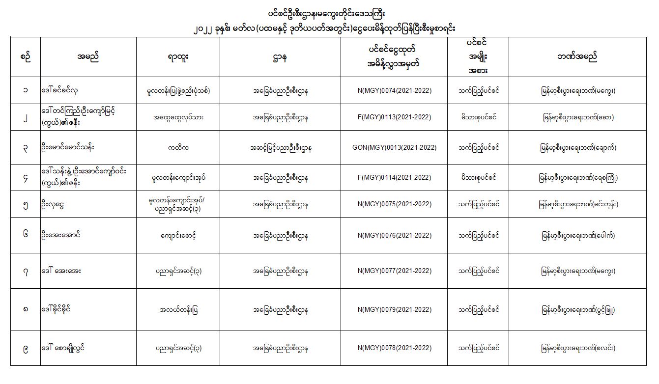 ပင်စင်ဦးစီးဌာန၊ မကွေးတိုင်းဒေသကြီးဦးစီးမှူးရုံး၏ ငွေပေးမိန့်ထုတ်ပြန်မှုစာရင်း (မတ်လ ပထမအပတ်နှင့် ဒုတိယအပတ်အတွင်း) pension_editor Thu, 03/17/2022 - 14:55