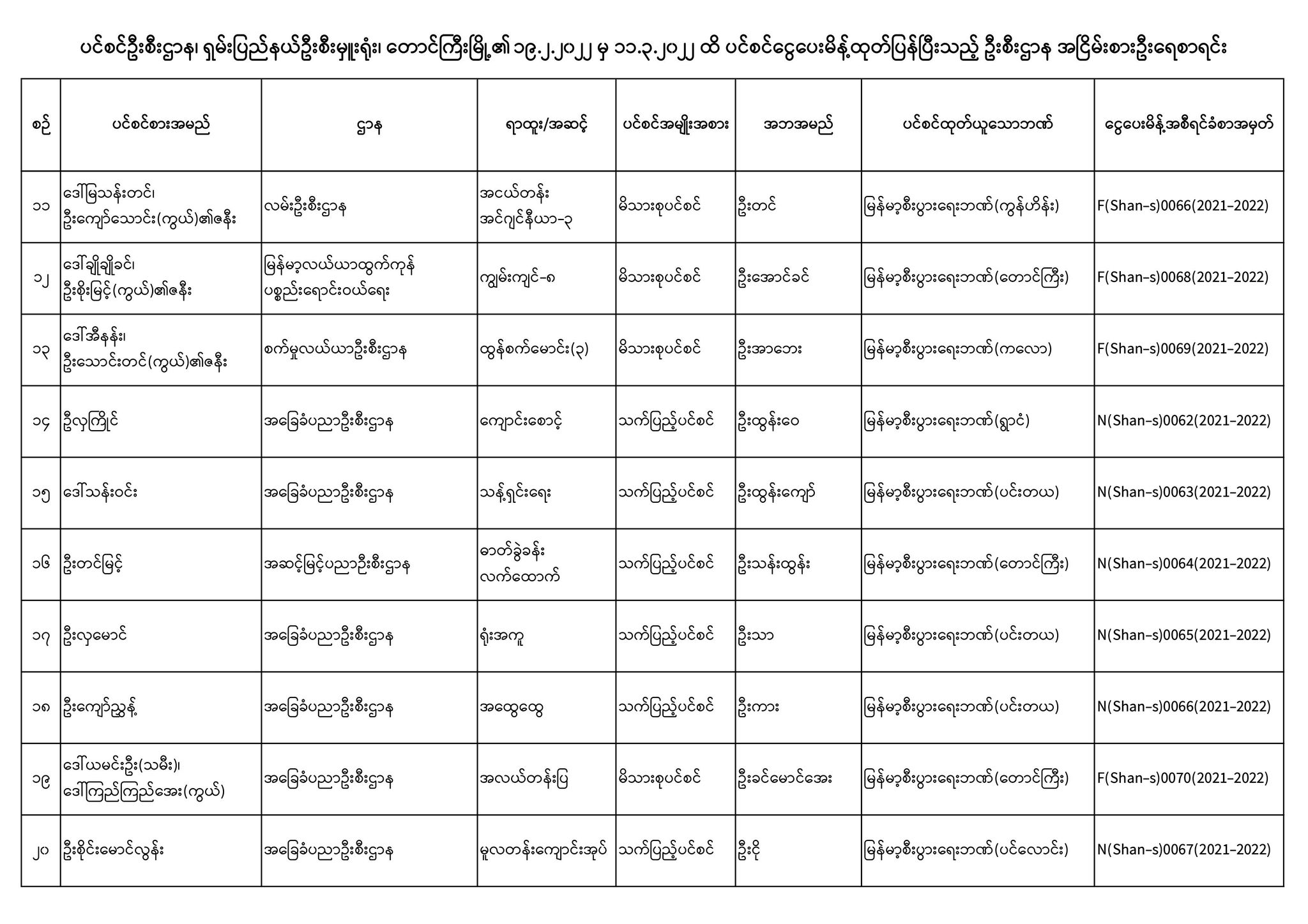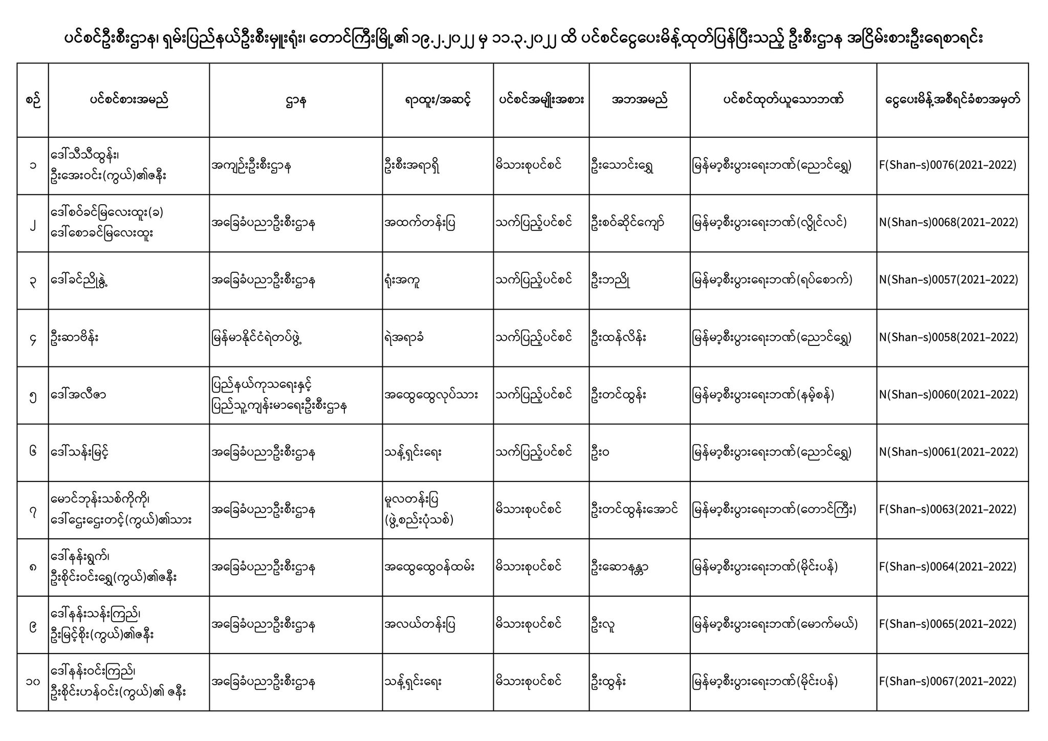 ပင်စင်ဦးစီးဌာန၊ ရှမ်းပြည်နယ်ဦးစီးမှူးရုံး၏ ငွေပေးမိန့်ထုတ်ပြန်မှုစာရင်း (၁၉-၂-၂၀၂၂ မှ ၁၁-၃-၂၀၂၂) pension_editor Fri, 03/18/2022 - 14:06