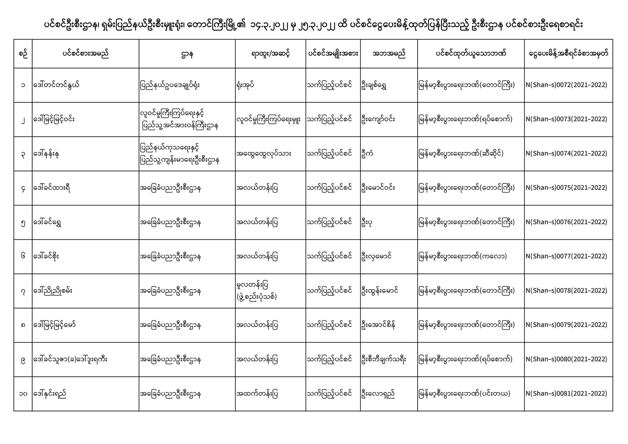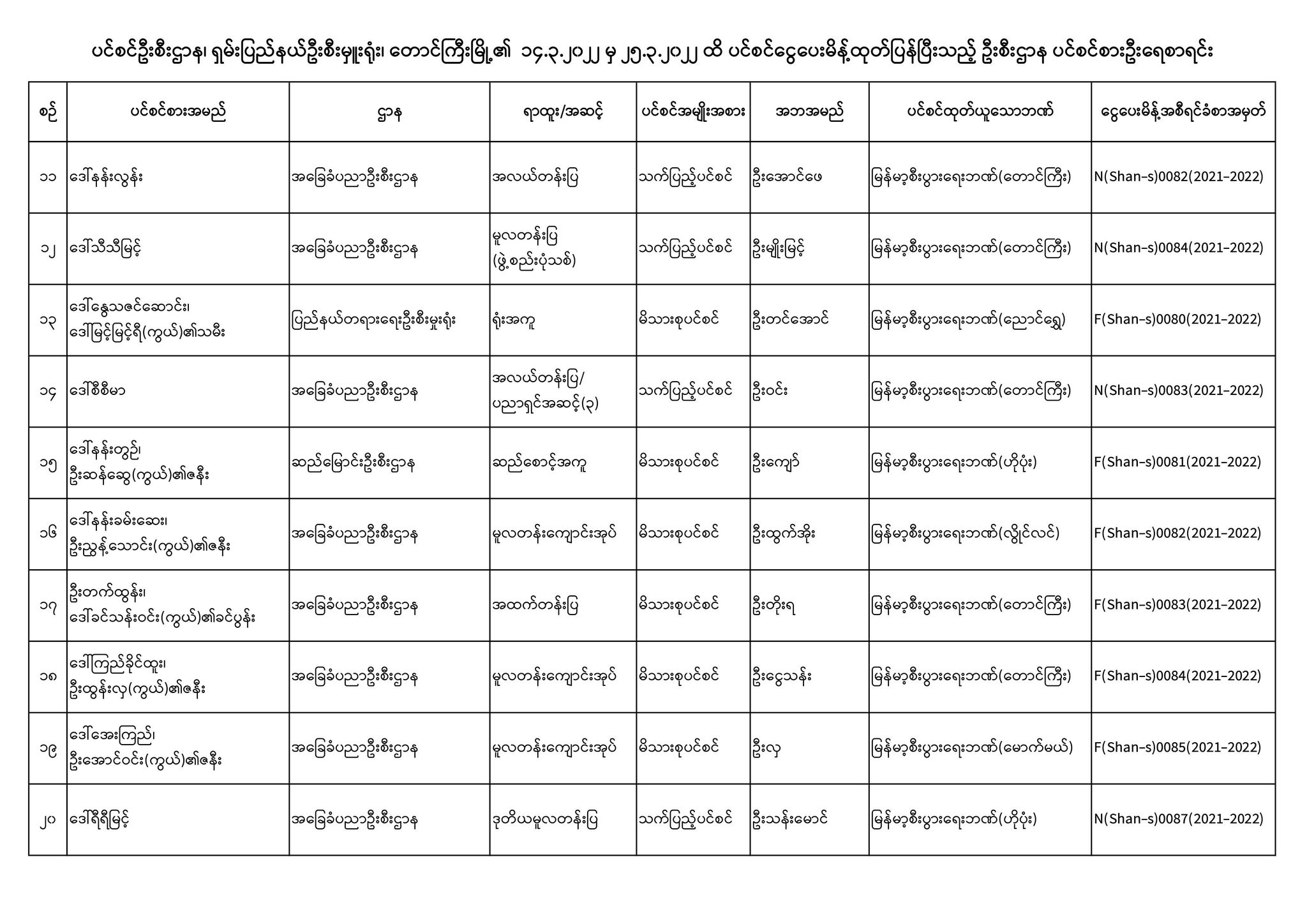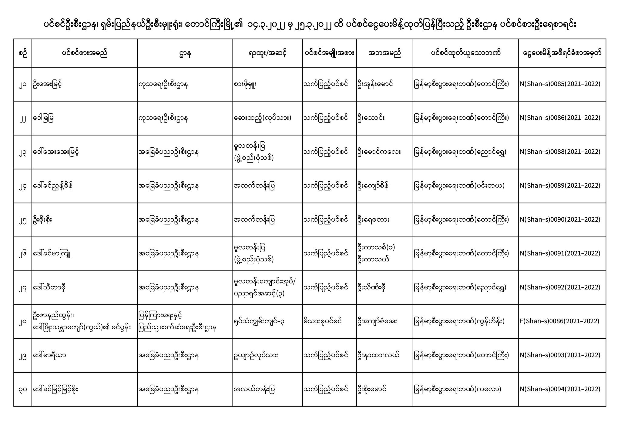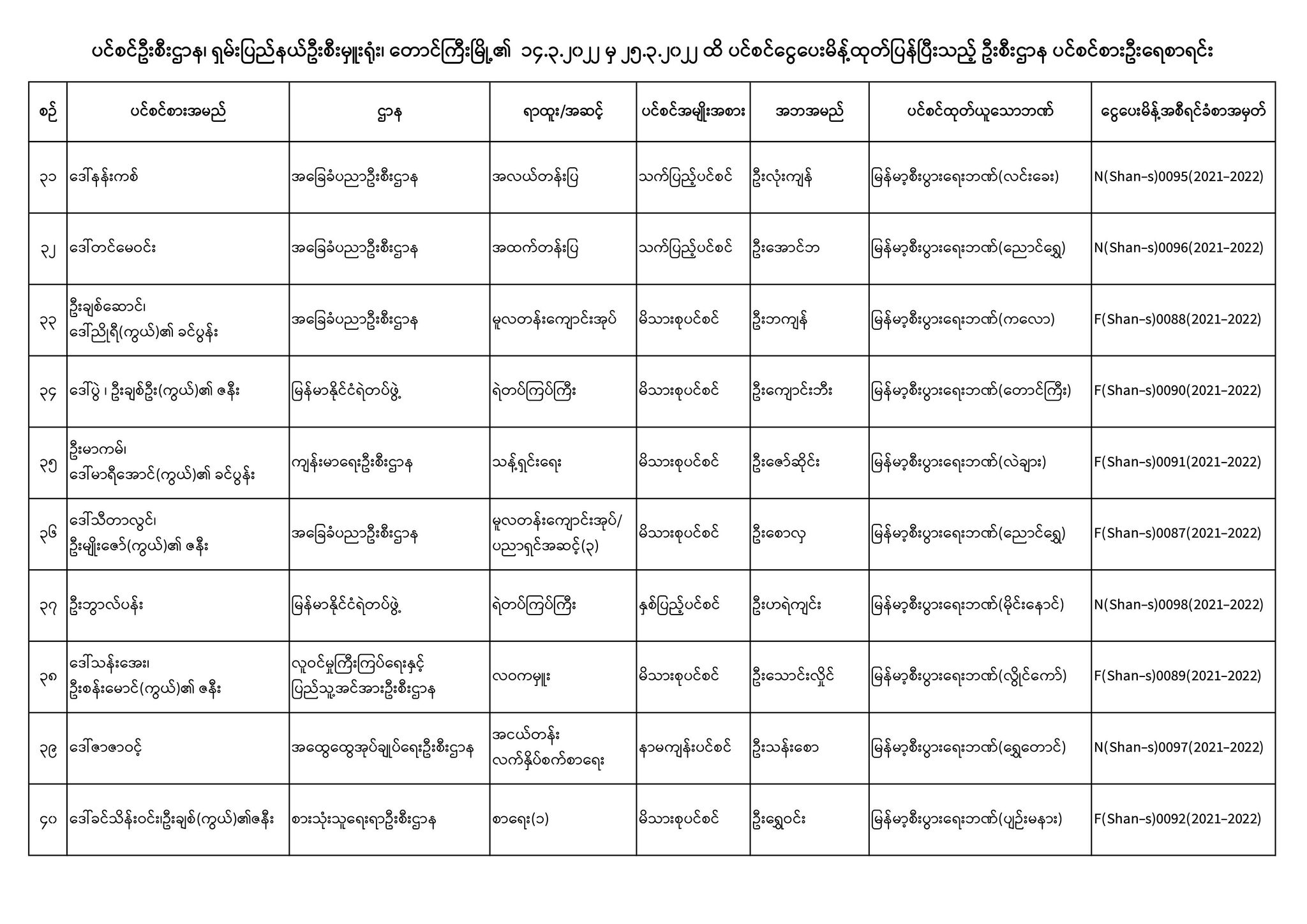 ပင်စင်ဦးစီးဌာန၊ ရှမ်းပြည်နယ်ဦးစီးမှူးရုံး၏ ငွေပေးမိန့်ထုတ်ပြန်မှုစာရင်း (၁၄-၃-၂၀၂၂ မှ ၂၅-၃-၂၀၂၂) pension_editor Thu, 04/07/2022 - 12:25