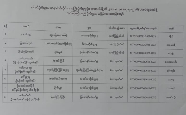 ပင်စင်ဦးစီးဌာန၊ တနင်္သာရီတိုင်းဒေသကြီးဦးစီးမှူးရုံး၏ ငွေပေးမိန့်ထုတ်ပြန်မှုစာရင်း (၂-၄-၂၀၂၂ မှ ၈-၄-၂၀၂၂) pension_editor Thu, 04/07/2022 - 16:22