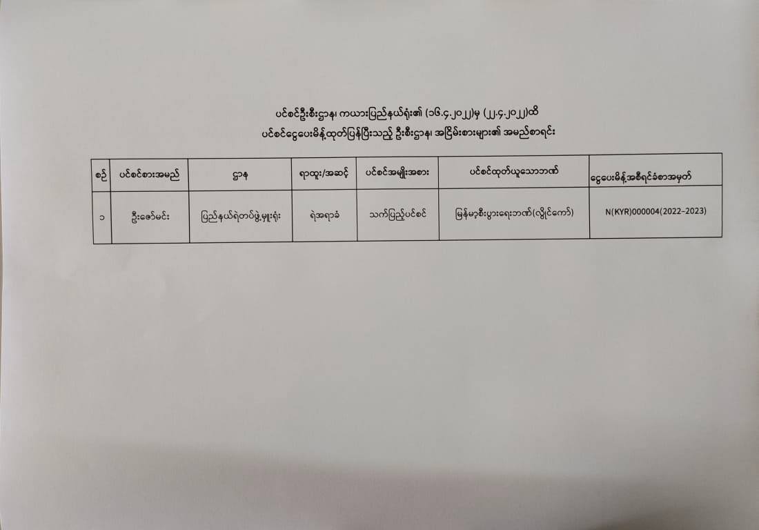 ပင်စင်ဦးစီးဌာန၊ ကယားပြည်နယ်ဦးစီးမှူးရုံး၏ ငွေပေးမိန့်ထုတ်ပြန်မှုစာရင်း (၁၆-၄-၂၀၂၂ မှ ၂၂-၄-၂၀၂၂) pension_editor Fri, 04/22/2022 - 14:27