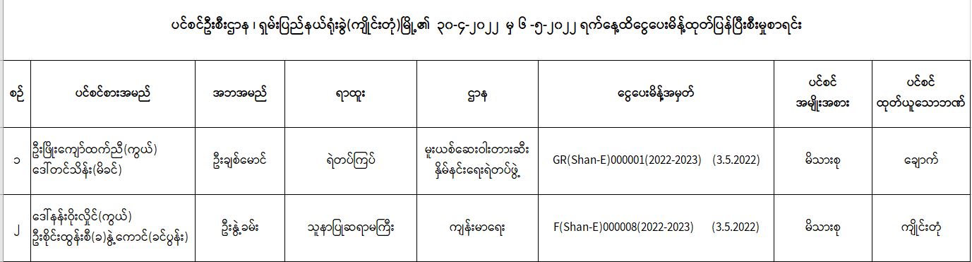 ပင်စင်ဦးစီးဌာန၊ ရှမ်းပြည်နယ်ရုံးခွဲ(ကျိုင်းတုံမြို့)၏ ငွေပေးမိန့်ထုတ်ပြန်မှုစာရင်း (၃၀-၄-၂၀၂၂ မှ ၆-၅-၂၀၂၂) pension_editor Mon, 05/09/2022 - 12:43