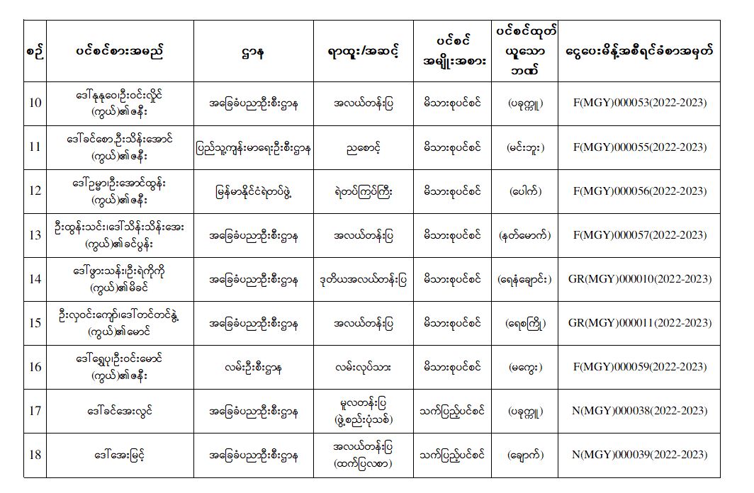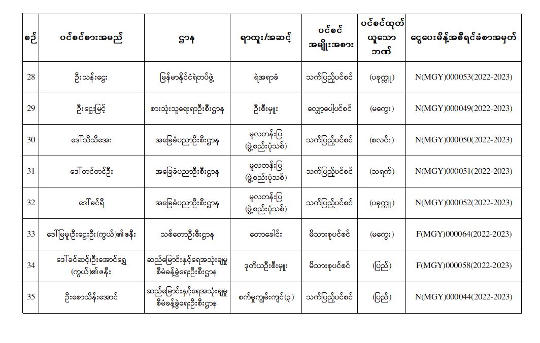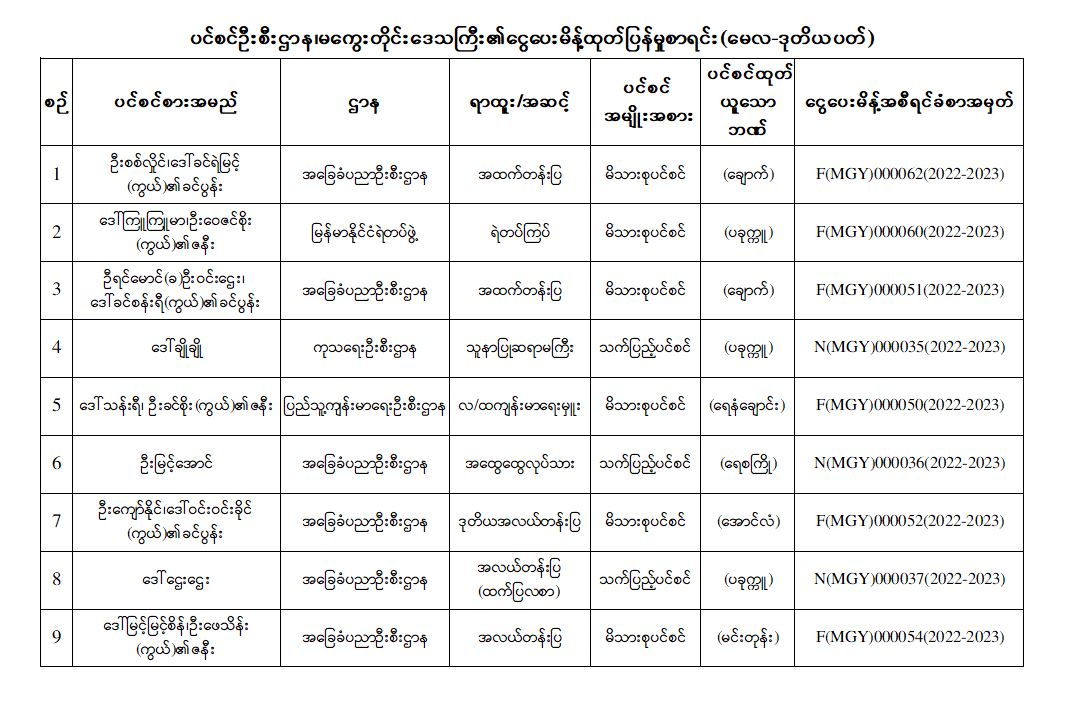 ပင်စင်ဦးစီးဌာန၊ မကွေးတိုင်းဒေသကြီးဦးစီးမှူးရုံး၏ ငွေပေးမိန့်ထုတ်ပြန်မှုစာရင်း (မေလ ဒုတိယအပတ်အတွင်း) pension_editor Wed, 05/11/2022 - 15:54