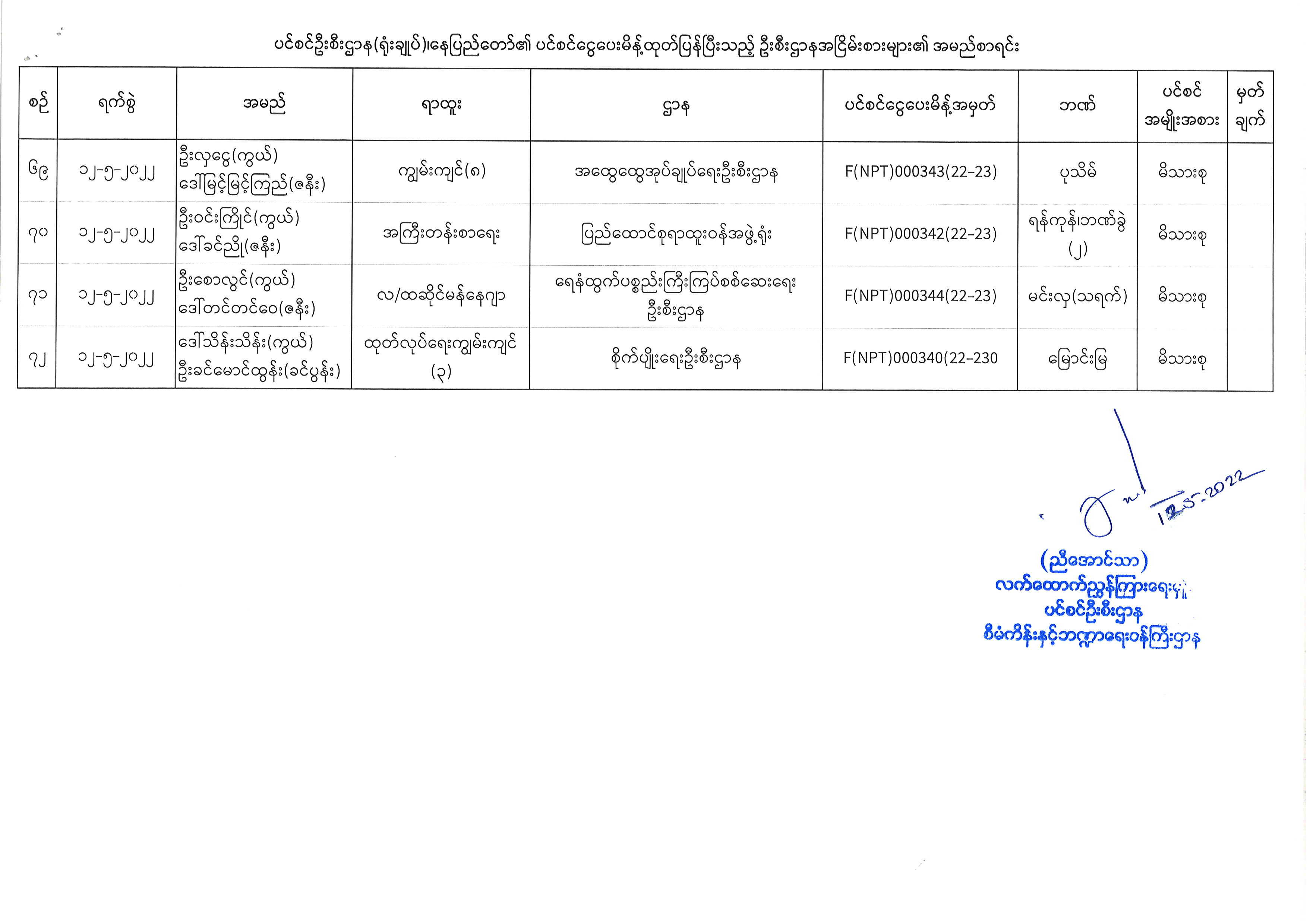 ပင်စင်ဦးစီးဌာန၊ နေပြည်တော်၏ ငွေပေးမိန့်ထုတ်ပြန်မှုစာရင်း (၁၂-၅-၂၀၂၂) pension_editor Mon, 05/16/2022 - 10:29