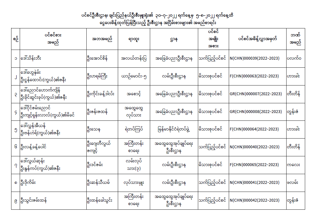 ပင်စင်ဦးစီးဌာန၊ ချင်းပြည်နယ်ဦးစီးမှူးရုံး၏ ငွေပေးမိန့်ထုတ်ပြန်မှုစာရင်း (၇-၅-၂၀၂၂ မှ ၁၃-၅-၂၀၂၂) pension_editor Mon, 05/16/2022 - 10:37