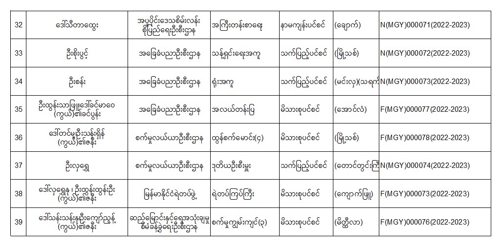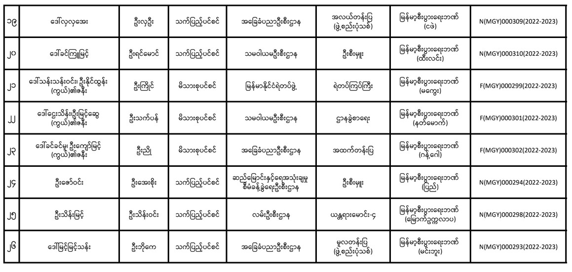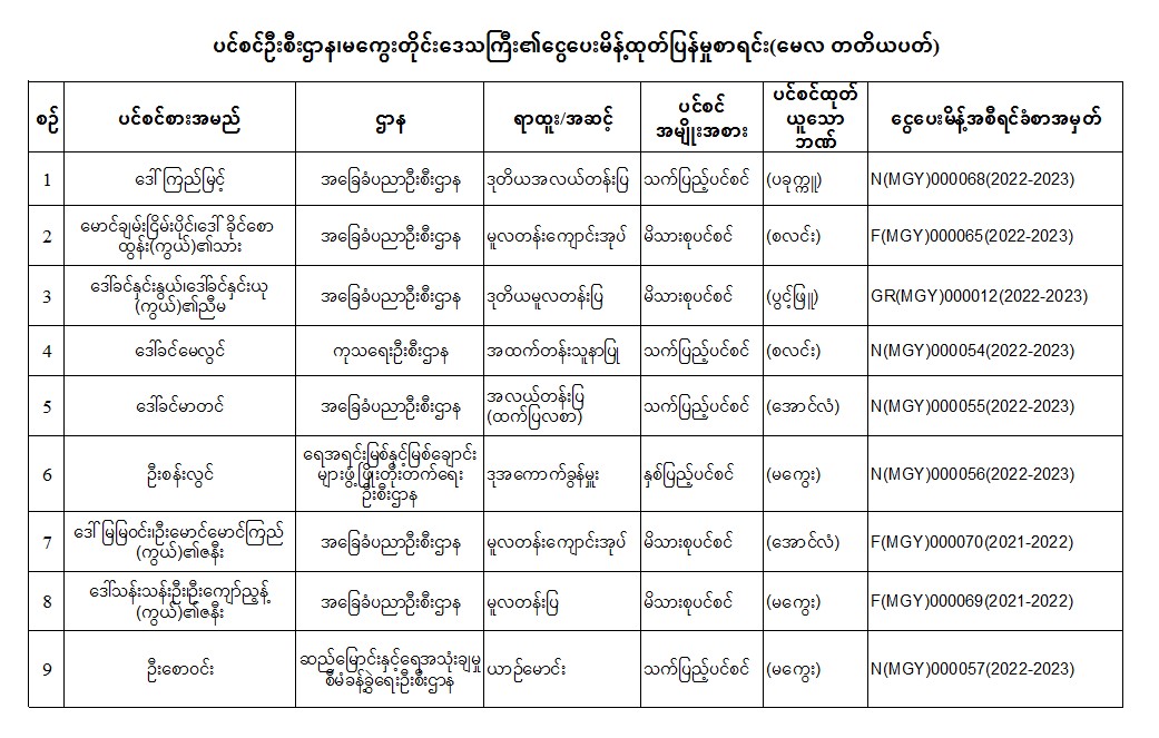 ပင်စင်ဦးစီးဌာန၊ မကွေးတိုင်းဒေသကြီးဦးစီးမှူးရုံး၏ ငွေပေးမိန့်ထုတ်ပြန်မှုစာရင်း (မေလ တတိယပတ်အတွင်း) pension_editor Tue, 05/17/2022 - 16:33