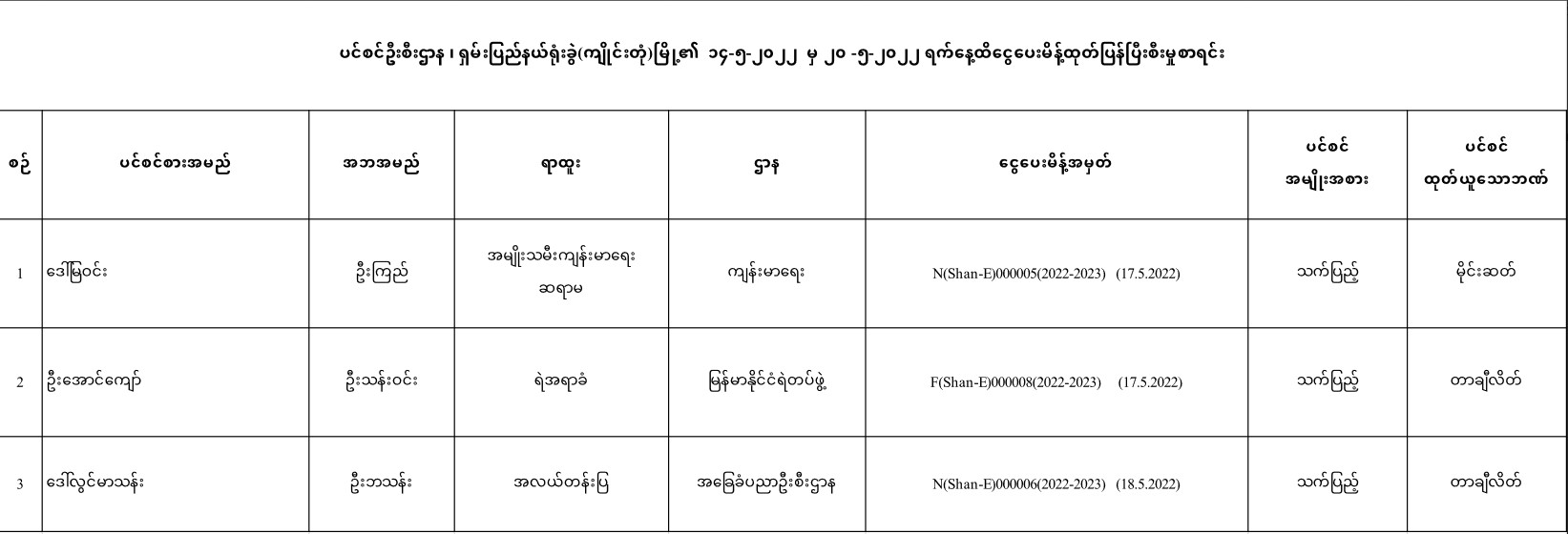 ပင်စင်ဦးစီးဌာန၊ ရှမ်းပြည်နယ်ရုံးခွဲ(ကျိုင်းတုံမြို့)၏ ငွေပေးမိန့်ထုတ်ပြန်မှုစာရင်း (၁၄-၅-၂၀၂၂ မှ ၂၀-၅-၂၀၂၂) pension_editor Thu, 05/19/2022 - 15:00