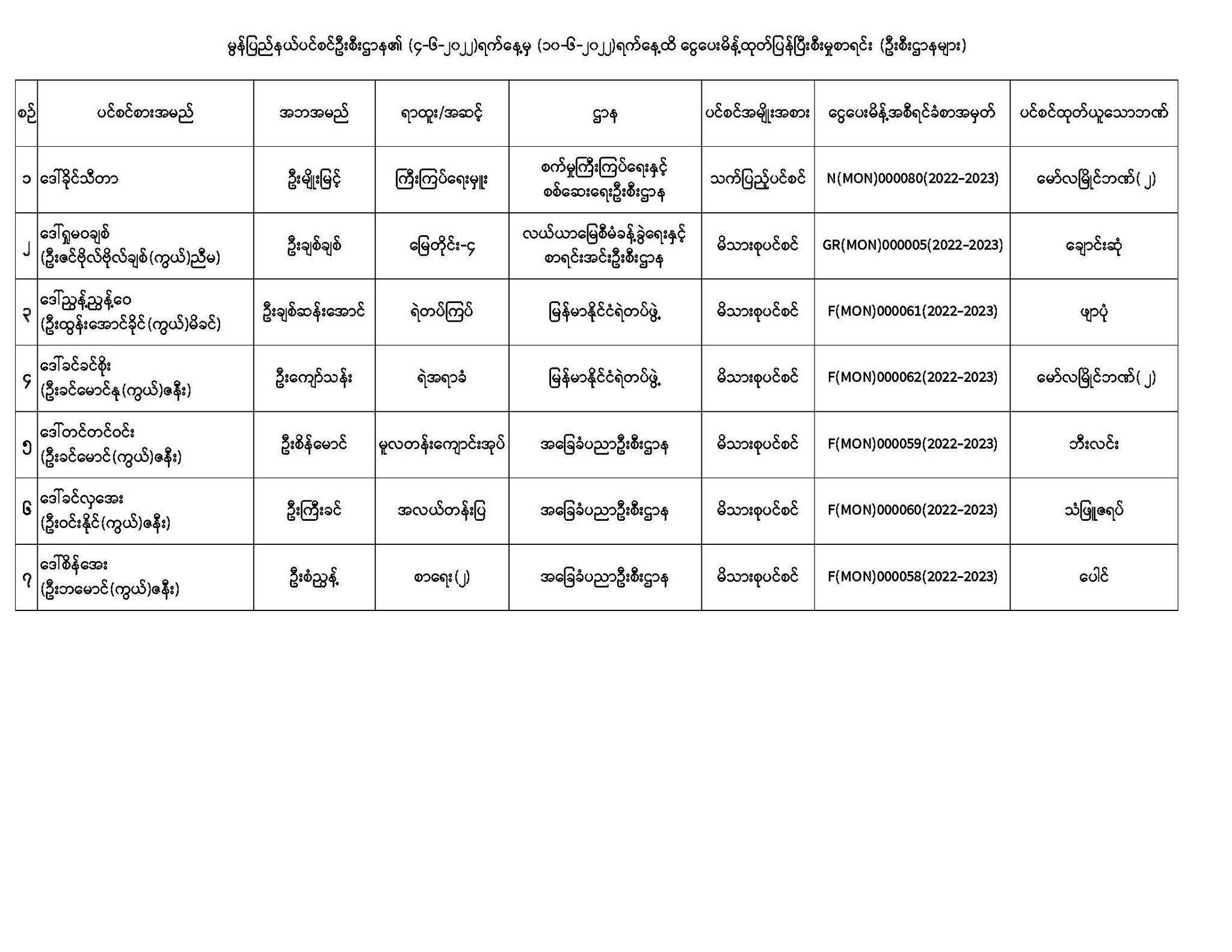 ပင်စင်ဦးစီးဌာန၊ မွန်ပြည်နယ်ဦးစီးမှူးရုံး၏ ငွေပေးမိန့်ထုတ်ပြန်မှုစာရင်း (၄-၆-၂၀၂၂ မှ ၁၀-၆-၂၀၂၂) pension_editor Tue, 06/14/2022 - 15:33