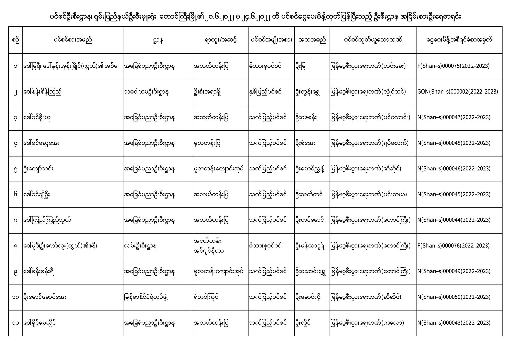 ပင်စင်ဦးစီးဌာန၊ ရှမ်းပြည်နယ် (တောင်ကြီး)၏ ငွေပေးမိန့်ထုတ်ပြန်မှုစာရင်း (၂၀-၆-၂၀၂၂ မှ ၂၄-၆-၂၀၂၂) pension_editor Fri, 06/24/2022 - 13:38