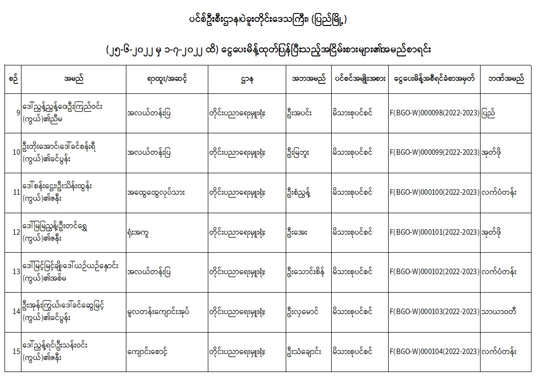ပင်စင်ဦးစီးဌာန၊ ပဲခူးတိုင်းဒေသကြီး (ပြည်)၏ ငွေပေးမိန့်ထုတ်ပြန်မှုစာရင်း (၂၅-၆-၂၀၂၂ မှ ၁-၇-၂၀၂၂) pension_editor Fri, 07/01/2022 - 12:03