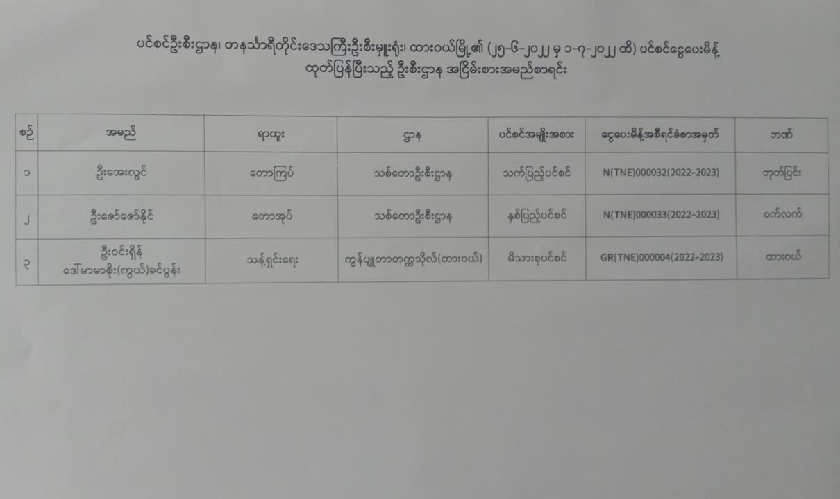 ပင်စင်ဦးစီးဌာန၊တနင်္သာရီတိုင်း၏ငွေပေးမိန့်ထုတ်ပြန်မှုစာရင်း (၂၅-၆-၂၀၂၂ မှ ၁-၇-၂၀၂၂) pension_editor Fri, 07/01/2022 - 12:22
