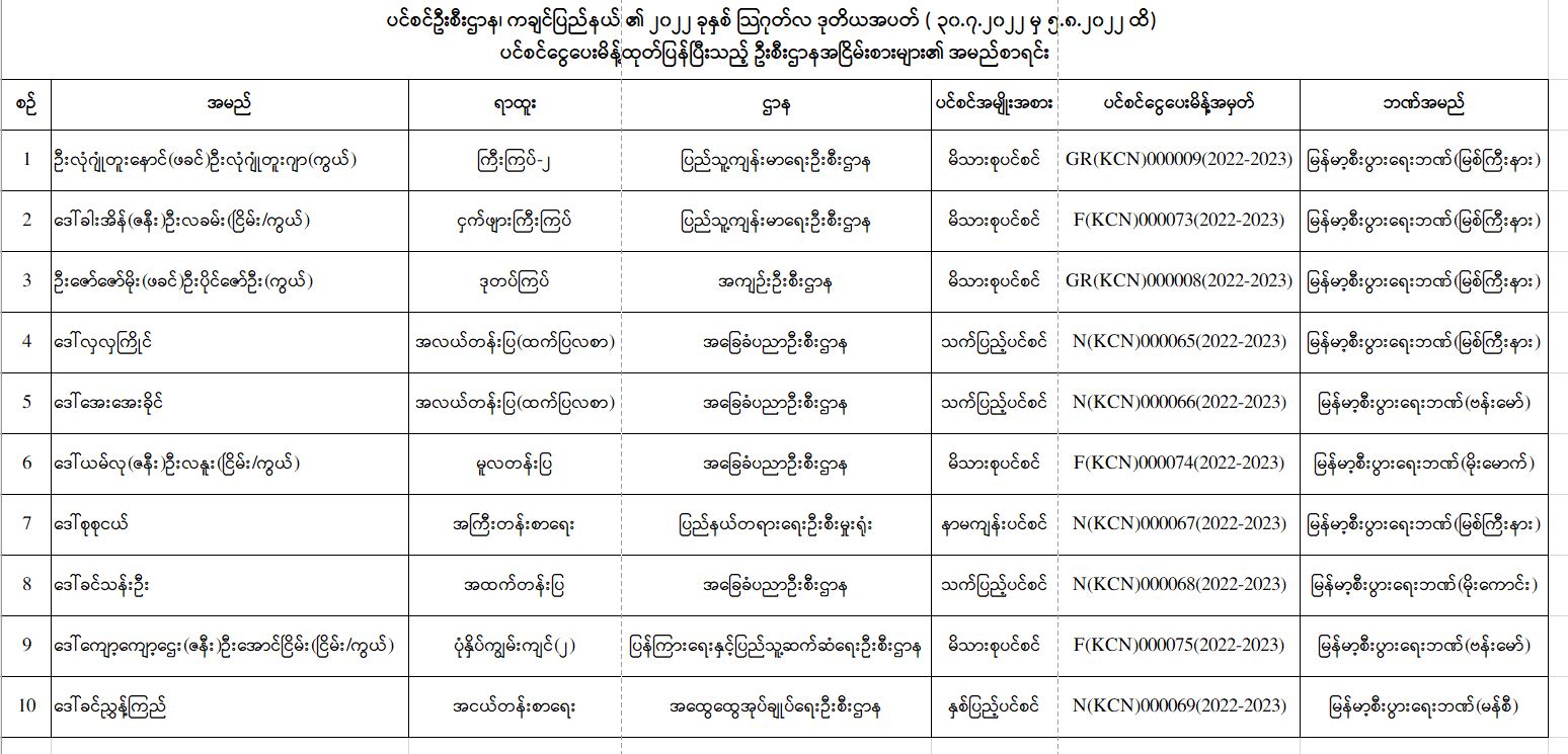 ပင်စင်ဦးစီးဌာန၊ ကချင်ပြည်နယ်ဦးစီးမှူးရုံး၏ ငွေပေးမိန့်ထုတ်ပြန်မှုစာရင်း ငွေပေးမိန့်ထုတ်ပြန်မှု စာရင်း ( ၃၀.၇.၂၀၂၂ မှ ၅.၈.၂၀၂၂ ထိ) pension_editor Tue, 08/09/2022 - 10:28