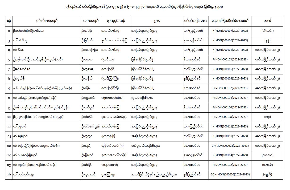 ပင်စင်ဦးစီးဌာန၊ မွန်ပြည်နယ်ဦးစီးမှူးရုံး၏ ငွေပေးမိန့်ထုတ်ပြန်မှုစာရင်း (၃၀-၇-၂၀၂၂ မှ ၅-၈-၂၀၂၂) pension_editor Tue, 08/09/2022 - 10:38