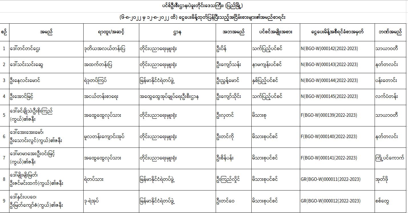 ပင်စင်ဦးစီးဌာန၊ ပဲခူးတိုင်းရုံးခွဲ(ပြည်မြို့)၏ ငွေပေးမိန့်ထုတ်ပြန်မှုစာရင်း (၆-၈-၂၀၂၂ မှ ၁၂-၈-၂၀၂၂) pension_editor Mon, 08/15/2022 - 11:01