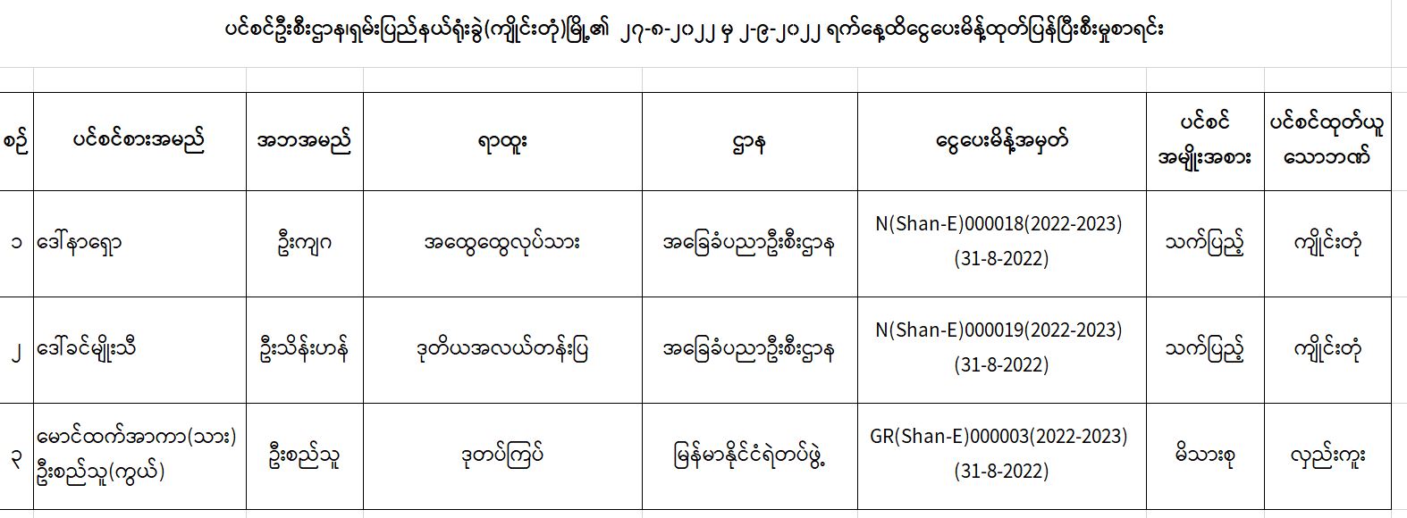 ပင်စင်ဦးစီးဌာန၊ ရှမ်းပြည်နယ်ရုံးခွဲ(ကျိုင်းတုံမြို့)၏ ငွေပေးမိန့်ထုတ်ပြန်မှုစာရင်း (၂၇-၈-၂၀၂၂ မှ ၂-၉-၂၀၂၂) pension_editor Tue, 09/06/2022 - 11:35
