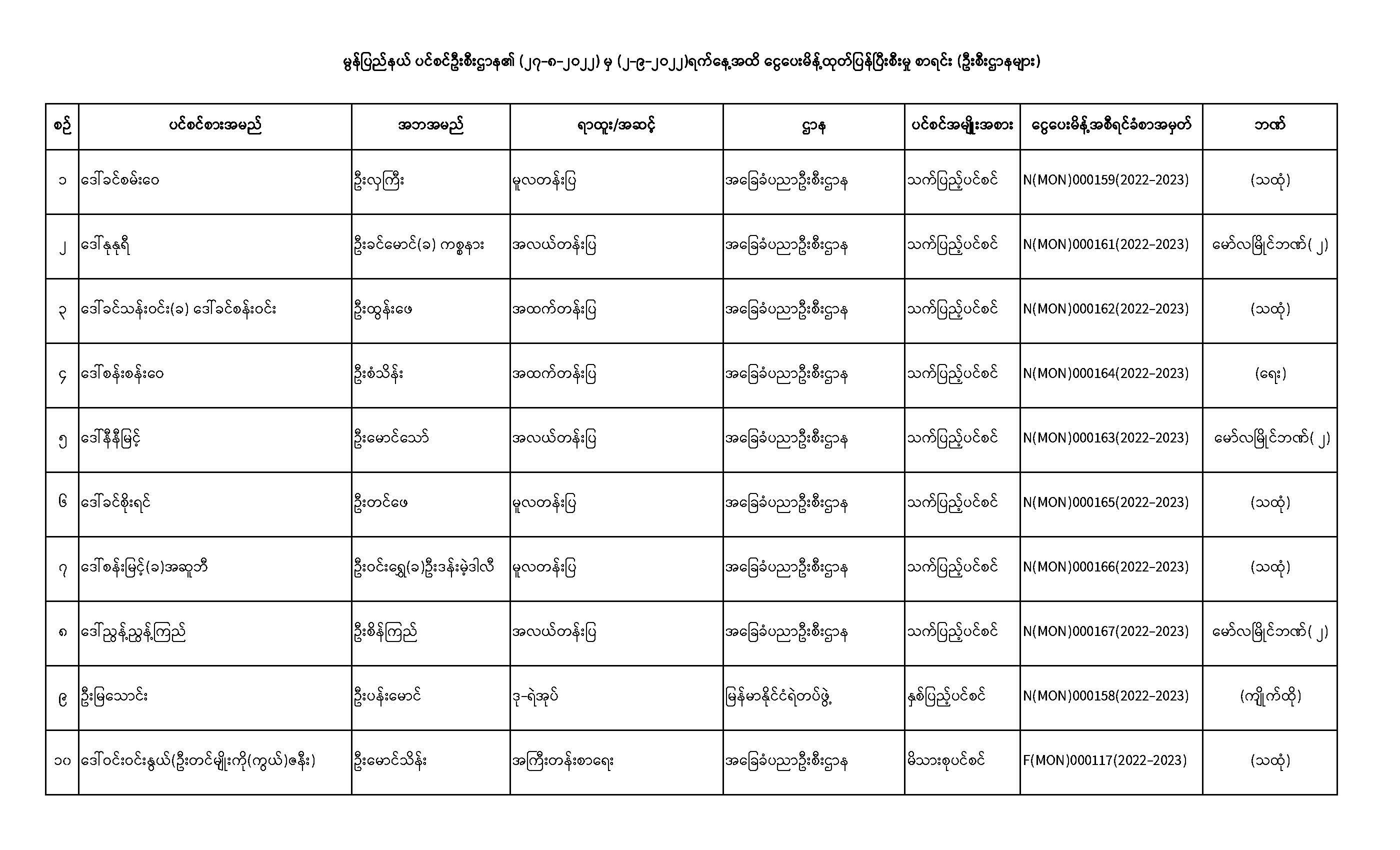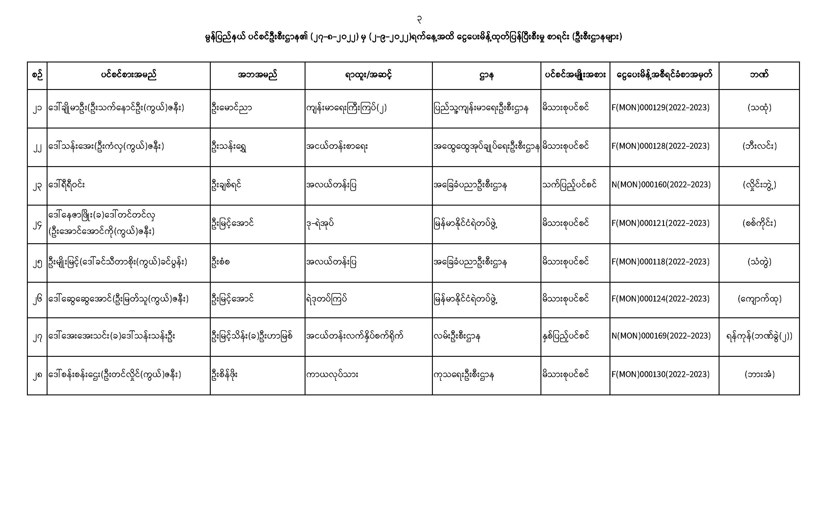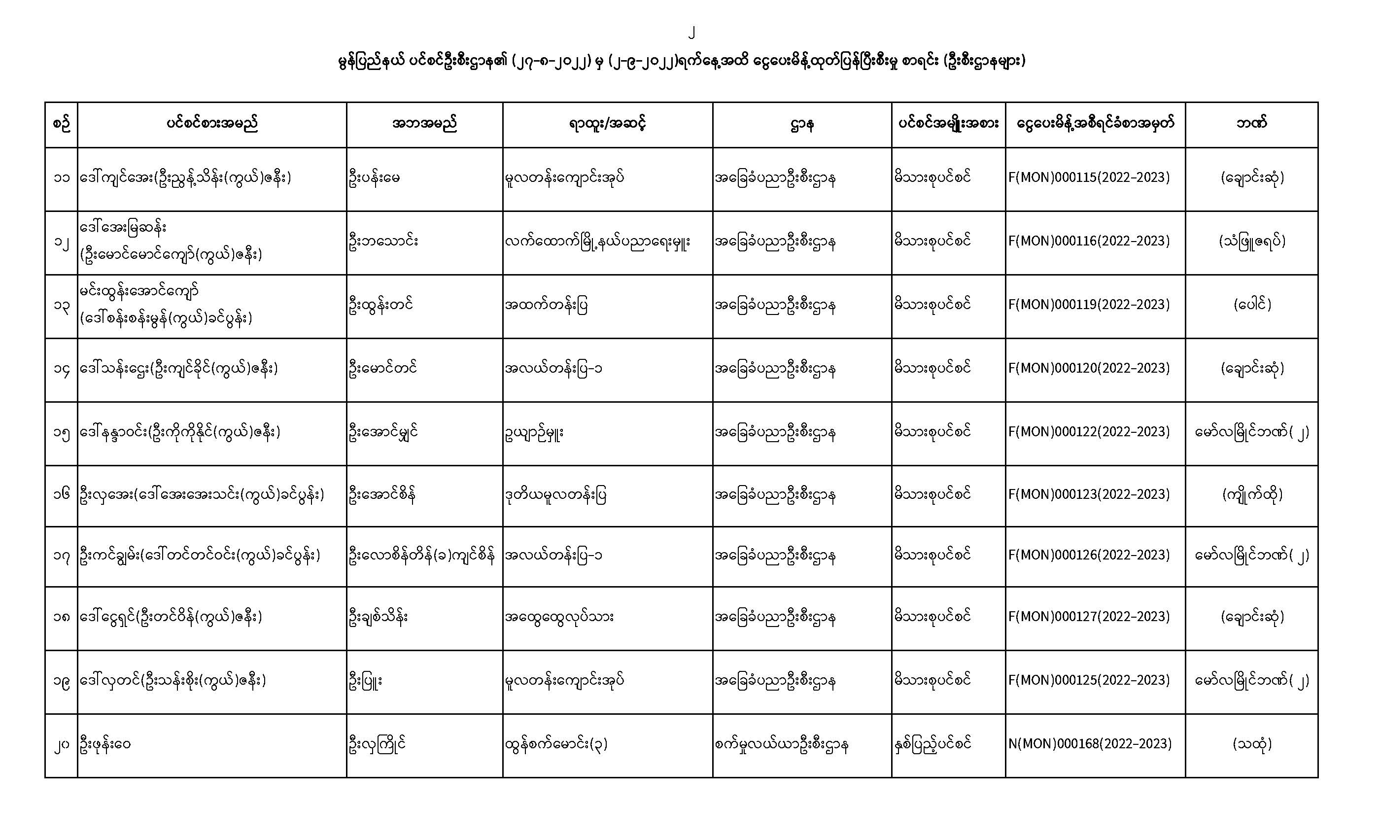 ပင်စင်ဦးစီးဌာန၊ မွန်ပြည်နယ်ဦးစီးမှူးရုံး၏ ငွေပေးမိန့်ထုတ်ပြန်မှုစာရင်း (၂၇-၈-၂၀၂၂ မှ ၂-၉-၂၀၂၂) pension_editor Wed, 09/07/2022 - 12:25