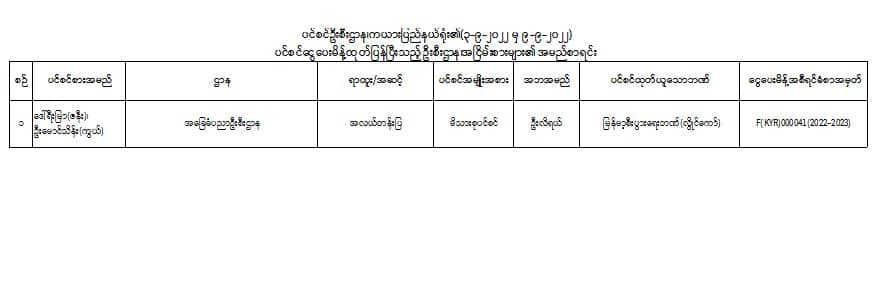 ပင်စင်ဦးစီးဌာန၊ ကယားပြည်နယ်ဦးစီးမှူးရုံး၏ ငွေပေးမိန့်ထုတ်ပြန်မှုစာရင်း (၃-၉-၂၀၂၂ မှ ၉-၉-၂၀၂၂) pension_editor Fri, 09/09/2022 - 16:15