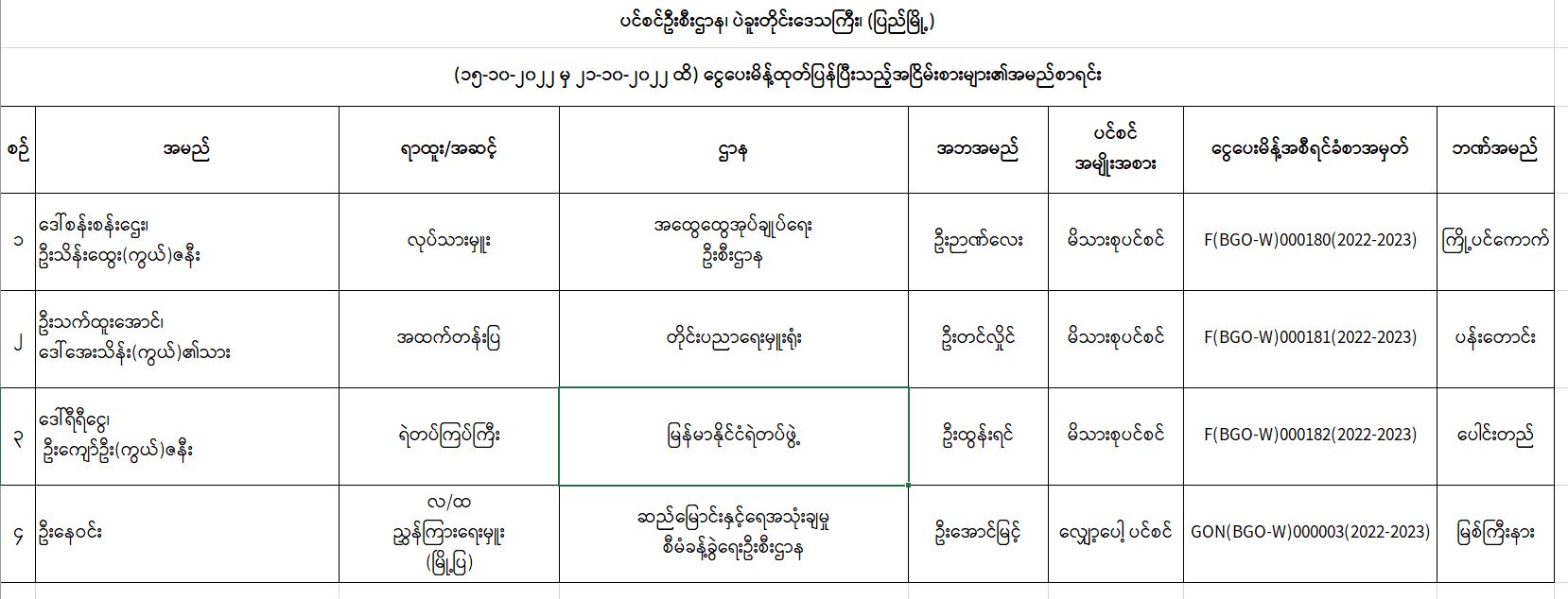 ပင်စင်ဦးစီးဌာန၊ ပဲခူးတိုင်းရုံးခွဲ(ပြည်မြို့)၏ ငွေပေးမိန့်ထုတ်ပြန်မှုစာရင်း (၁၅-၁၀-၂၀၂၂ မှ ၂၁-၁၀-၂၀၂၂) pension_editor Thu, 10/27/2022 - 11:27