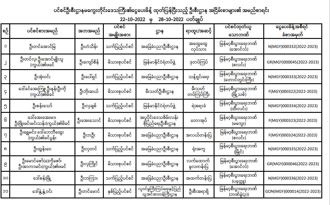 ပင်စင်ဦးစီးဌာန၊ မကွေးတိုင်းဒေသကြီးဦးစီးမှူးရုံး၏ ငွေပေးမိန့်ထုတ်ပြန်မှုစာရင်း (၂၂-၁၀-၂၀၂၂ မှ ၂၈-၁၀-၂၀၂၂)