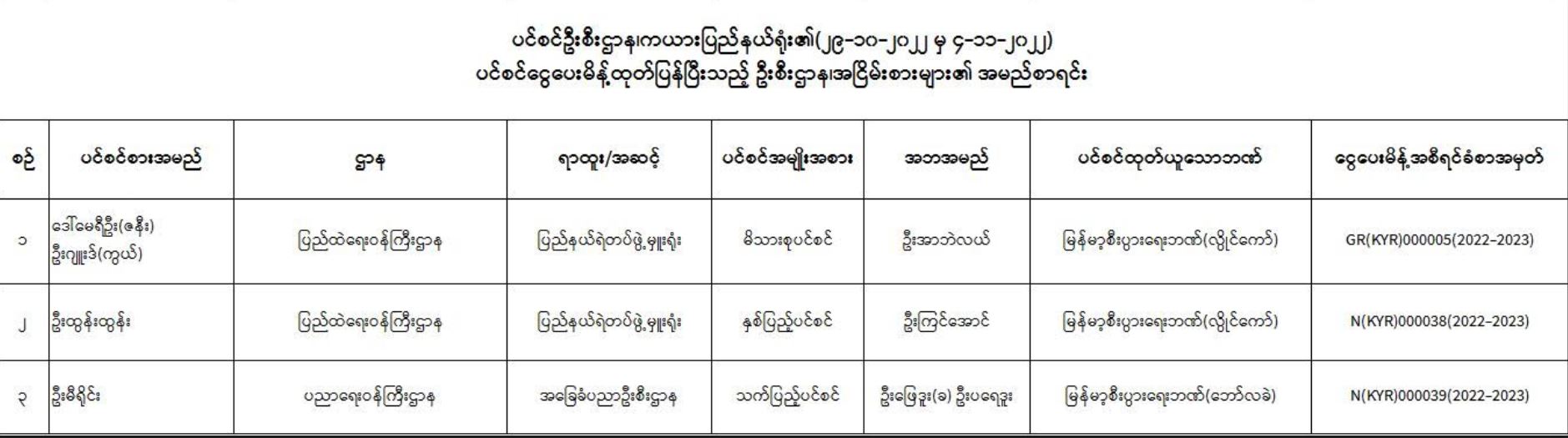 ပင်စင်ဦးစီးဌာန၊ ကယားပြည်နယ်ဦးစီးမှူးရုံး၏ ငွေပေးမိန့်ထုတ်ပြန်မှုစာရင်း (၂၉-၁၀-၂၀၂၂ မှ ၄-၁၁-၂၀၂၂) pension_editor Fri, 11/04/2022 - 14:08