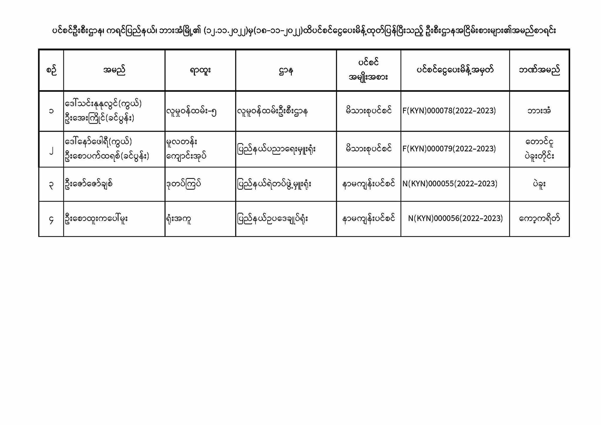 ပင်စင်ဦးစီးဌာန၊ကရင်ပြည်နယ်၏ငွေပေးမိန့်ထုတ်ပြန်မှုစာရင်း(၁၂-၁၁-၂၀၂၂ မှ ၁၈-၁၁-၂၀၂၂) pension_editor Wed, 11/16/2022 - 15:52