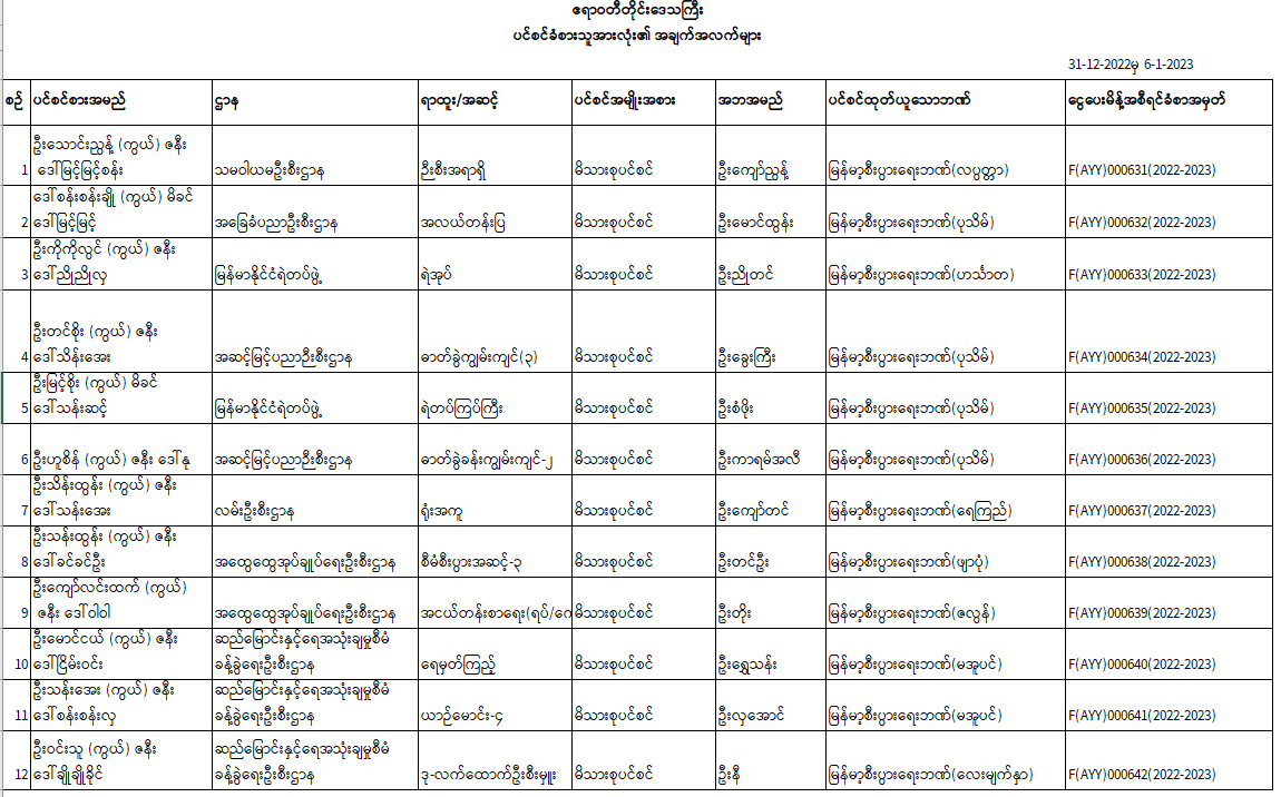 ပင်စင်ဦးစီးဌာန၊ ဧရာဝတီတိုင်းဒေသကြီးဦးစီးမှူးရုံး၏ ငွေပေးမိန့်ထုတ်ပြန်မှုစာရင်း (၂၄-၁၂-၂၀၂၂ မှ ၆-၁-၂၀၂၃) pension_editor Mon, 01/09/2023 - 10:11