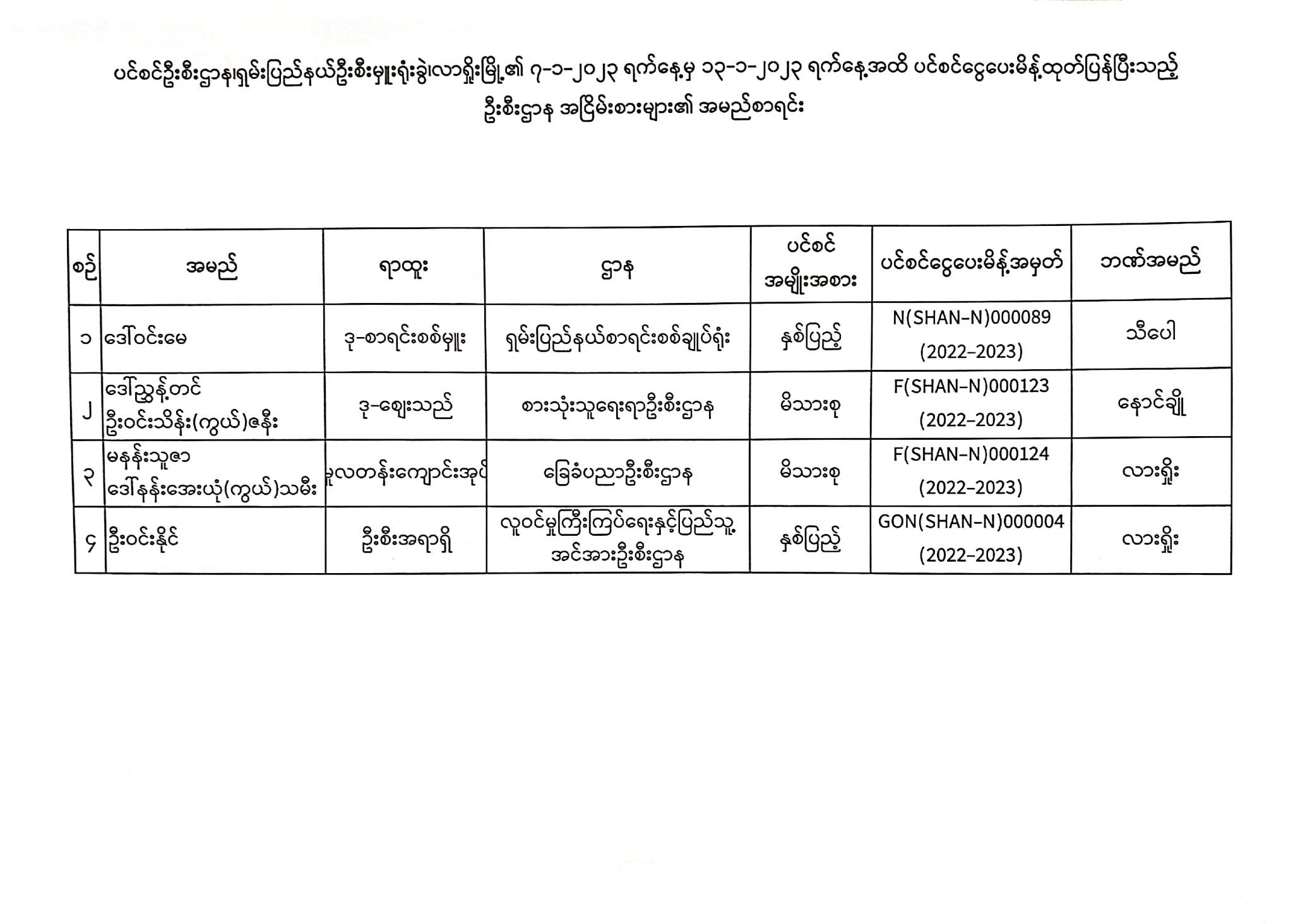 ပင်စင်ဦးစီးဌာန၊ရှမ်းပြည်နယ်(လားရှိုးမြို့)၏ငွေပေးမိန့်ထုတ်ပြန်မှုစာရင်း(၇-၁-၂၀၂၃ မှ ၁၃-၁-၂၀၂၃) pension_editor Thu, 01/12/2023 - 12:33