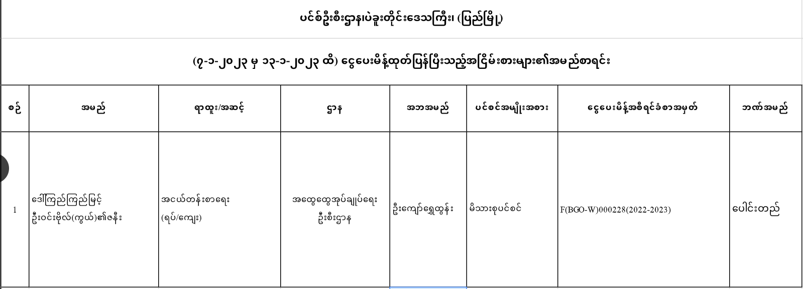 ပင်စင်ဦးစီးဌာန၊ပဲခူးတိုင်းဒေသကြီး(ပြည်)မြို့၏ငွေပေးမိန့်ထုတ်ပြန်မှုစာရင်း(၇-၁-၂၀၂၃ မှ ၁၃-၁-၂၀၂၃) pension_editor Mon, 01/23/2023 - 13:58