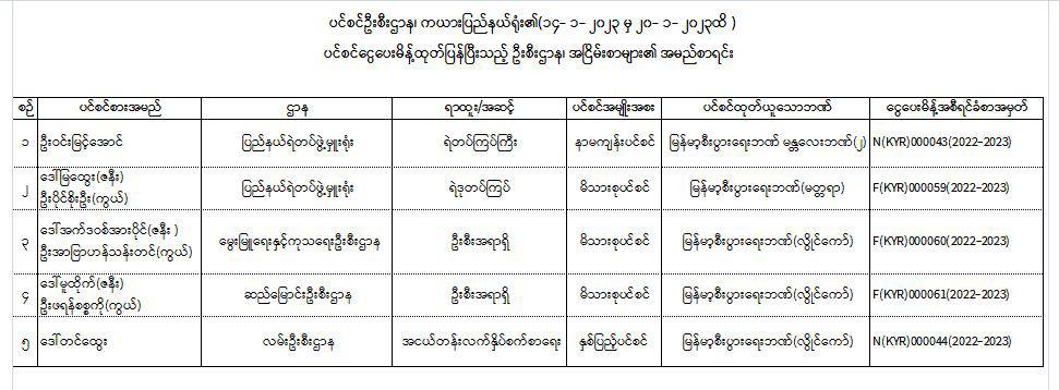 ပင်စင်ဦးစီးဌာန၊ကယားပြည်နယ်၏ငွေပေးမိန့်ထုတ်ပြန်မှုစာရင်း(၁၄-၁-၂၀၂၃ မှ ၂၀-၁-၂၀၂၃) pension_editor Thu, 01/26/2023 - 13:46