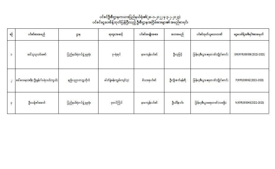 ပင်စင်ဦးစီးဌာန၊ကယားပြည်နယ်၏ငွေပေးမိန့်ထုတ်ပြန်မှုစာရင်း(၂၈-၁-၂၀၂၃ မှ ၃-၁-၂၀၂၃) pension_editor Thu, 02/02/2023 - 15:15