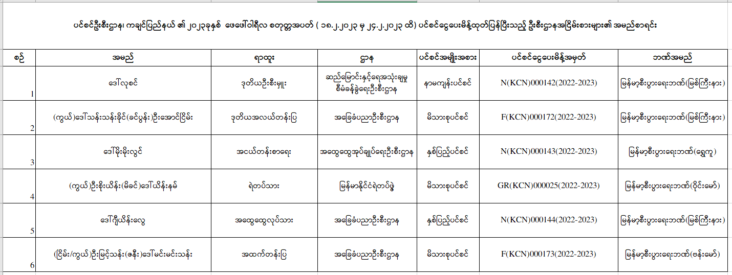 ပင်စင်ဦးစီးဌာန၊ ကချင်ပြည်နယ်၏ ငွေပေးမိန့်ထုတ်ပြန်မှုစာရင်း (၁၈-၂-၂၀၂၃ မှ ၂၄-၂-၂၀၂၃)