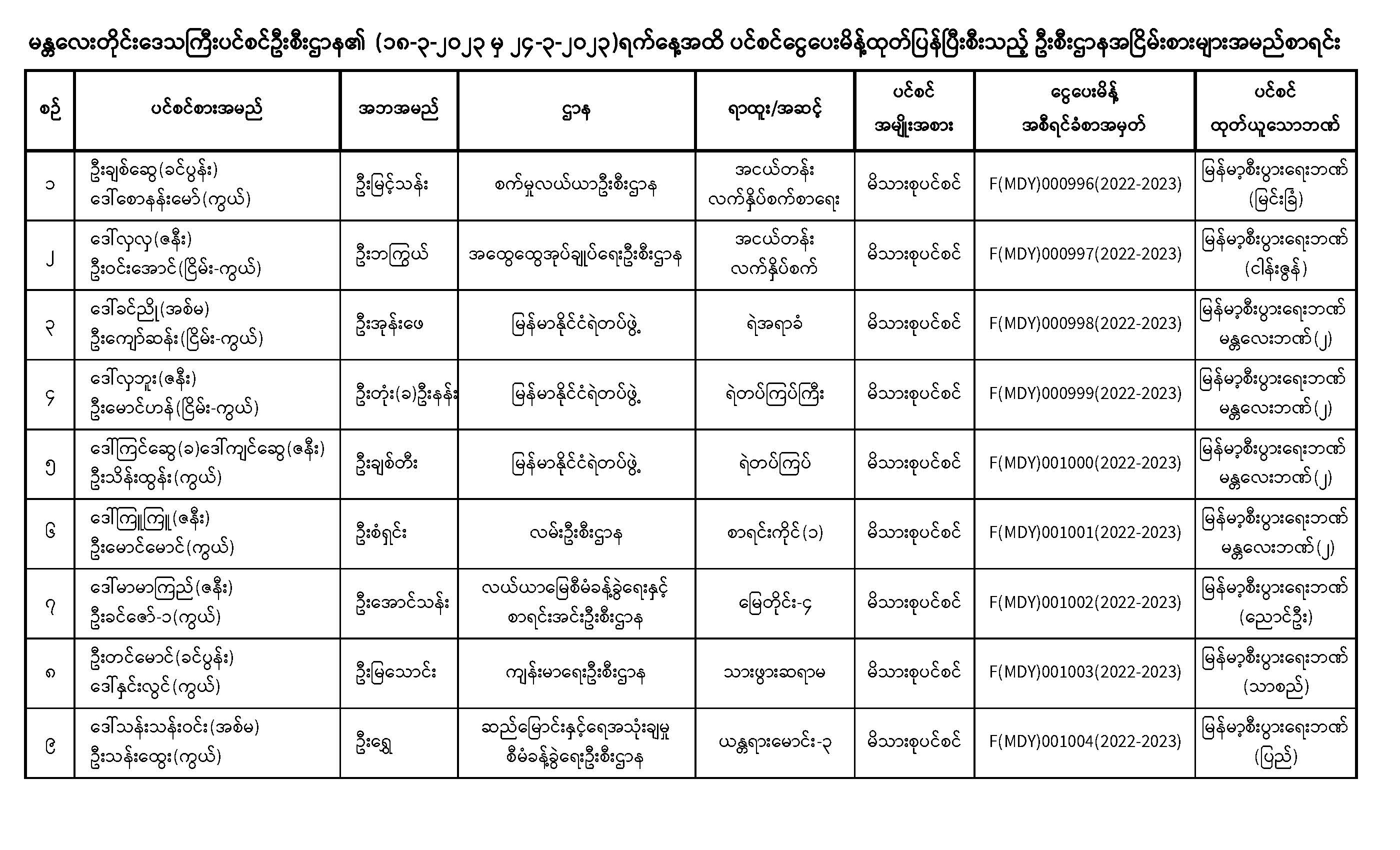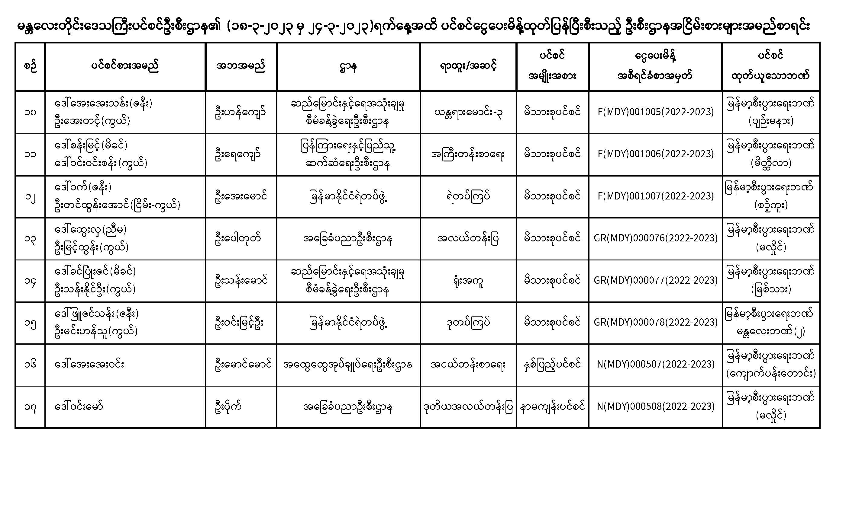ပင်စင်ဦးစီးဌာန၊ မန္တလေးတိုင်းဒေသကြီးဦးစီးမှူးရုံး၏ ငွေပေးမိန့်ထုတ်ပြန်မှုစာရင်း (၁၈-၃-၂၀၂၃ မှ ၂၄-၃-၂၀၂၃)