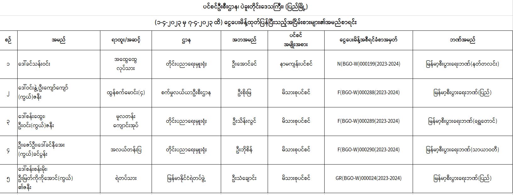 ပင်စင်ဦးစီးဌာန၊ ပဲခူးတိုင်းရုံးခွဲ(ပြည်မြို့)၏ ငွေပေးမိန့်ထုတ်ပြန်မှုစာရင်း (၁-၄-၂၀၂၃ မှ ၇-၄-၂၀၂၃)