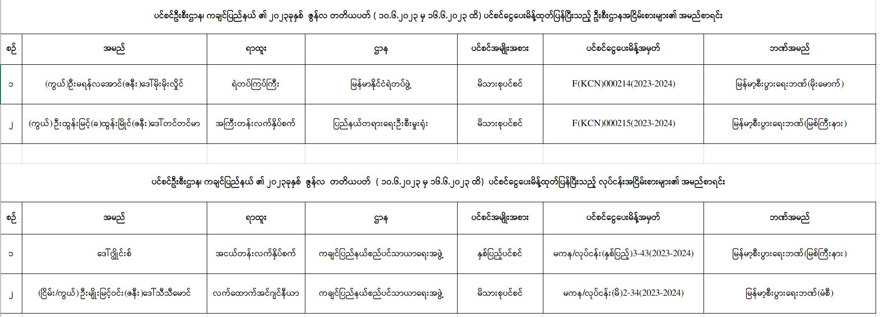 ပင်စင်ဦးစီးဌာန၊ ကချင်ပြည်နယ်ဦးစီးမှူးရုံး၏ ငွေပေးမိန့်ထုတ်ပြန်မှုစာရင်း ငွေပေးမိန့်ထုတ်ပြန်မှု စာရင်း ( ၁၀-၆-၂၀၂၃ မှ ၁၆-၆-၂၀၂၃ ထိ) pension_editor Fri, 06/16/2023 - 14:30